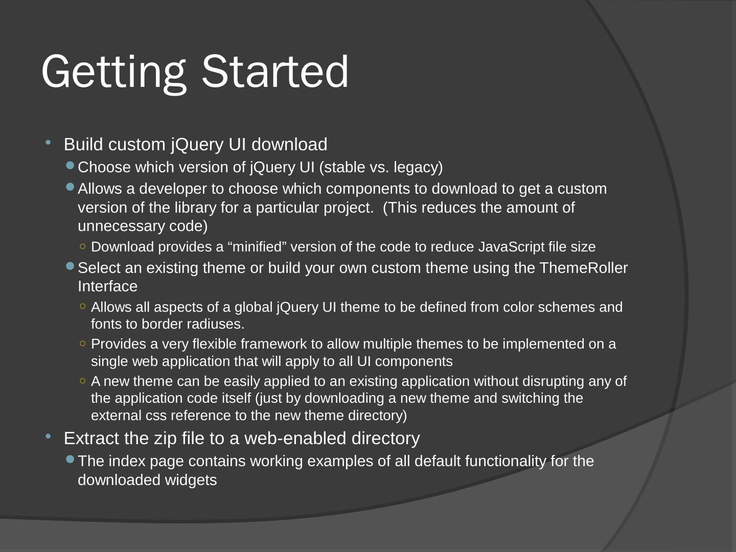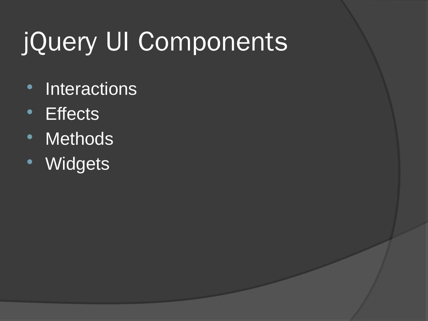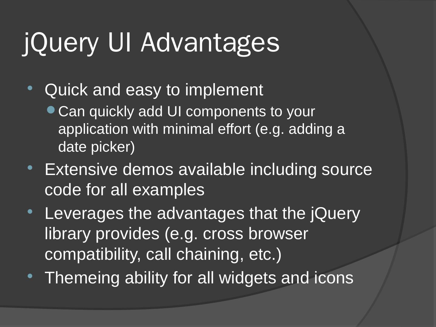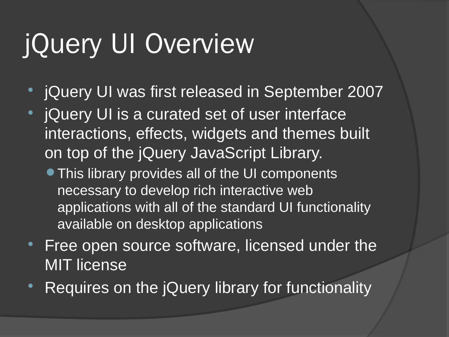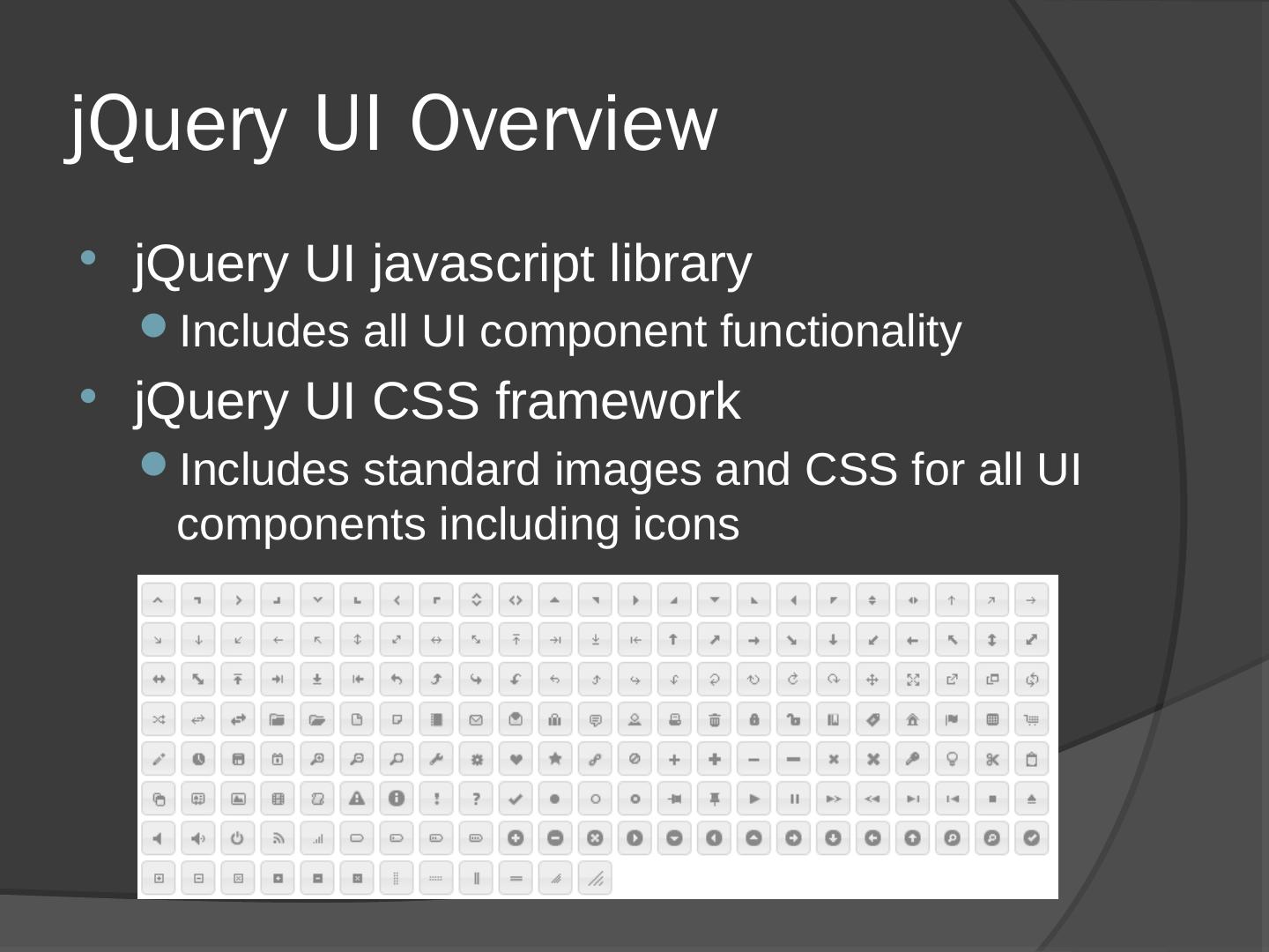 jQuery UI Overview. jQuery UI javascript library. Includes all UI component functionality. jQuery UI CSS framework. Includes standard images and CSS for all UI ...