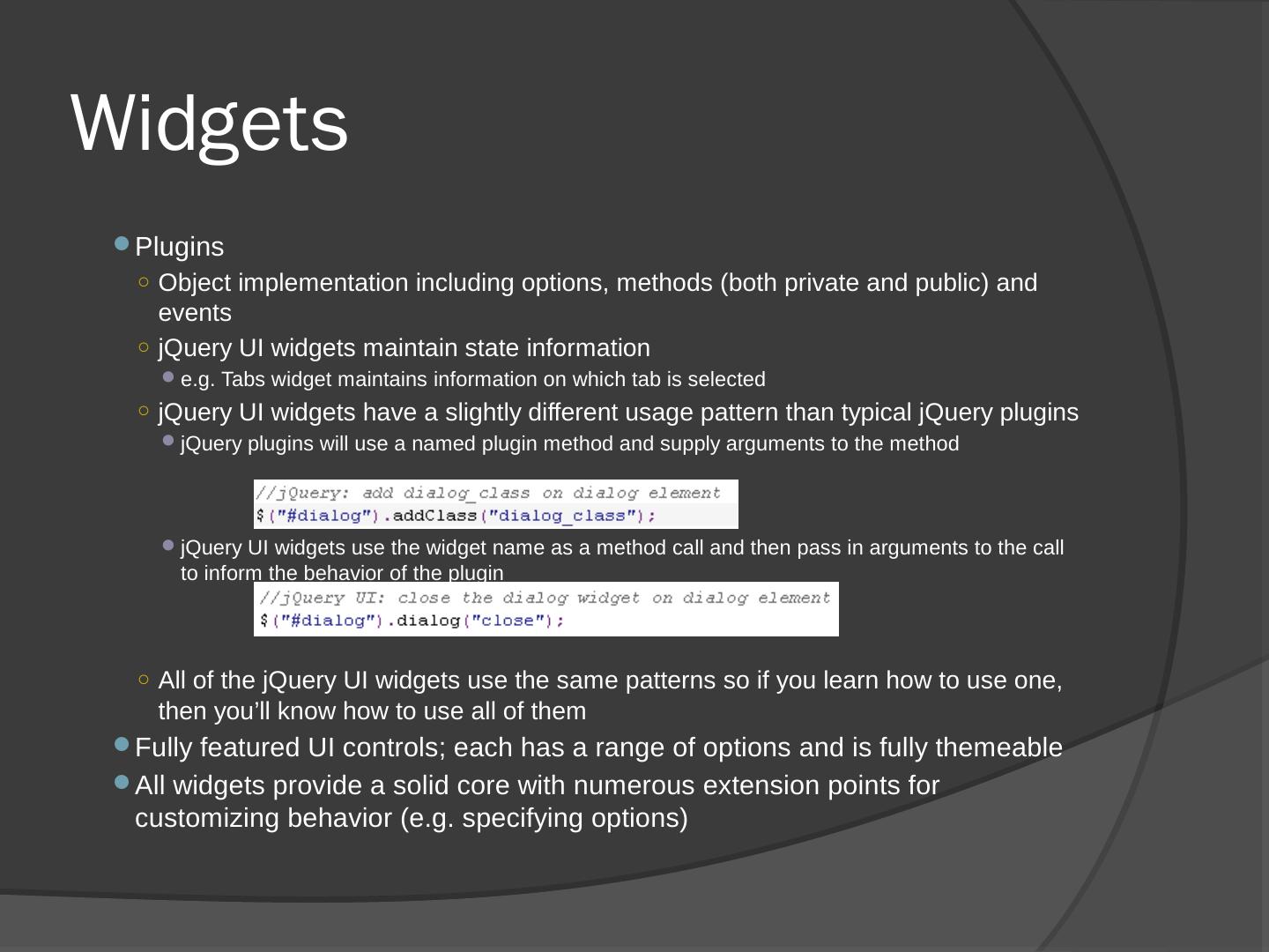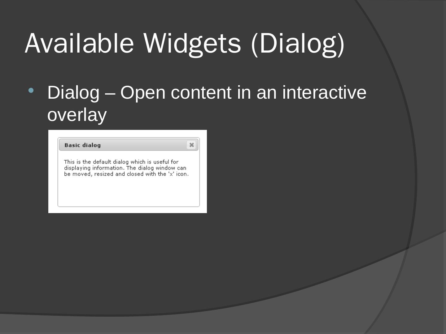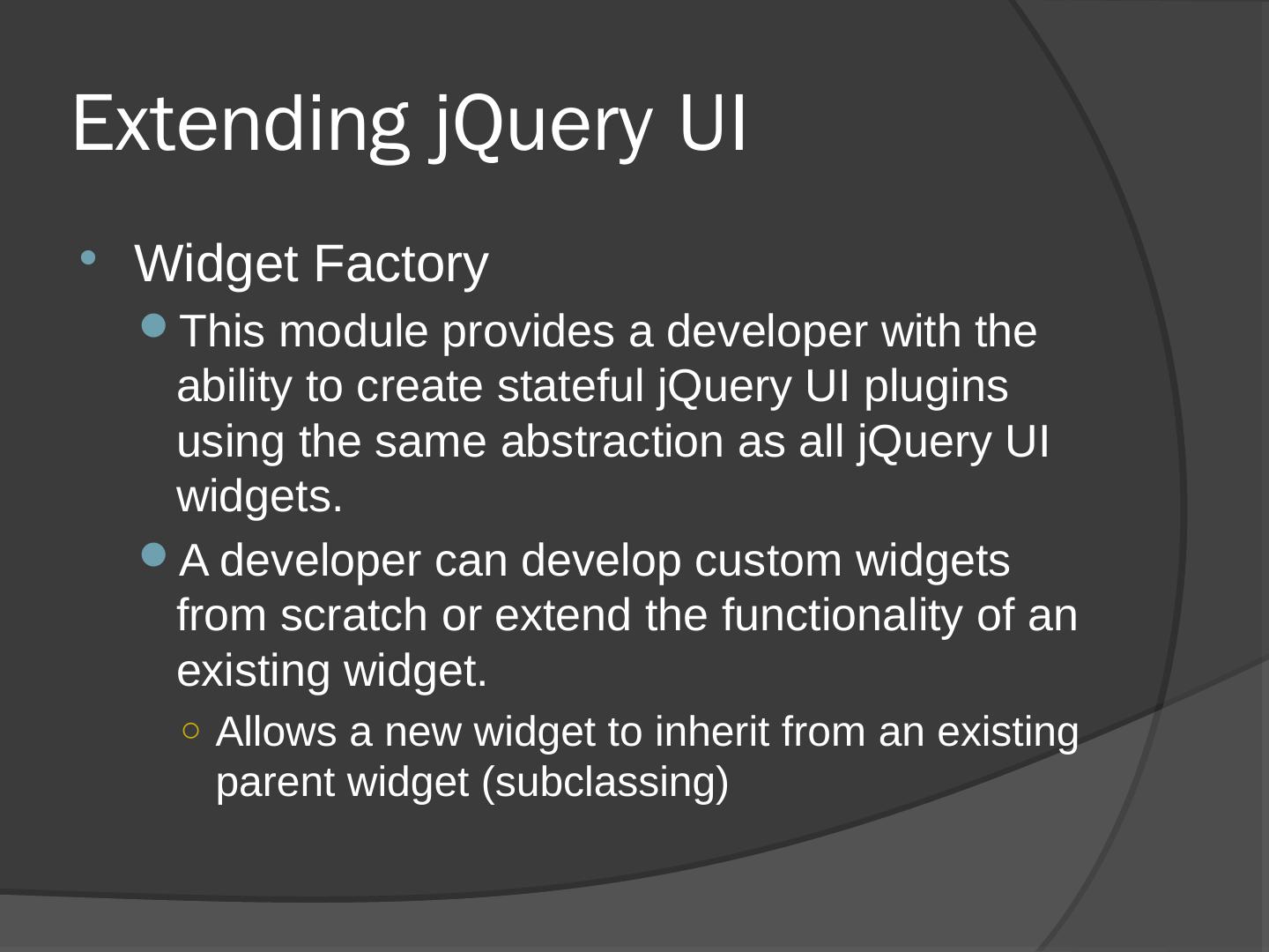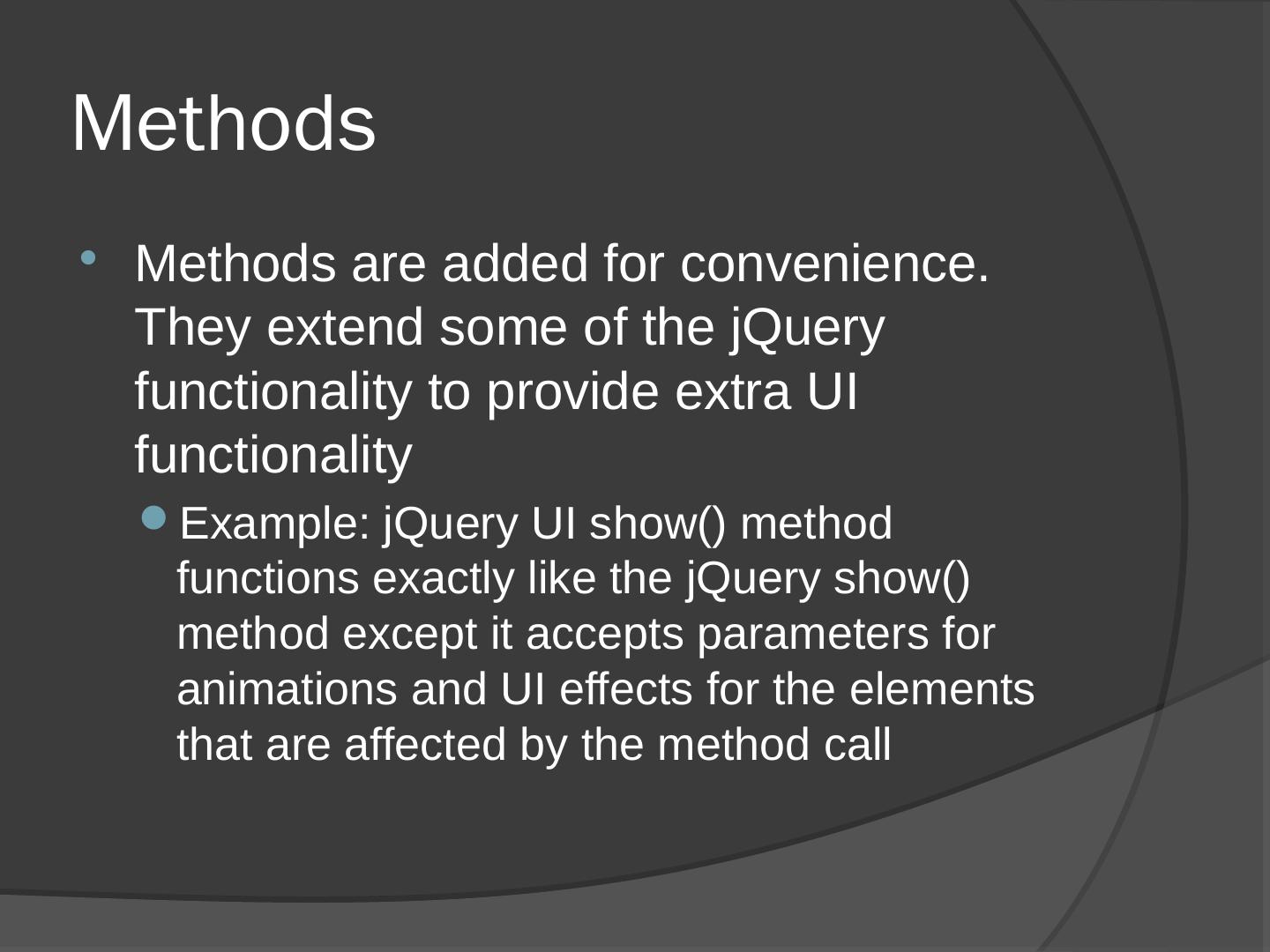 jQuery UI Overview. jQuery UI javascript library. Includes all UI component functionality. jQuery UI CSS framework. Includes standard images and CSS for all UI ...