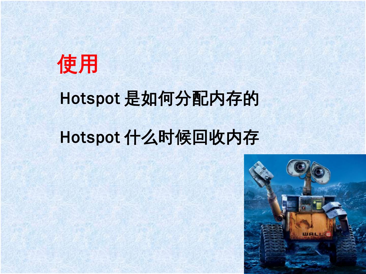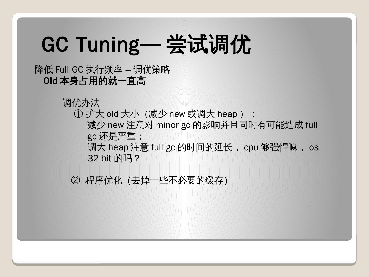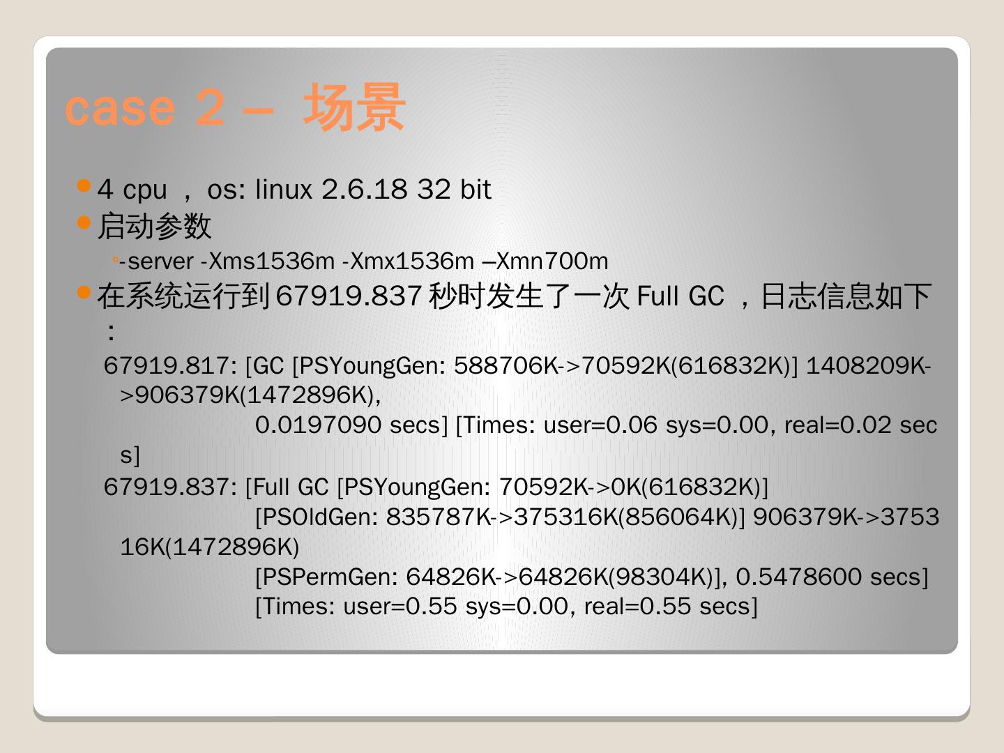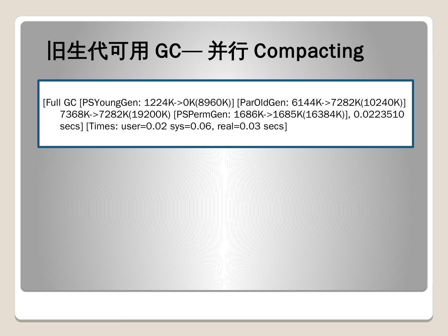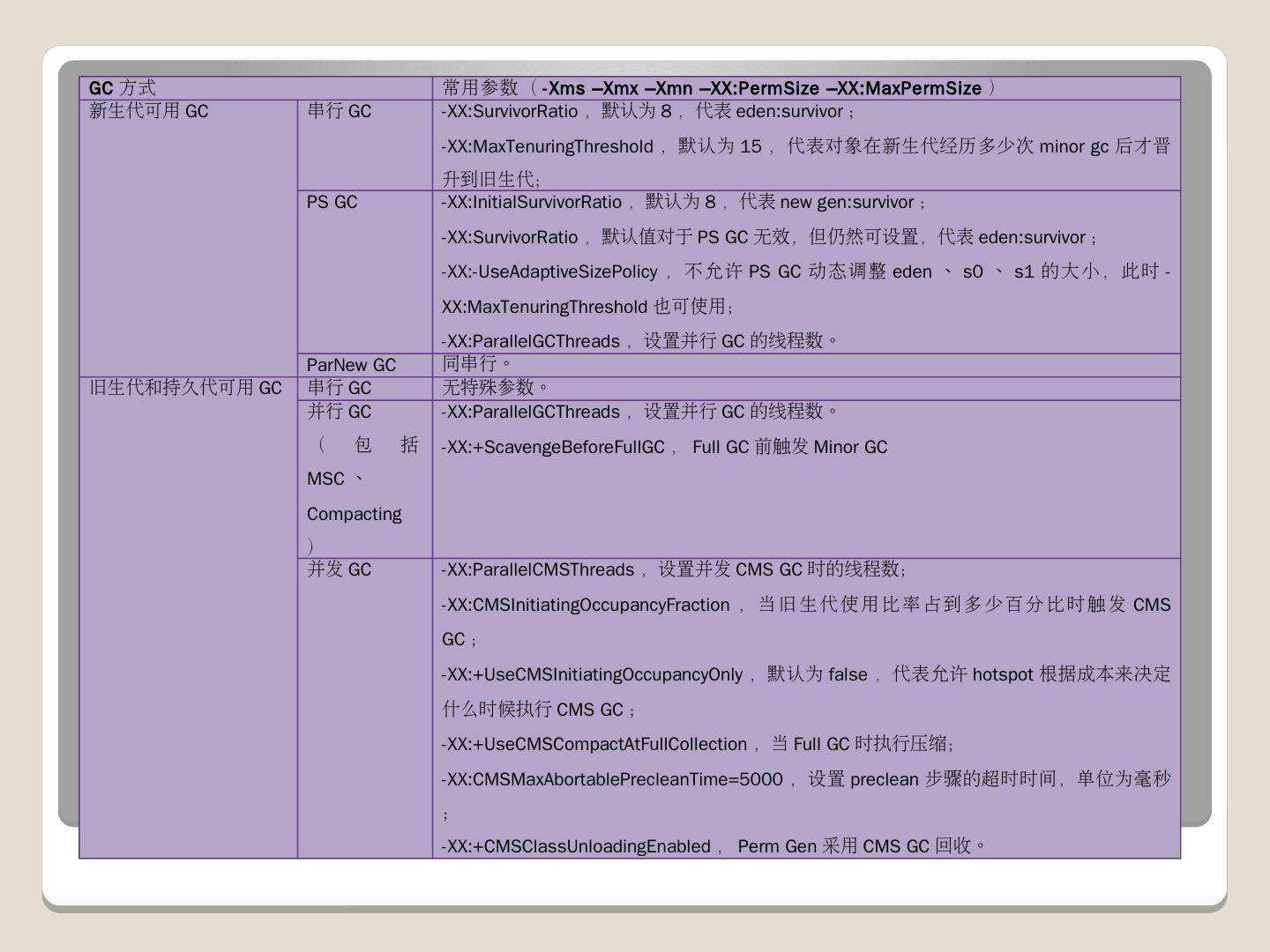 Java:自动内存管理. 为什么还需要 ... Sun Hotspot对JVM堆采用了分代的方式来管理,以提升GC的. 效率。 Eden. S0. S1 ..... 4 cpu,os: linux 2.6.18 32 bit; 启动参数.