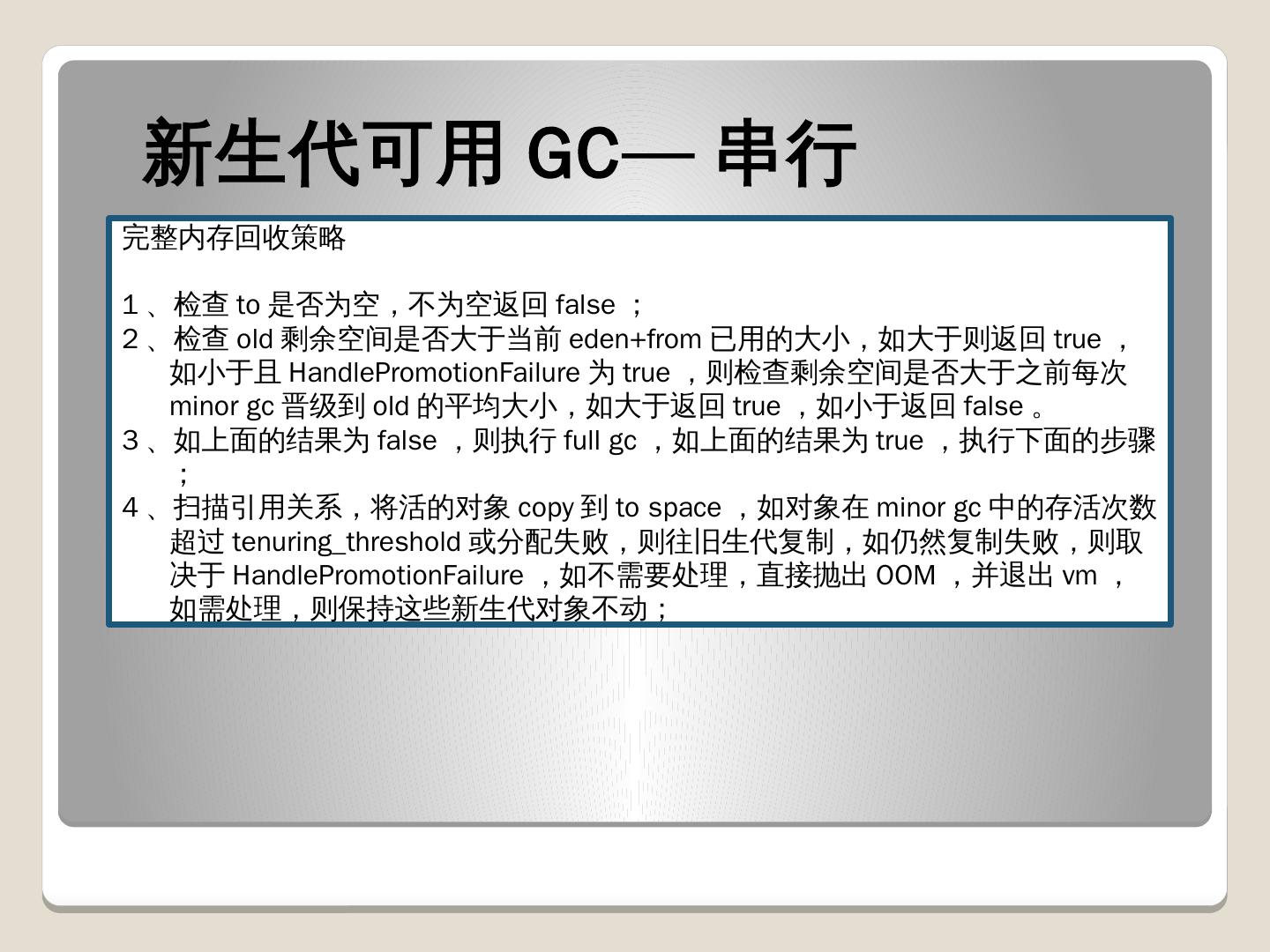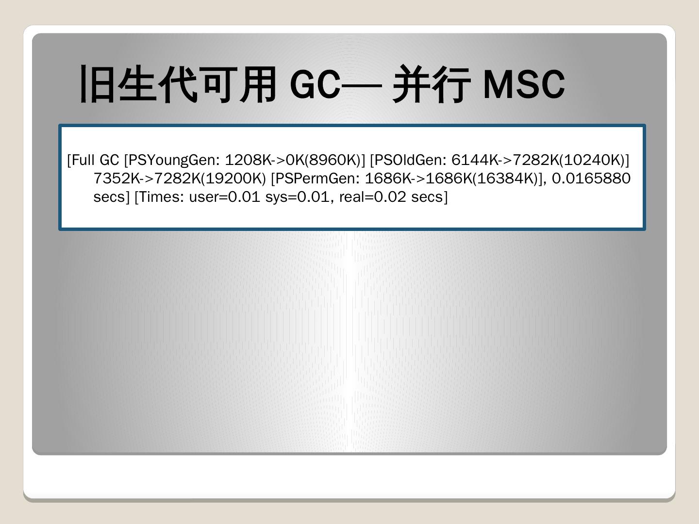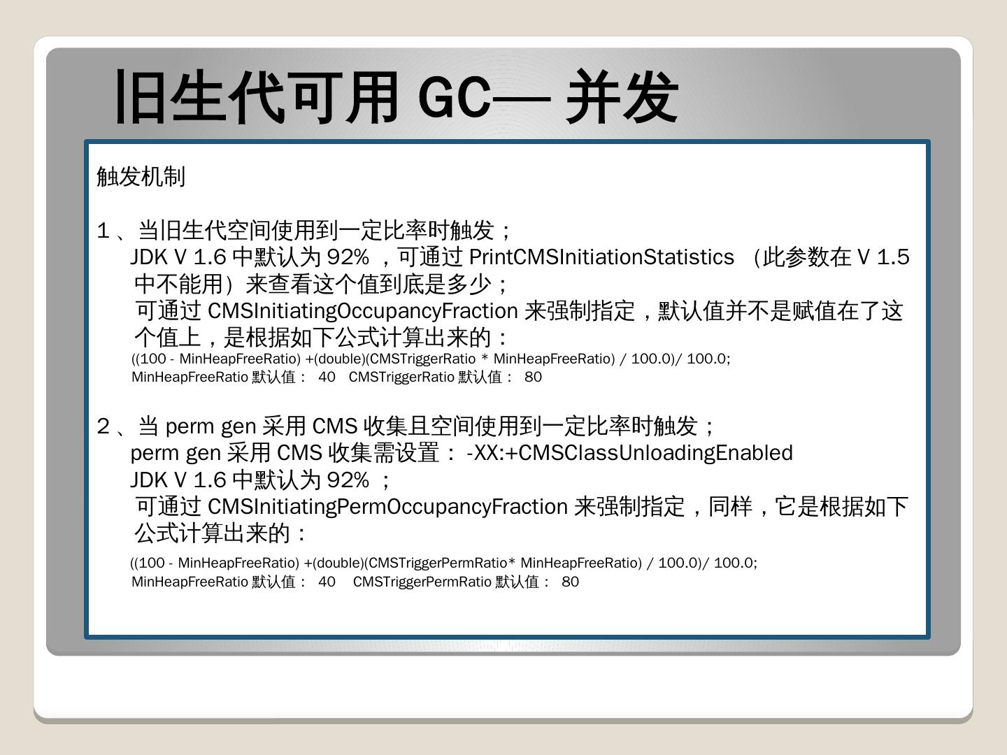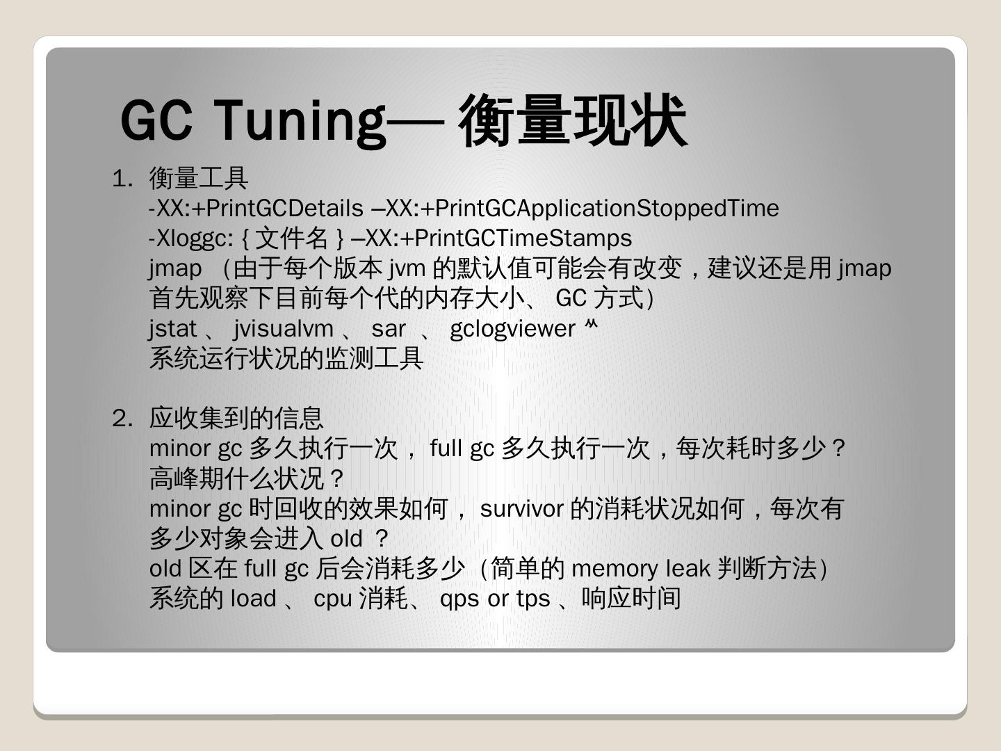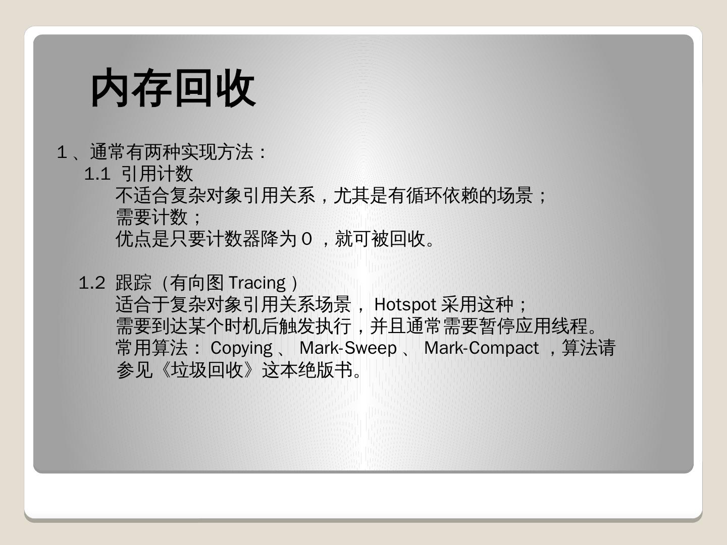 Java:自动内存管理. 为什么还需要 ... Sun Hotspot对JVM堆采用了分代的方式来管理,以提升GC的. 效率。 Eden. S0. S1 ..... 4 cpu,os: linux 2.6.18 32 bit; 启动参数.