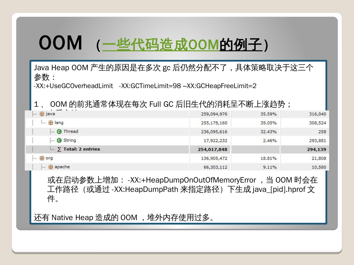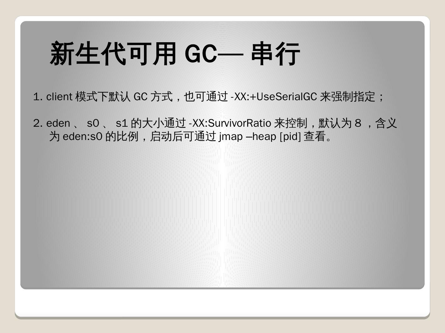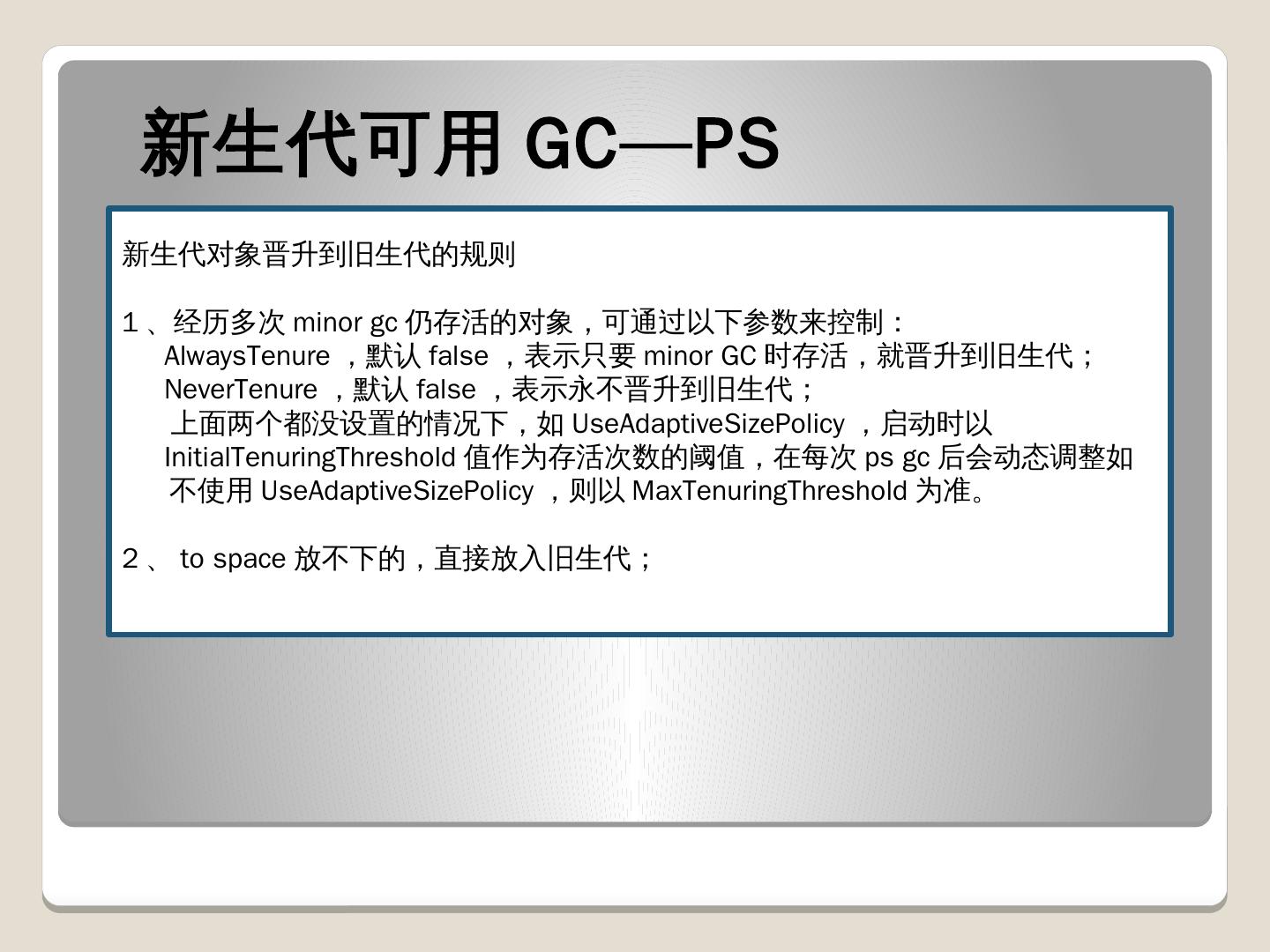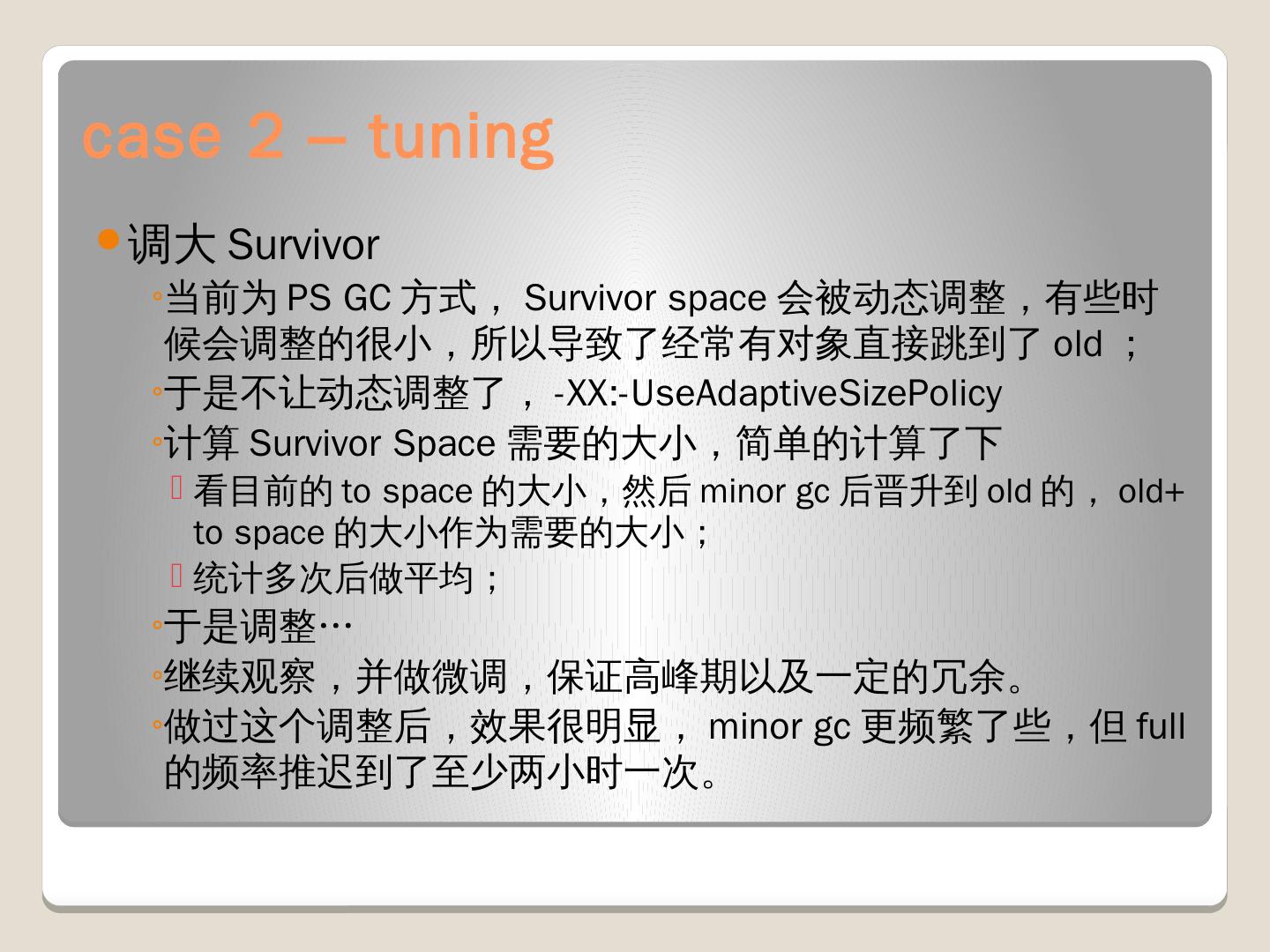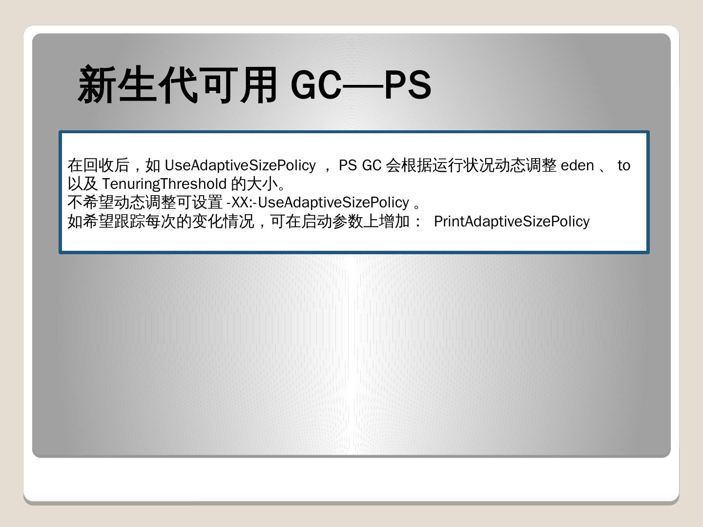 Java:自动内存管理. 为什么还需要 ... Sun Hotspot对JVM堆采用了分代的方式来管理,以提升GC的. 效率。 Eden. S0. S1 ..... 4 cpu,os: linux 2.6.18 32 bit; 启动参数.