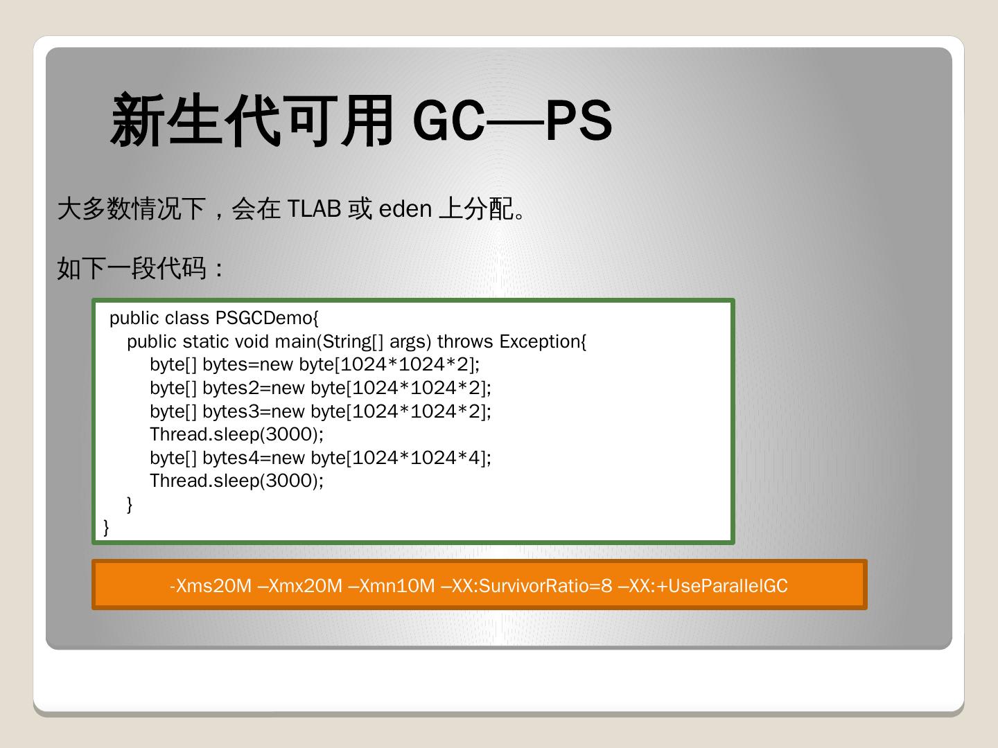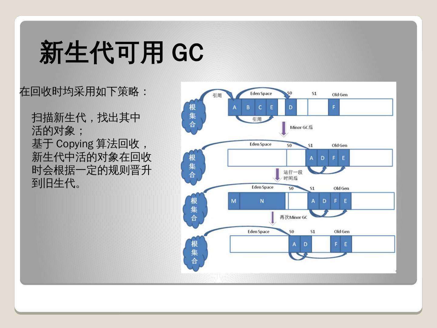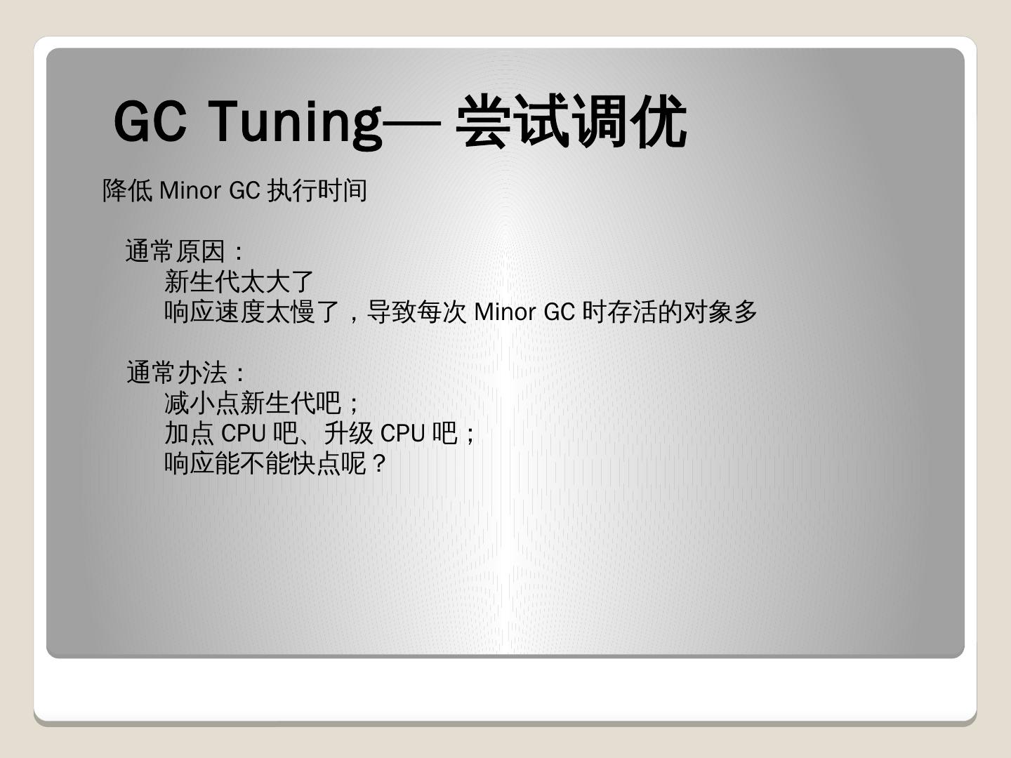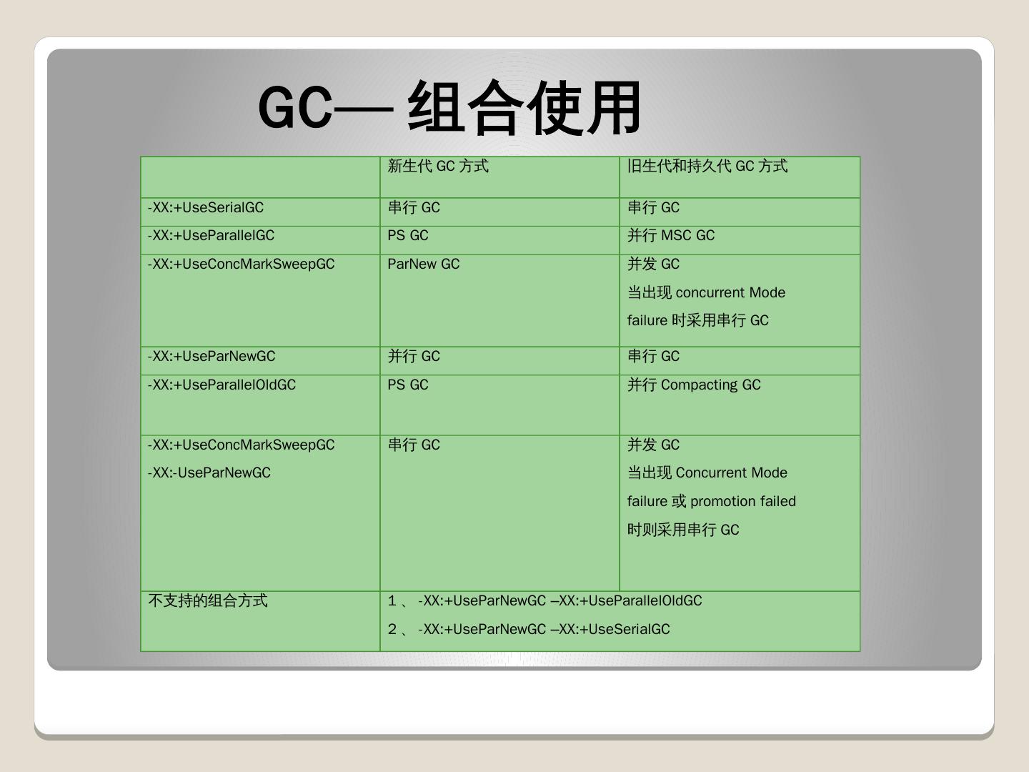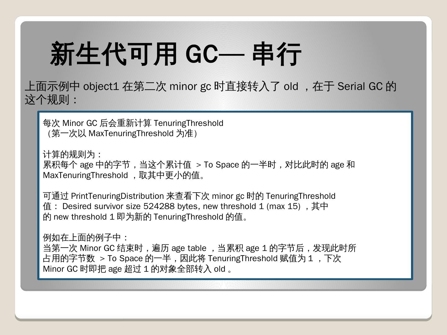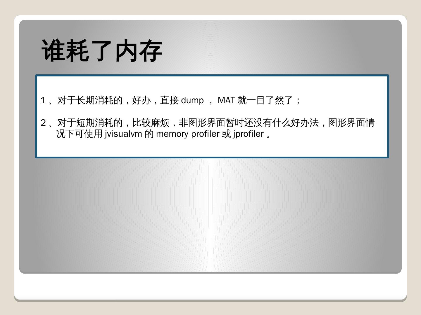 Java:自动内存管理. 为什么还需要 ... Sun Hotspot对JVM堆采用了分代的方式来管理,以提升GC的. 效率。 Eden. S0. S1 ..... 4 cpu,os: linux 2.6.18 32 bit; 启动参数.