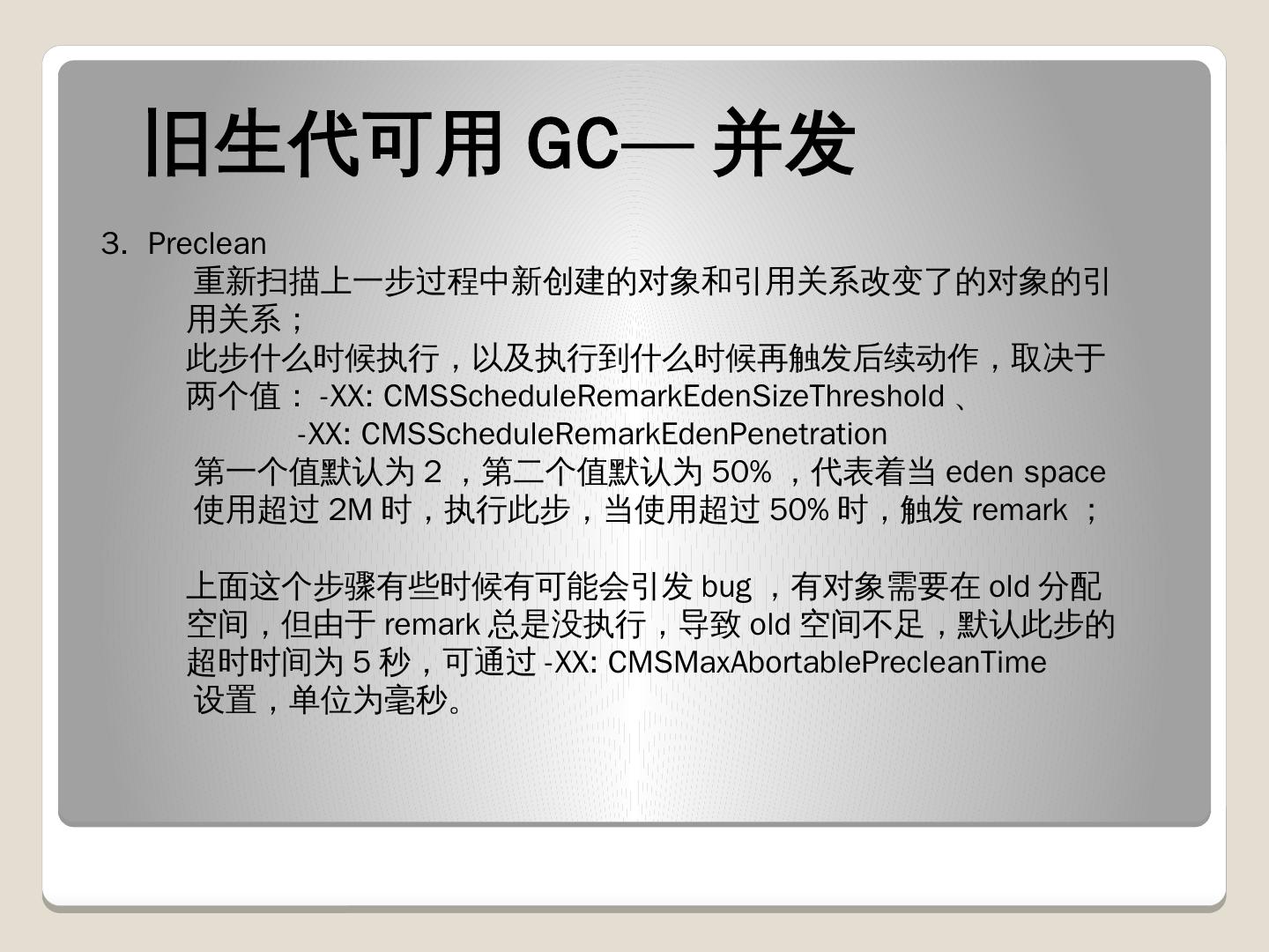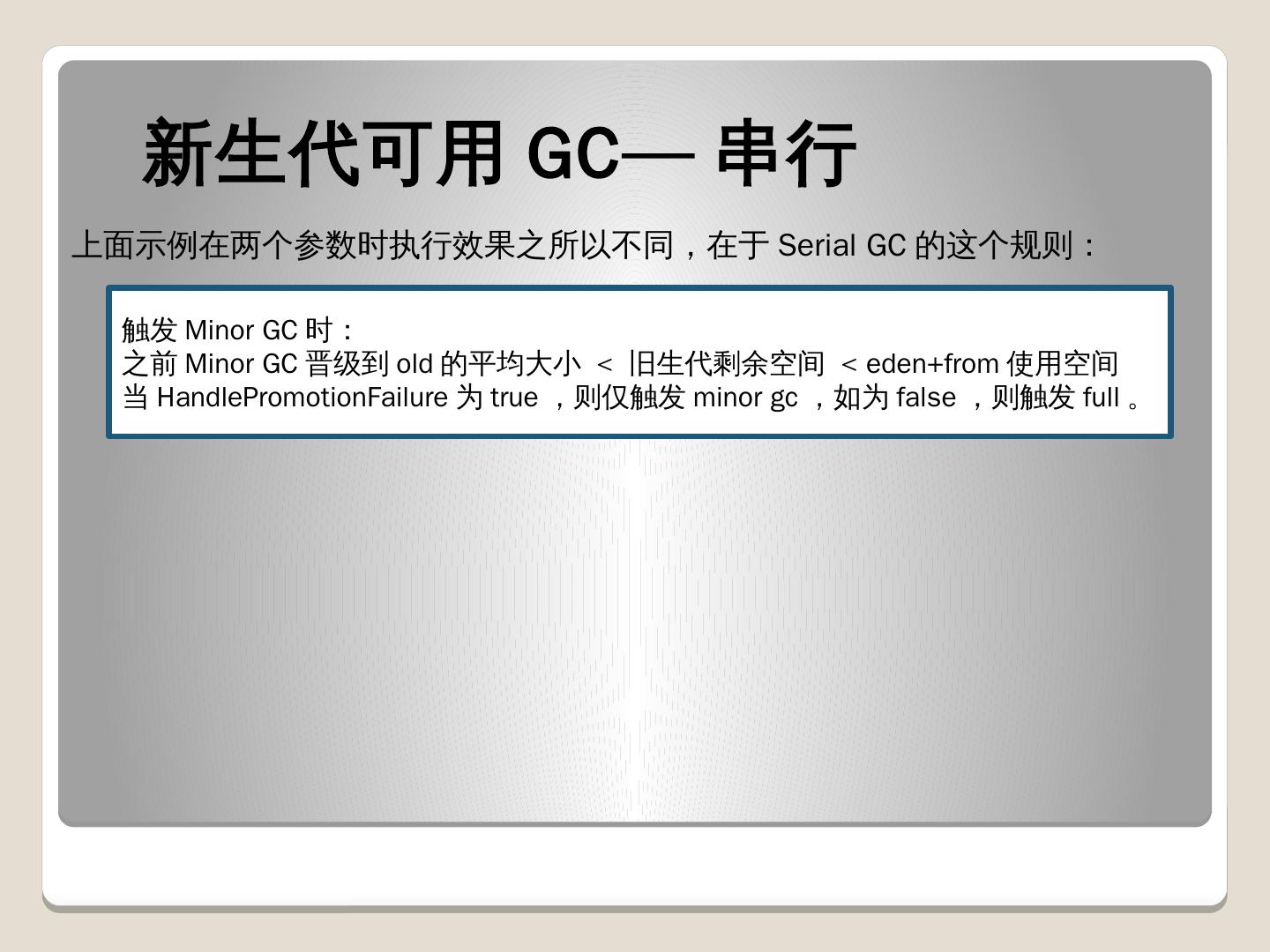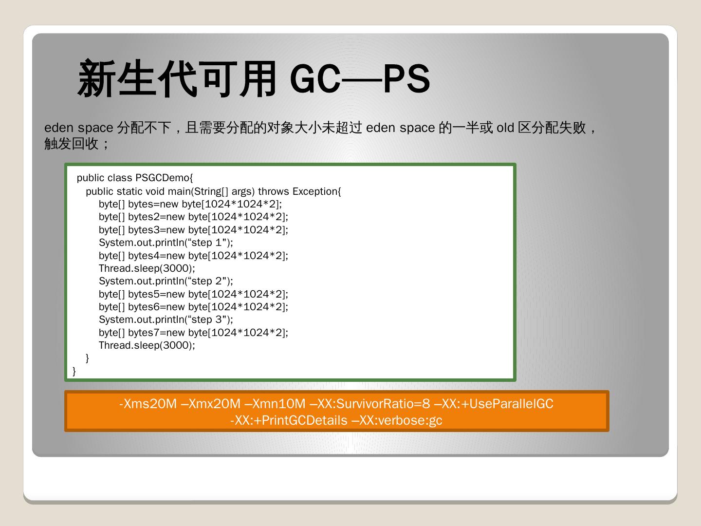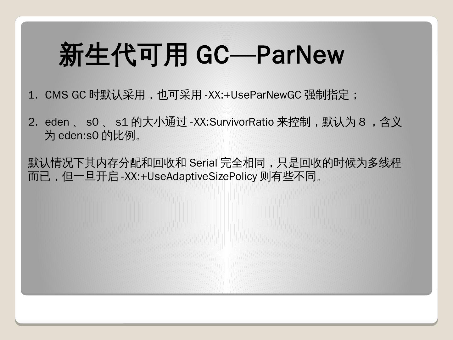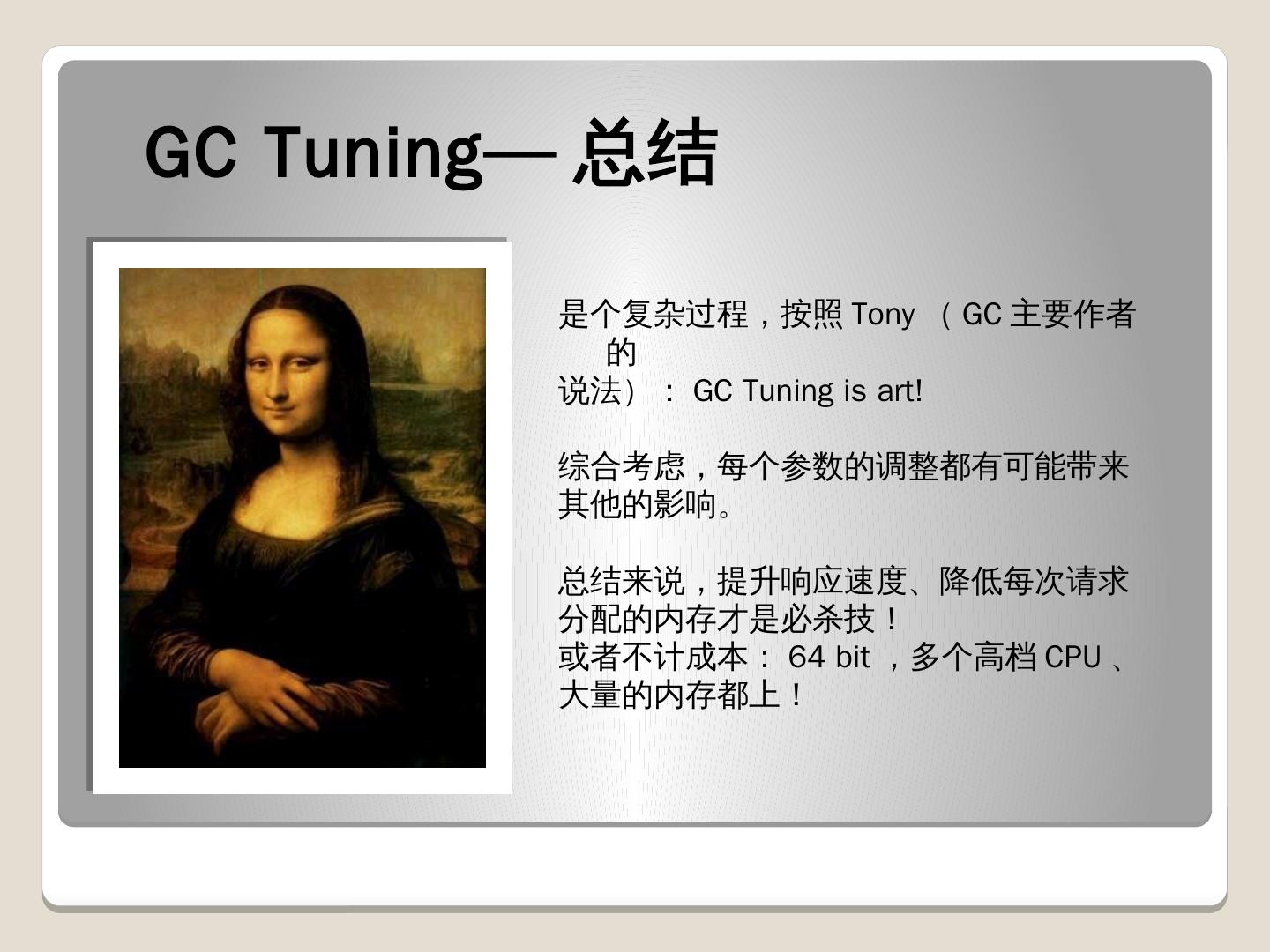 Java:自动内存管理. 为什么还需要 ... Sun Hotspot对JVM堆采用了分代的方式来管理,以提升GC的. 效率。 Eden. S0. S1 ..... 4 cpu,os: linux 2.6.18 32 bit; 启动参数.