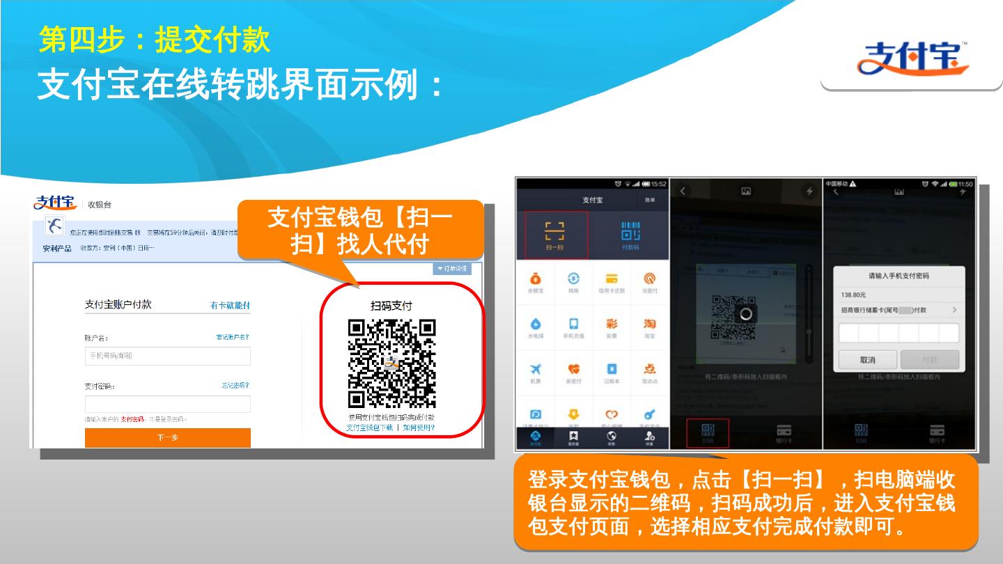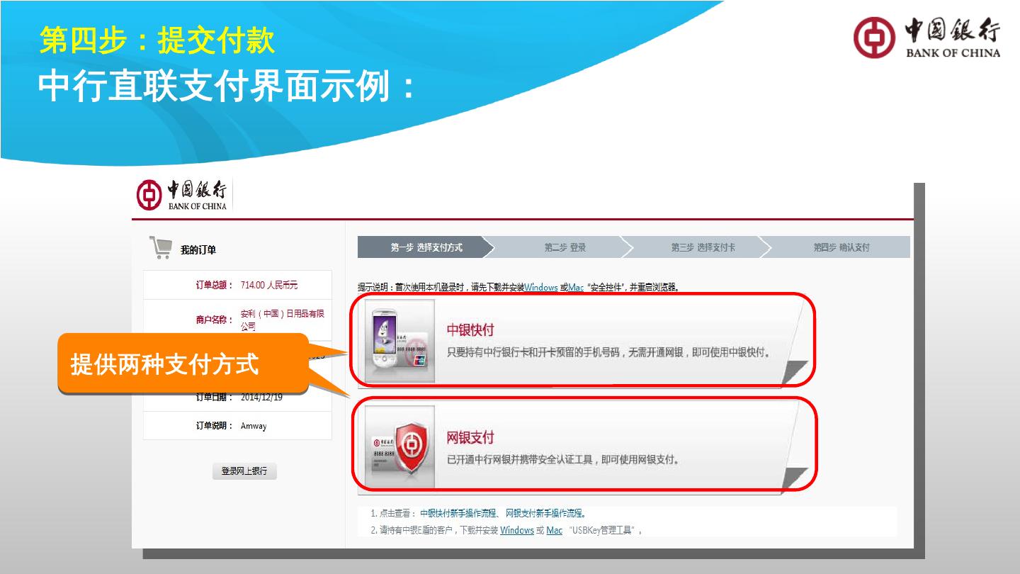 微信支付界面示例:. 第四步:提交付款. 中行直联支付界面示例:. 提供两种支付方式. 输入银行预留手机号、银行卡后六位. 核对支付信息,获取并输入手机动态密码, ...