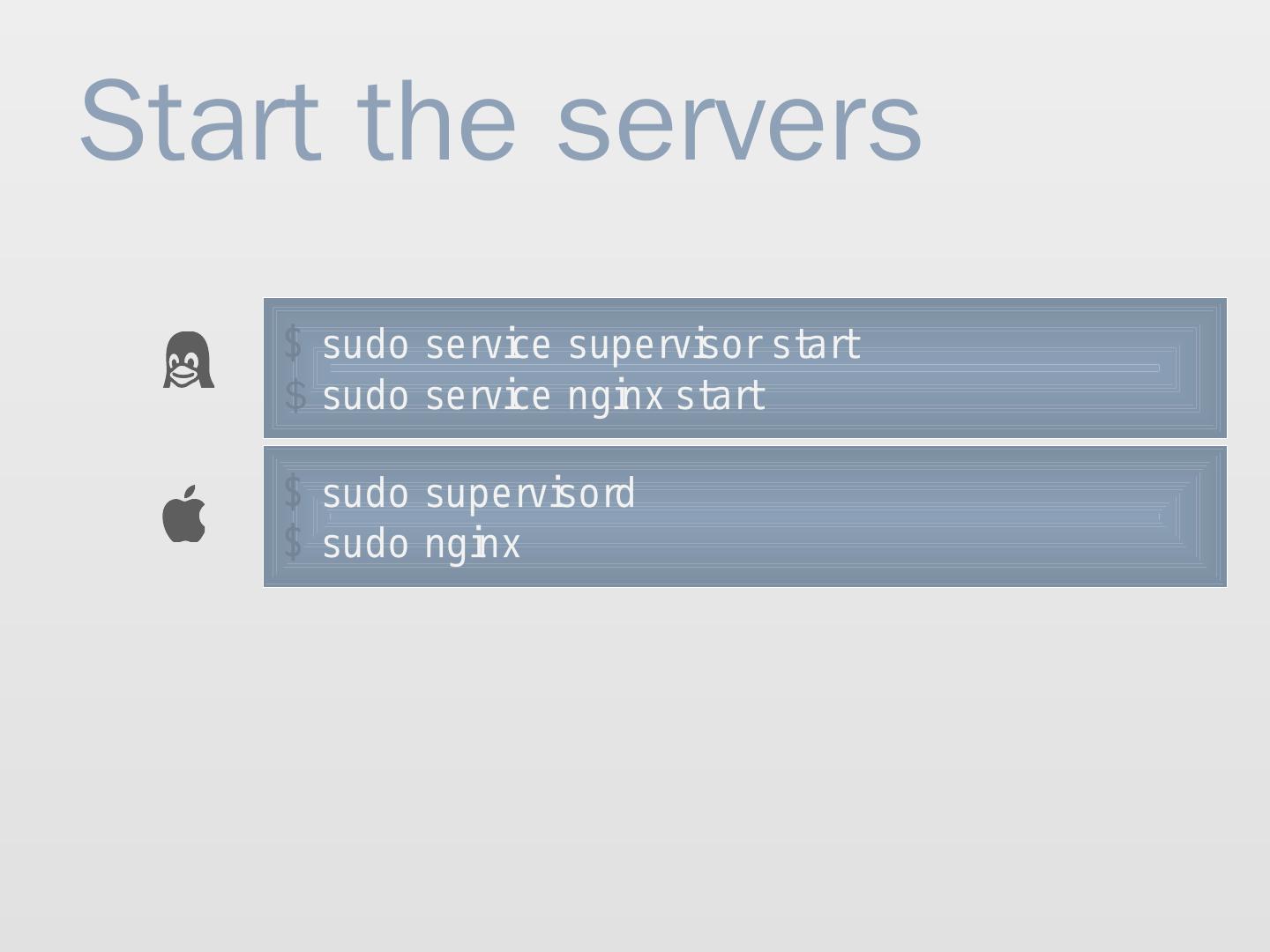 Apache? Nginx? We use uwsgi + supervisor + nginx. $ sudo easy_install supervisor uwsgi. $ sudo apt-get install nginx. $ sudo brew install nginx. configuration.