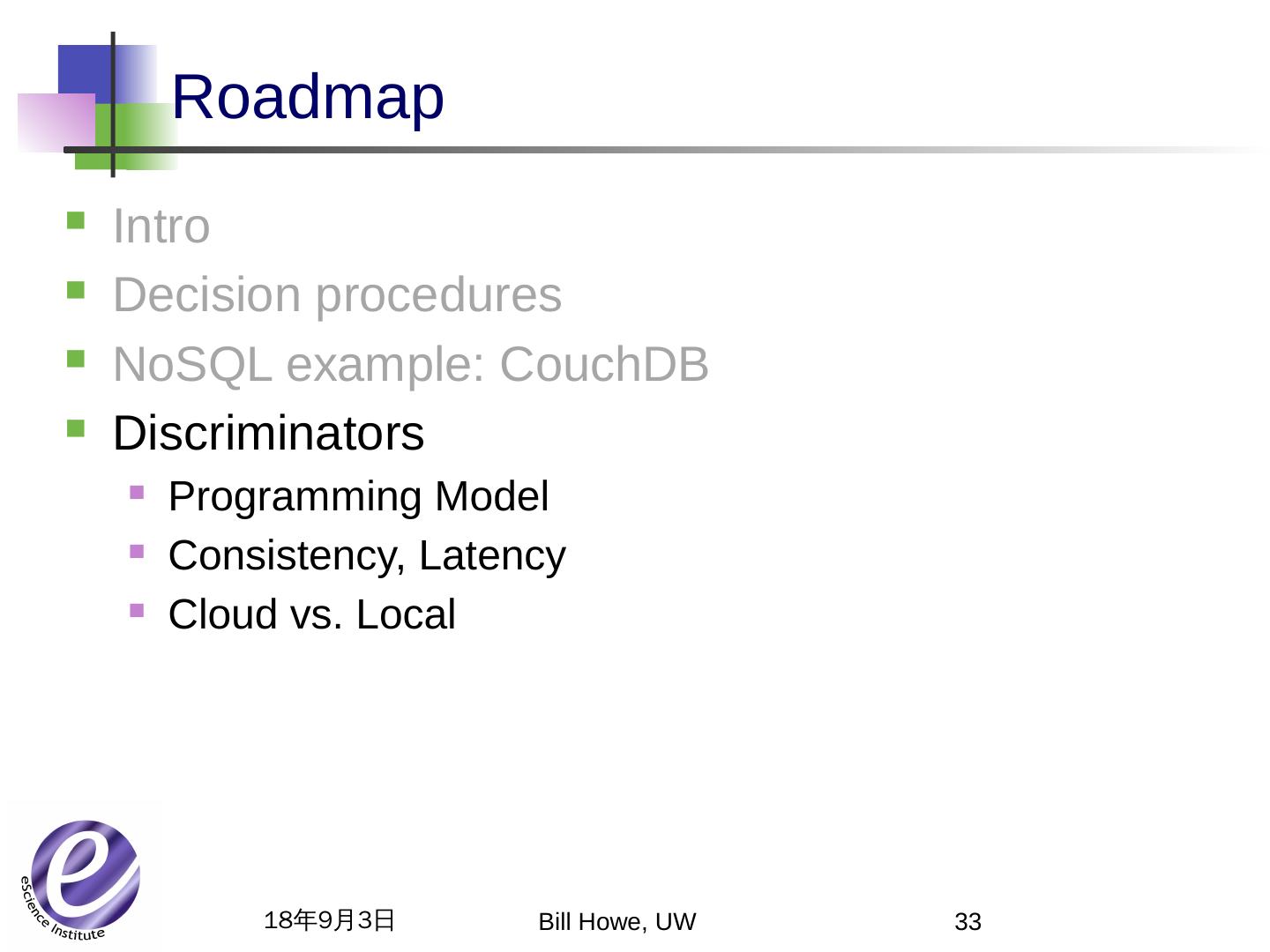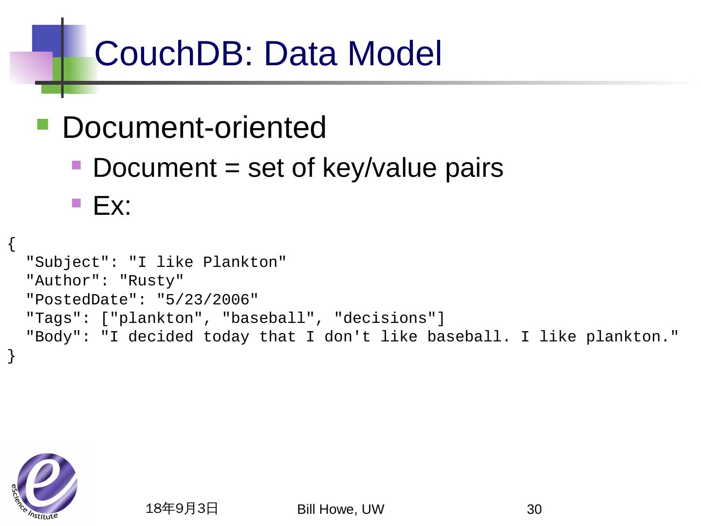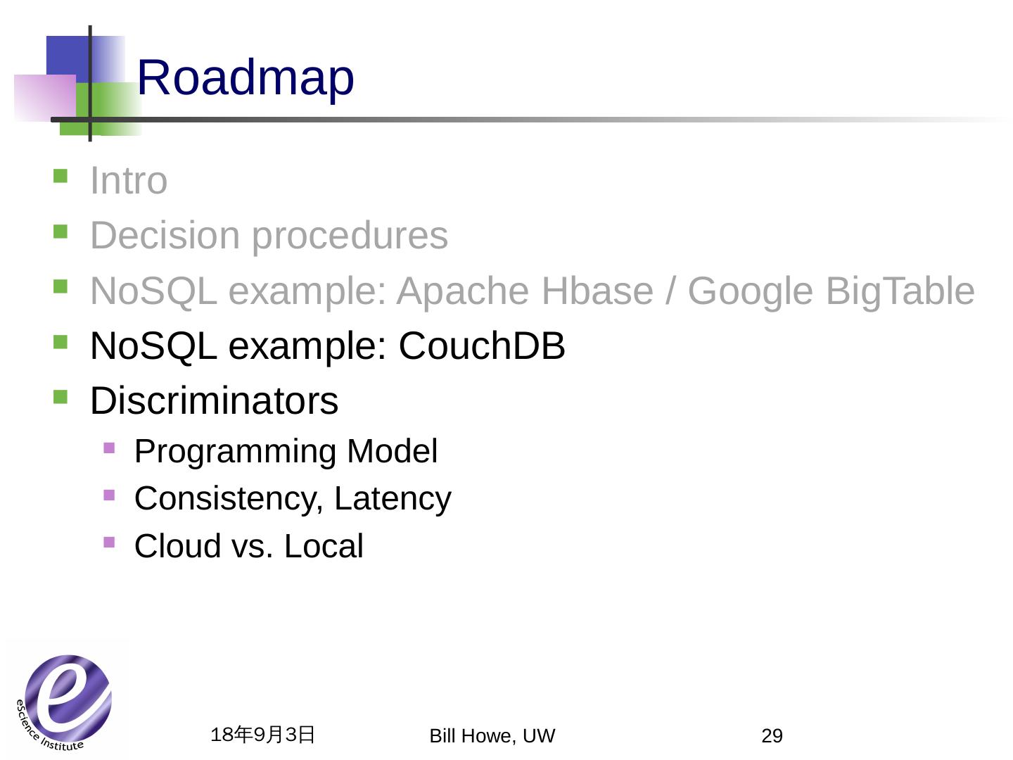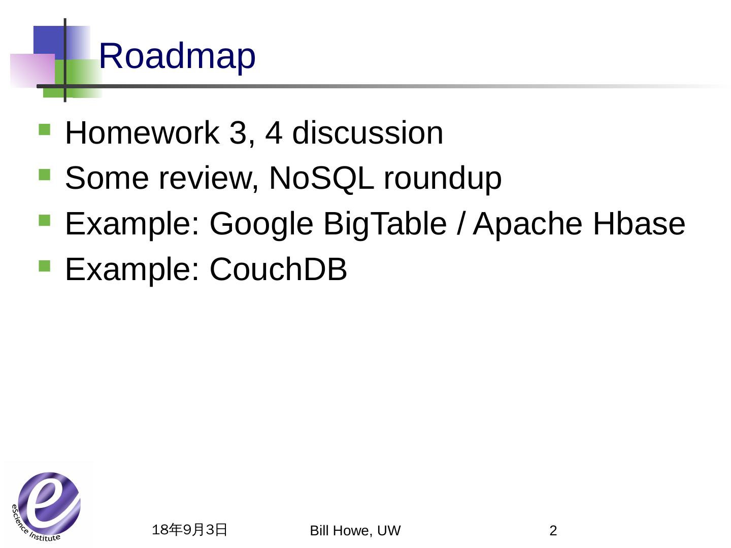 Roadmap. Homework 3, 4 discussion; Some review, NoSQL roundup; Example: Google BigTable / Apache Hbase; Example: CouchDB. 1/1/97. 2. Bill Howe, UW.