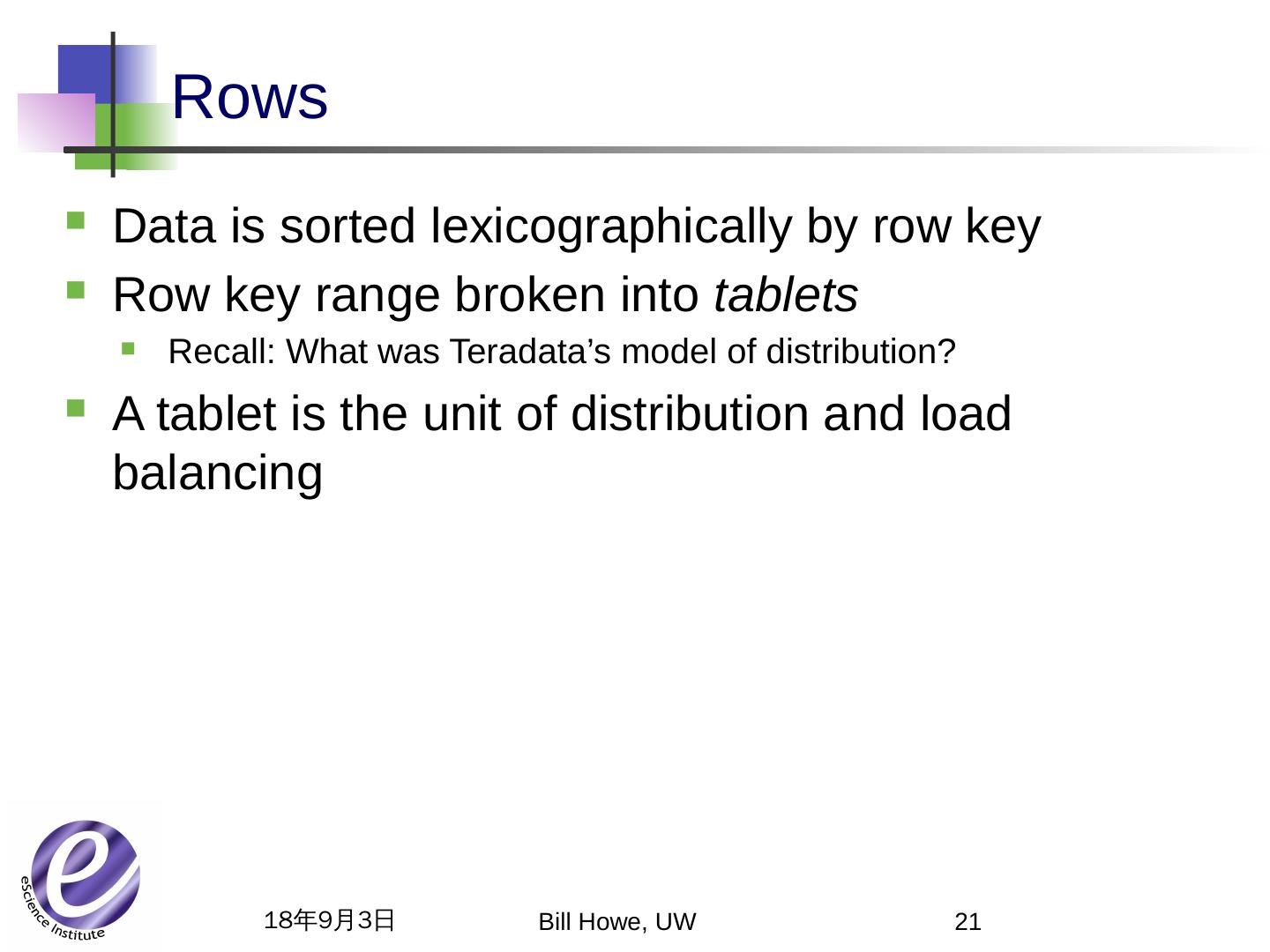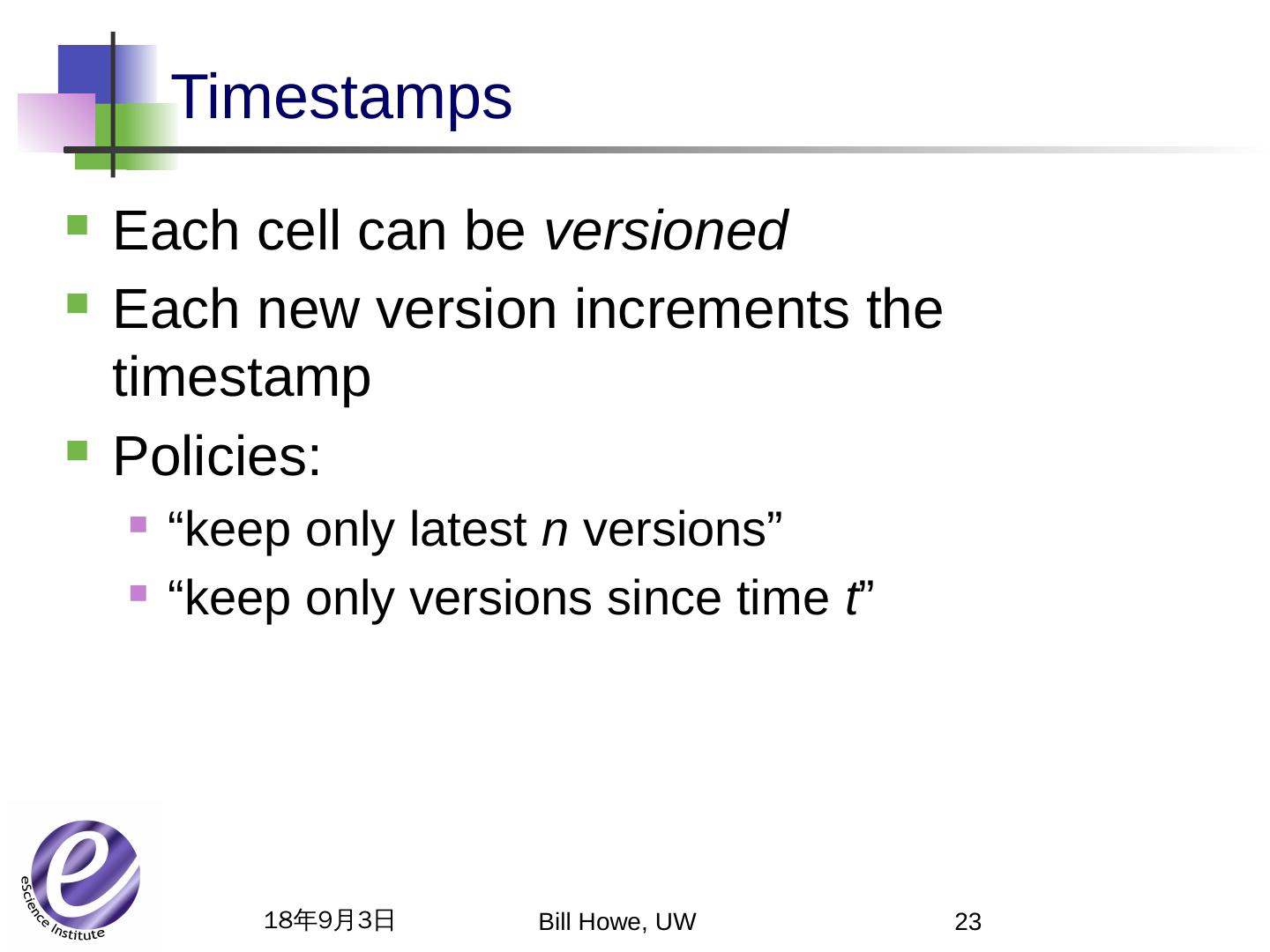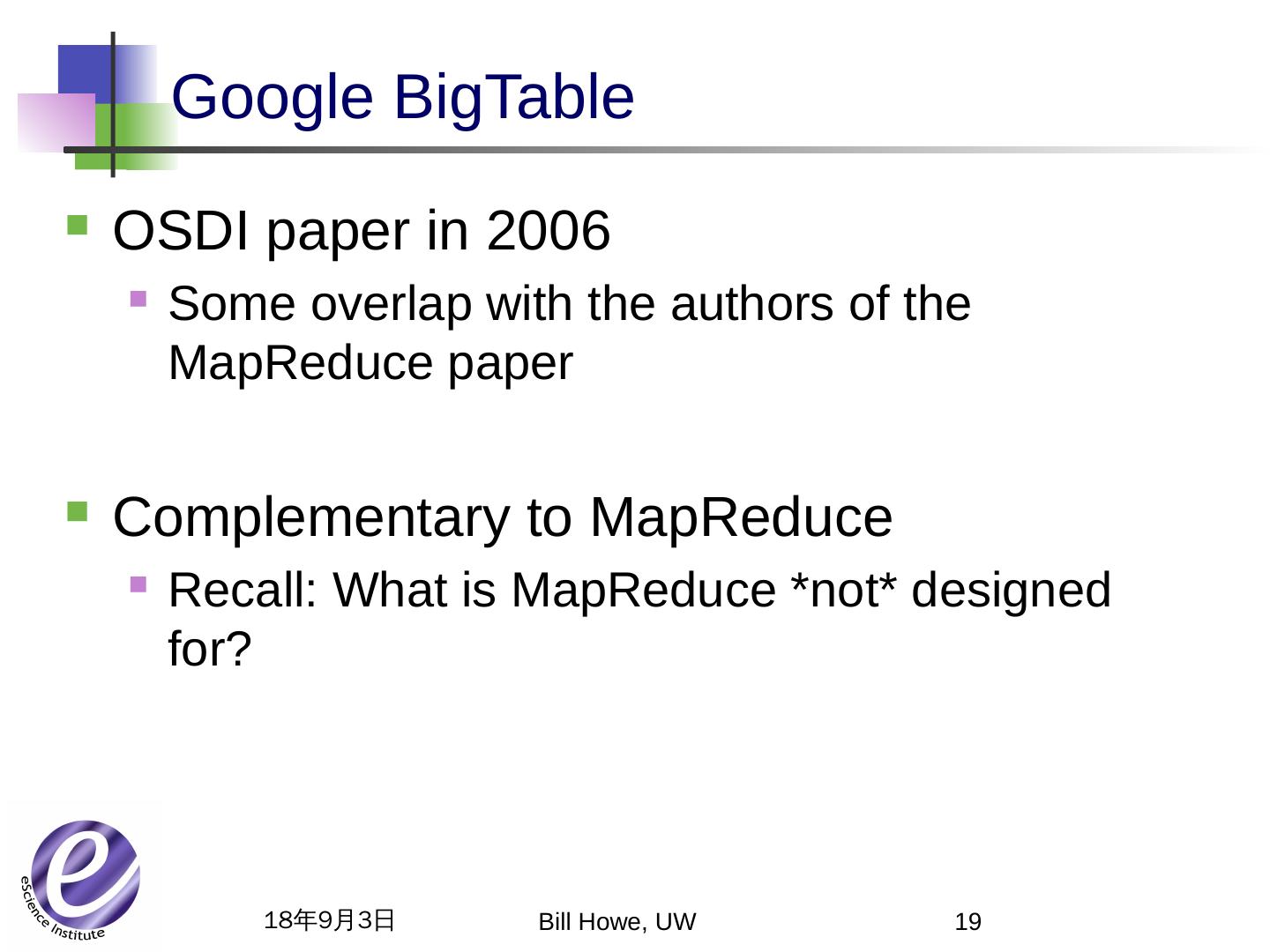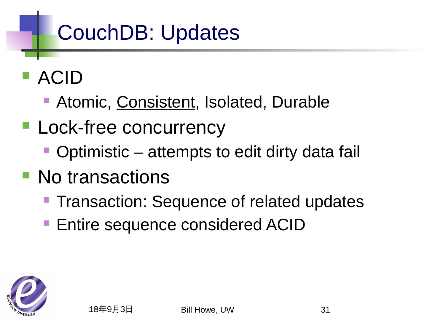 Roadmap. Homework 3, 4 discussion; Some review, NoSQL roundup; Example: Google BigTable / Apache Hbase; Example: CouchDB. 1/1/97. 2. Bill Howe, UW.