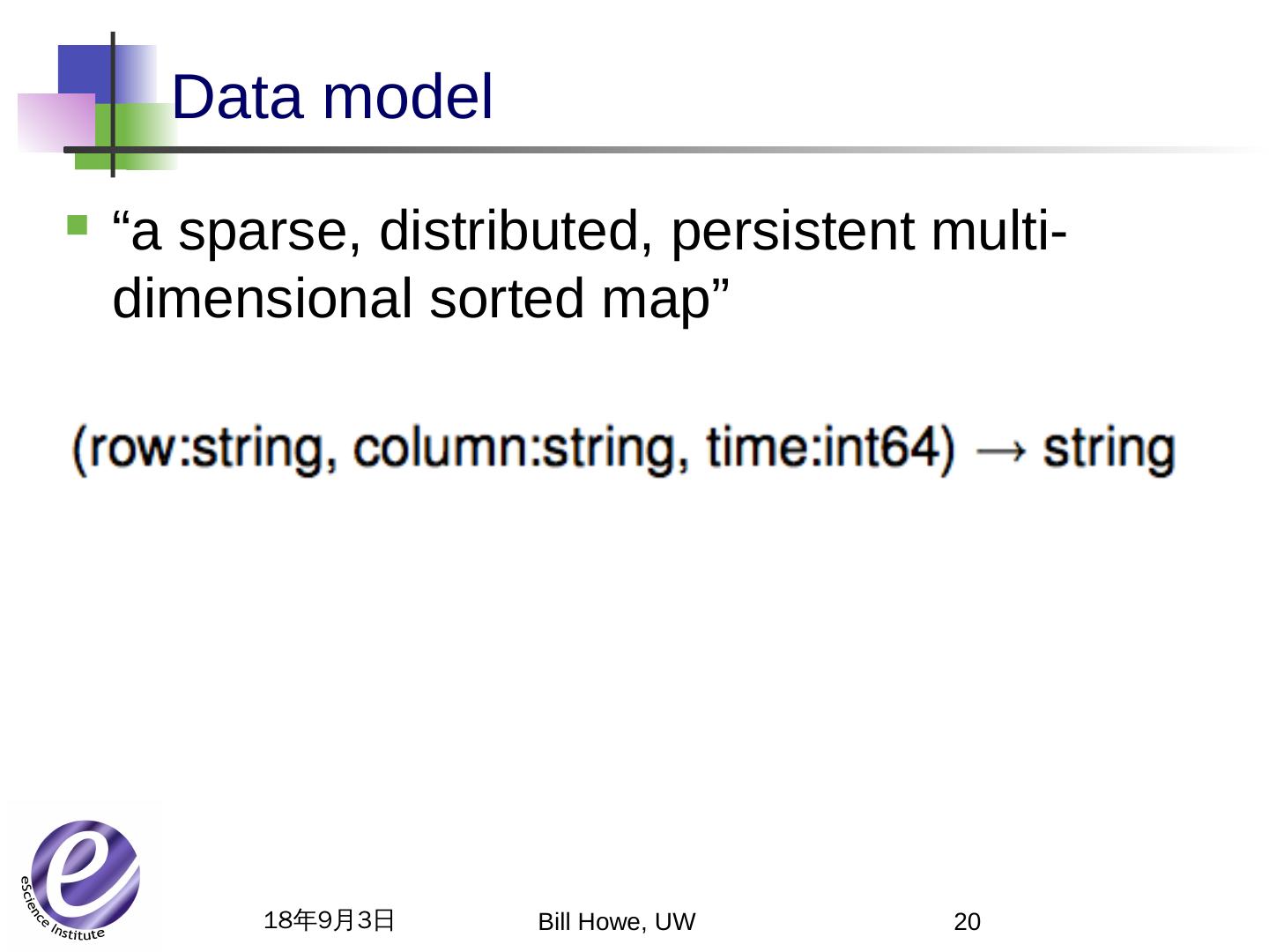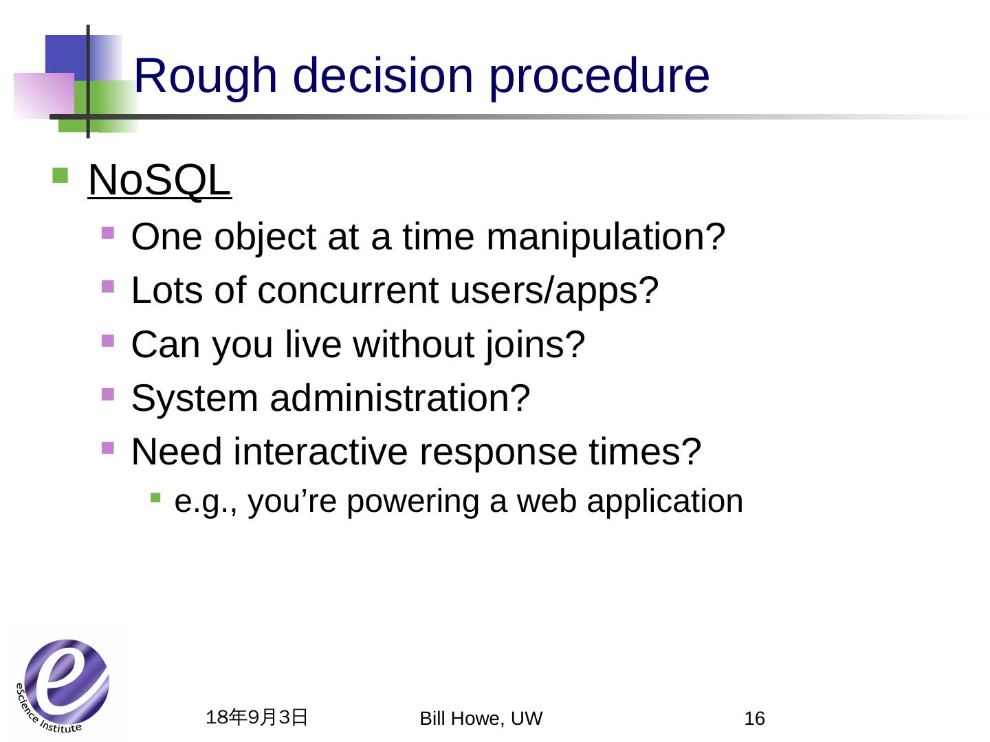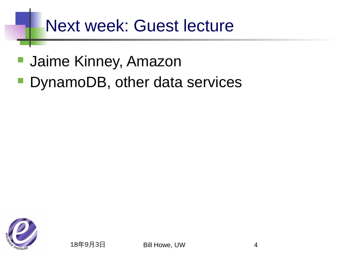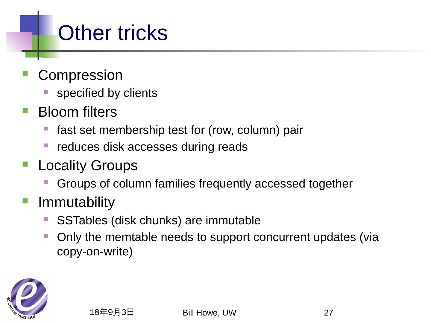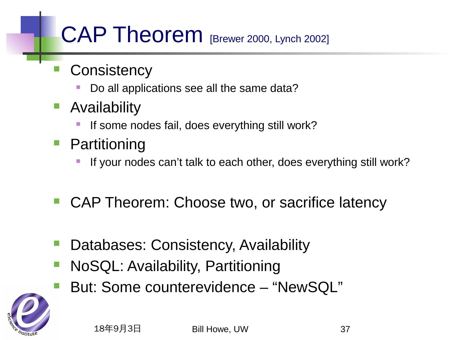 Roadmap. Homework 3, 4 discussion; Some review, NoSQL roundup; Example: Google BigTable / Apache Hbase; Example: CouchDB. 1/1/97. 2. Bill Howe, UW.