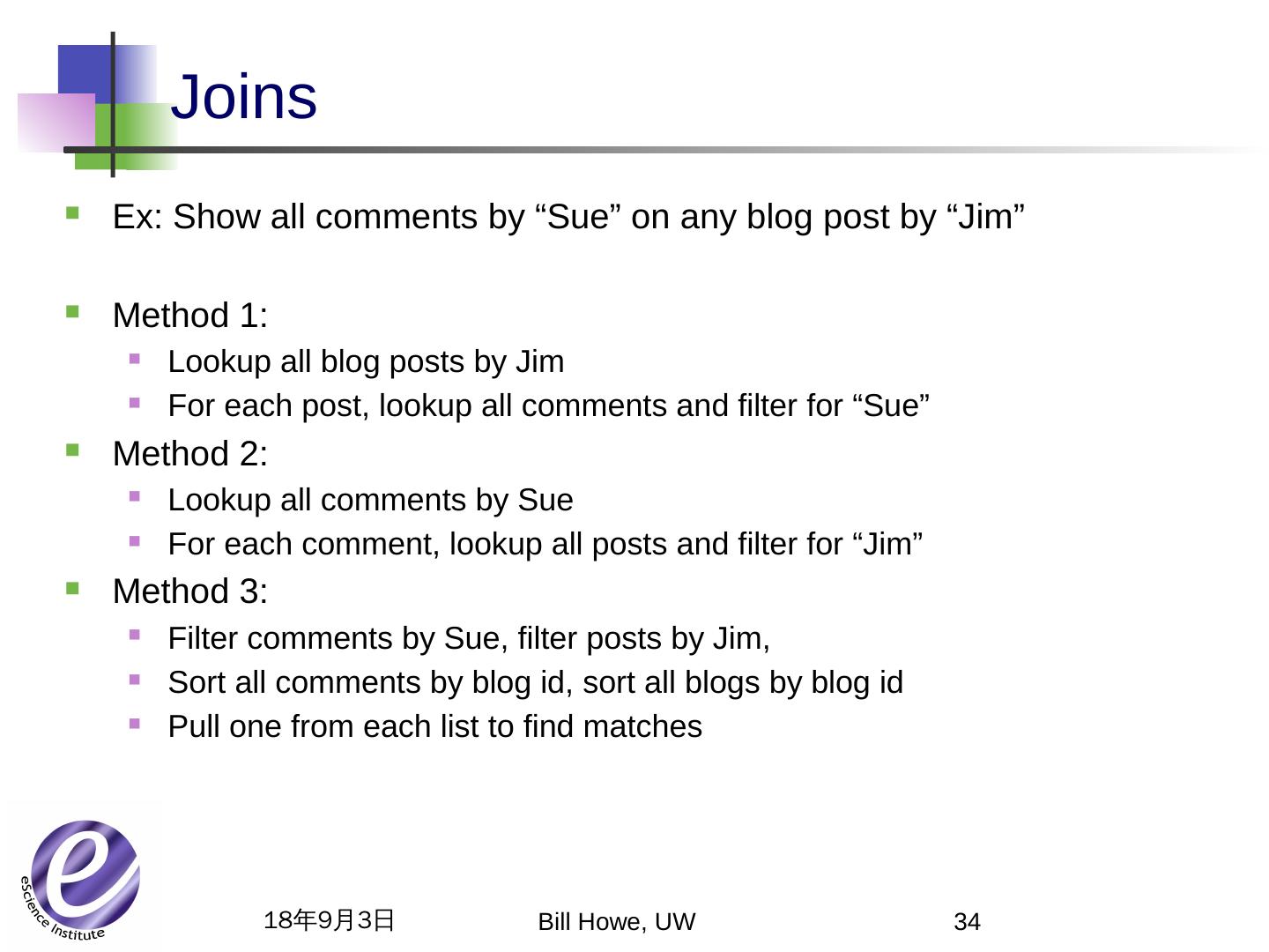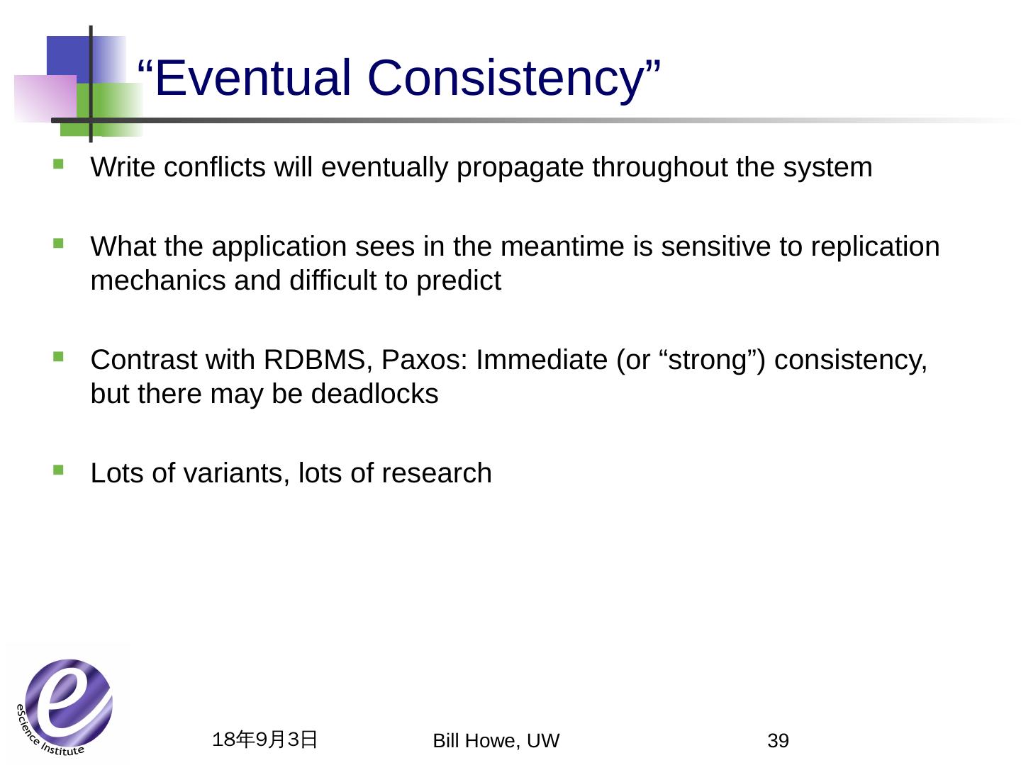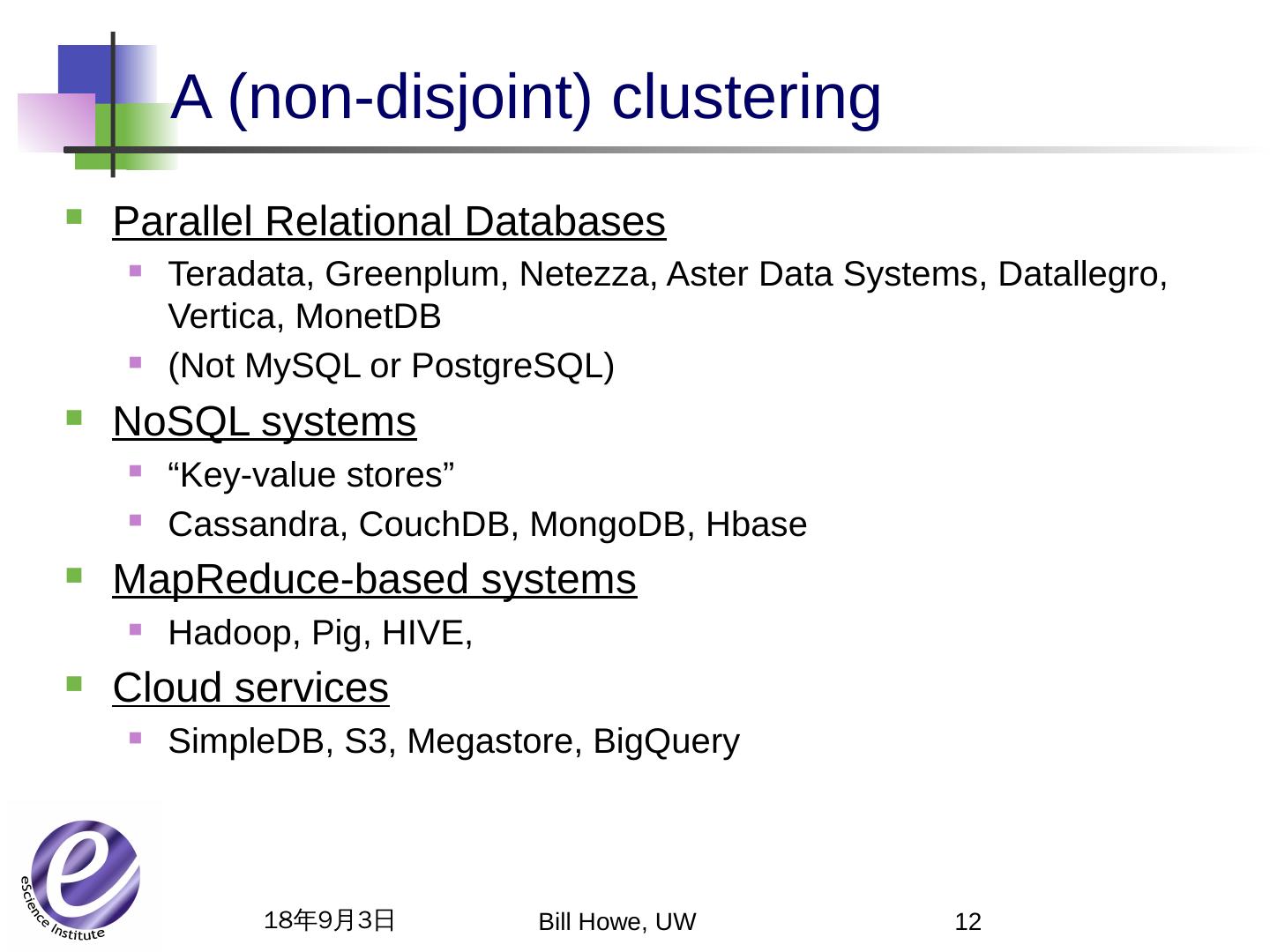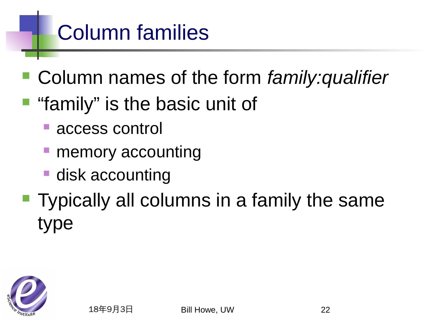 Roadmap. Homework 3, 4 discussion; Some review, NoSQL roundup; Example: Google BigTable / Apache Hbase; Example: CouchDB. 1/1/97. 2. Bill Howe, UW.