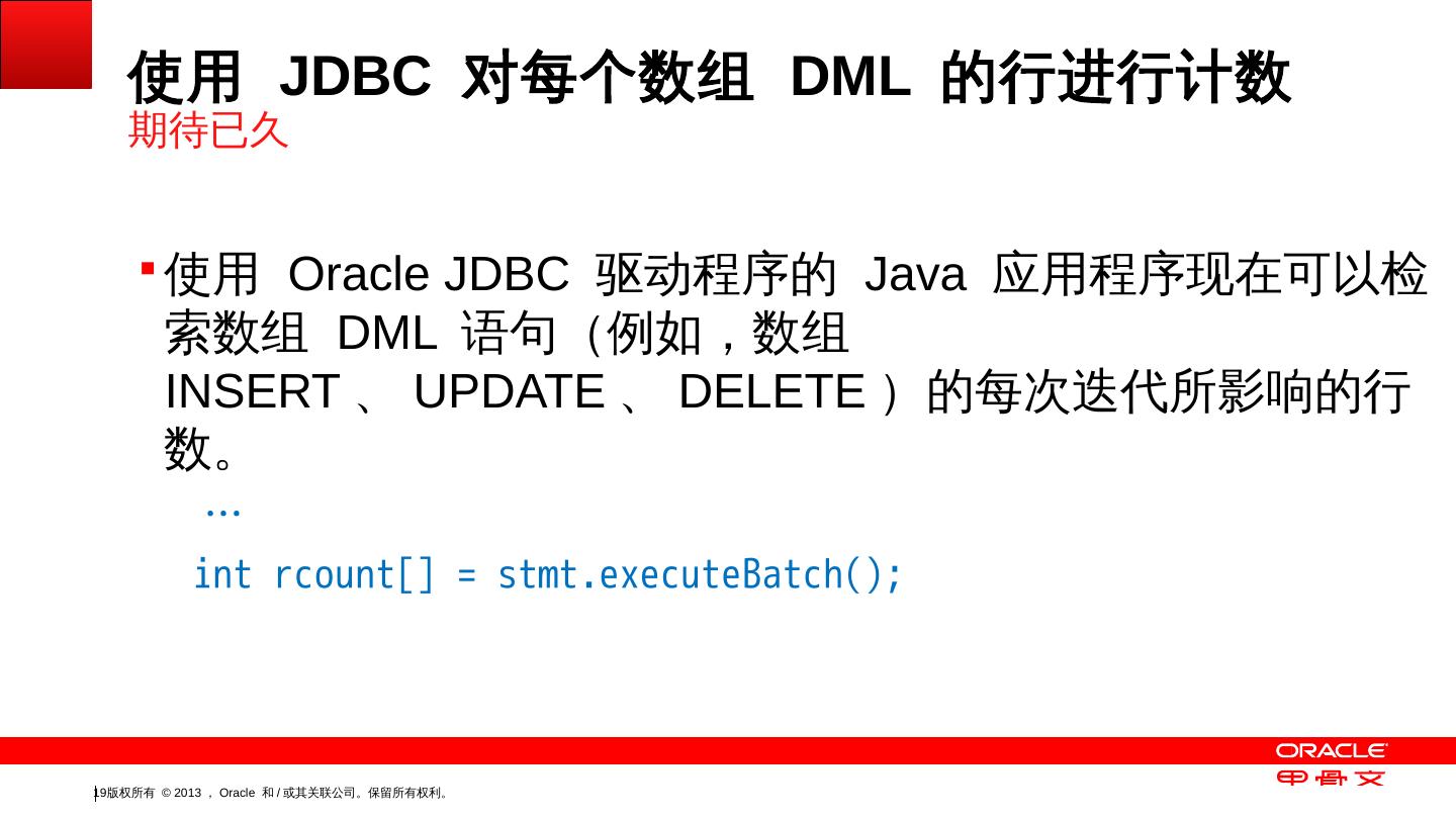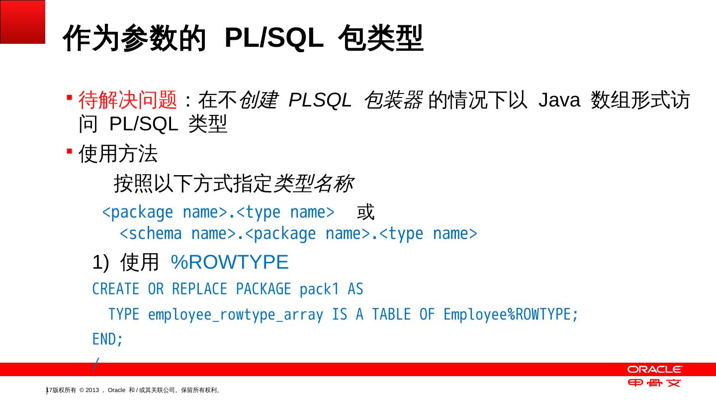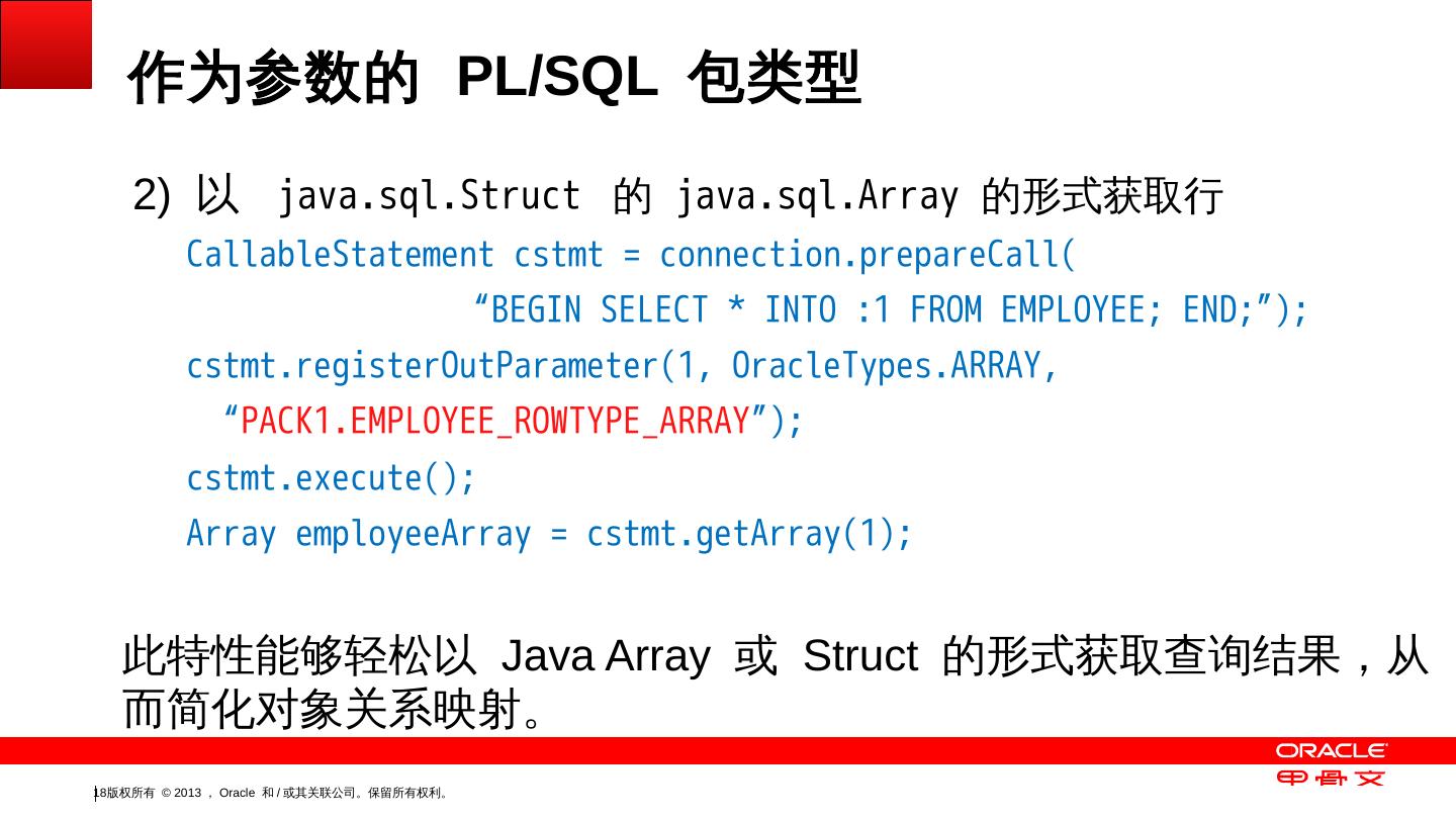 此处所述有关Oracle 产品的任何特性或功能的开发、发布以及相应的演讲议题均 .... 待解决问题:在不创建PLSQL 包装器的情况下以Java 数组形式访问PL/SQL 类型 ...