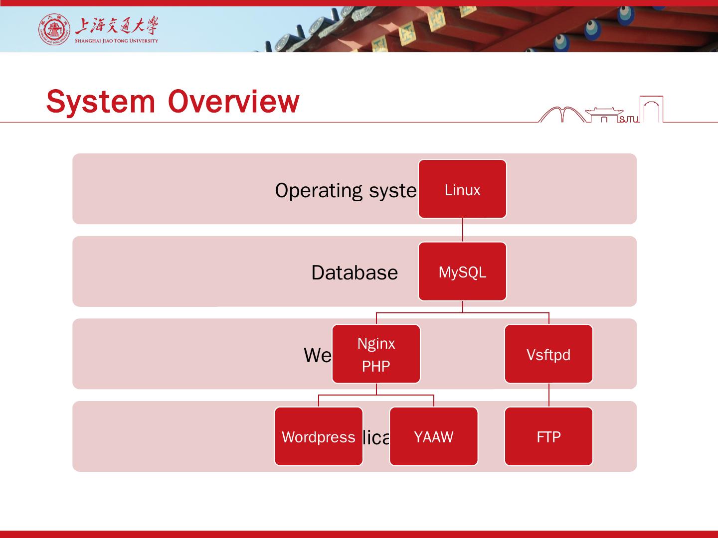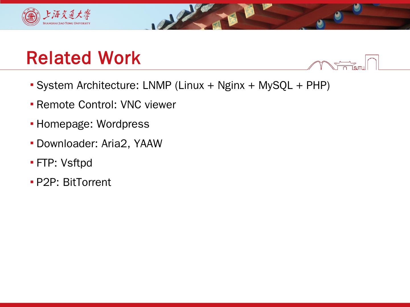 System Architecture: LNMP (Linux + Nginx + MySQL + PHP); Remote Control: VNC viewer; Homepage: Wordpress; Downloader: Aria2, YAAW; FTP: Vsftpd ...