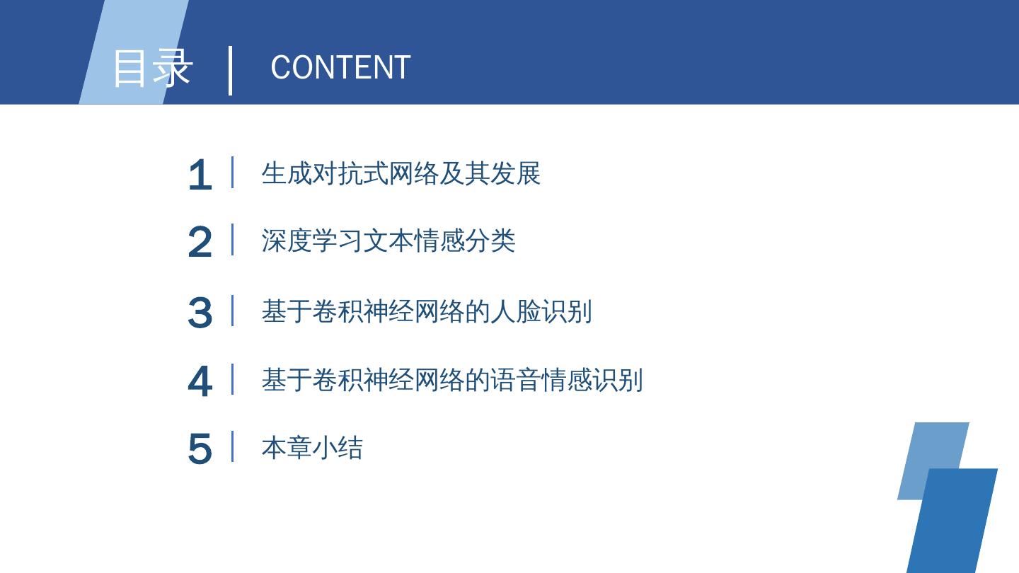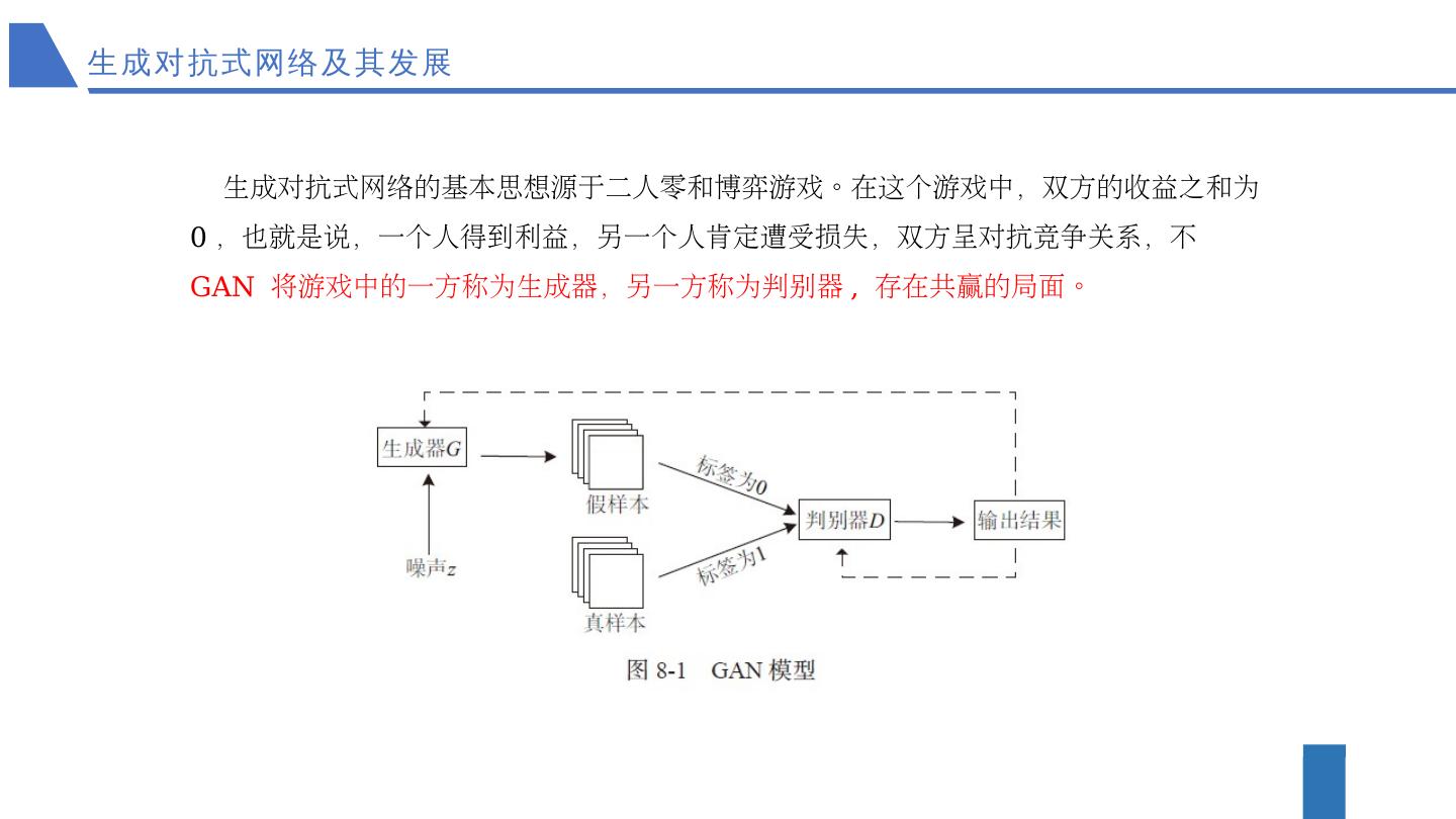 第8章 生成对抗式网络与深度学习. 目录. CONTENT. 1. 生成对抗式网络及其发展. 2. 深度学习文本情感分类. 3. 基于卷积神经网络的人脸识别. 4. 基于卷积神经网络的 ...