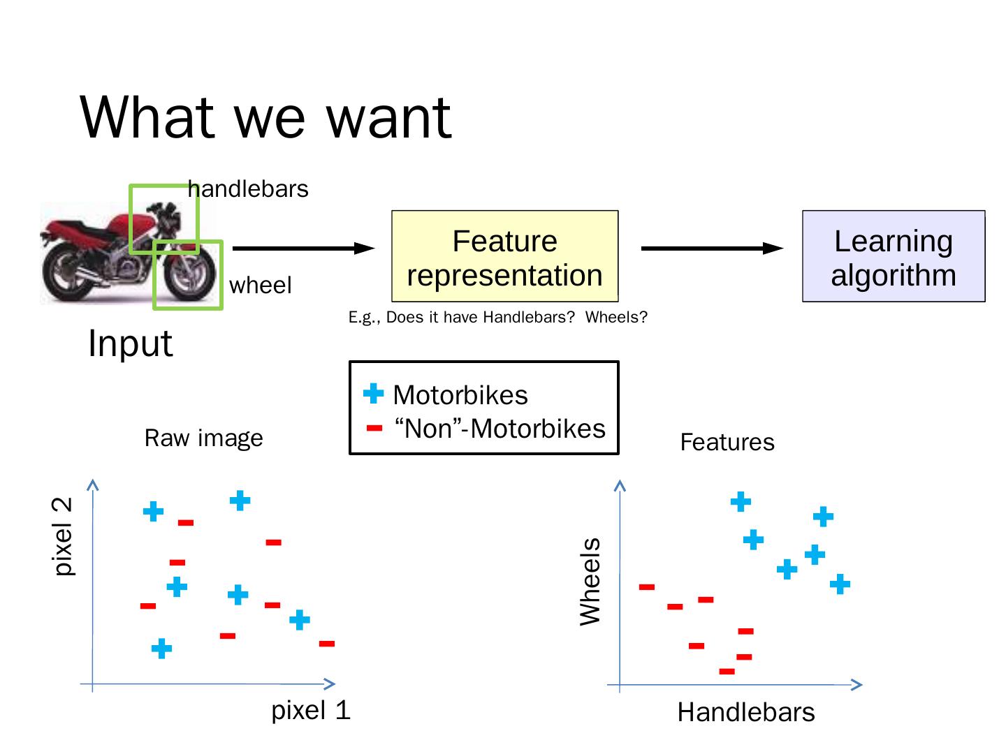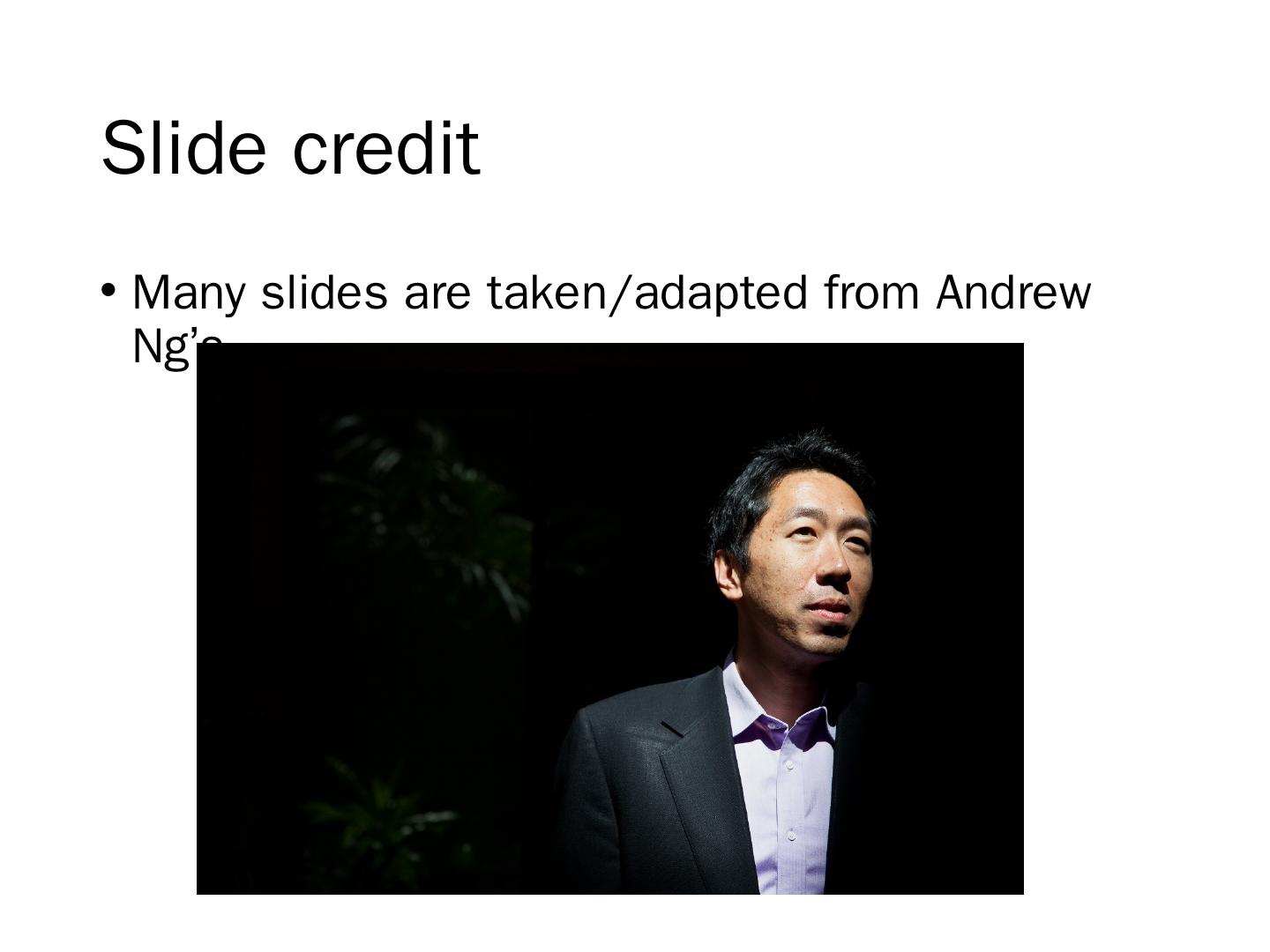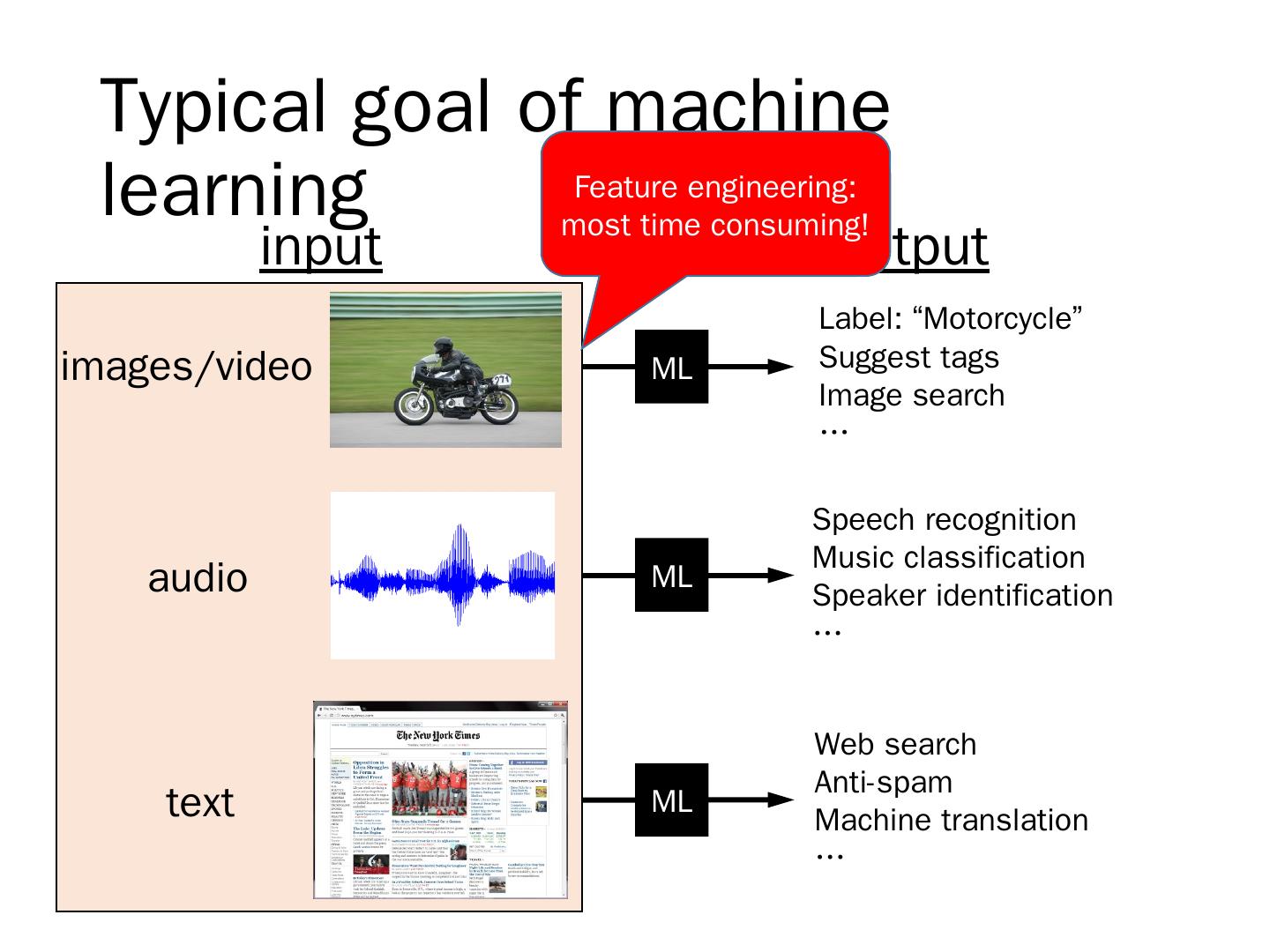 Many slides are taken/adapted from Andrew Ng's. Typical goal of machine learning. Label: “Motorcycle”. Suggest tags. Image search … Speech recognition.