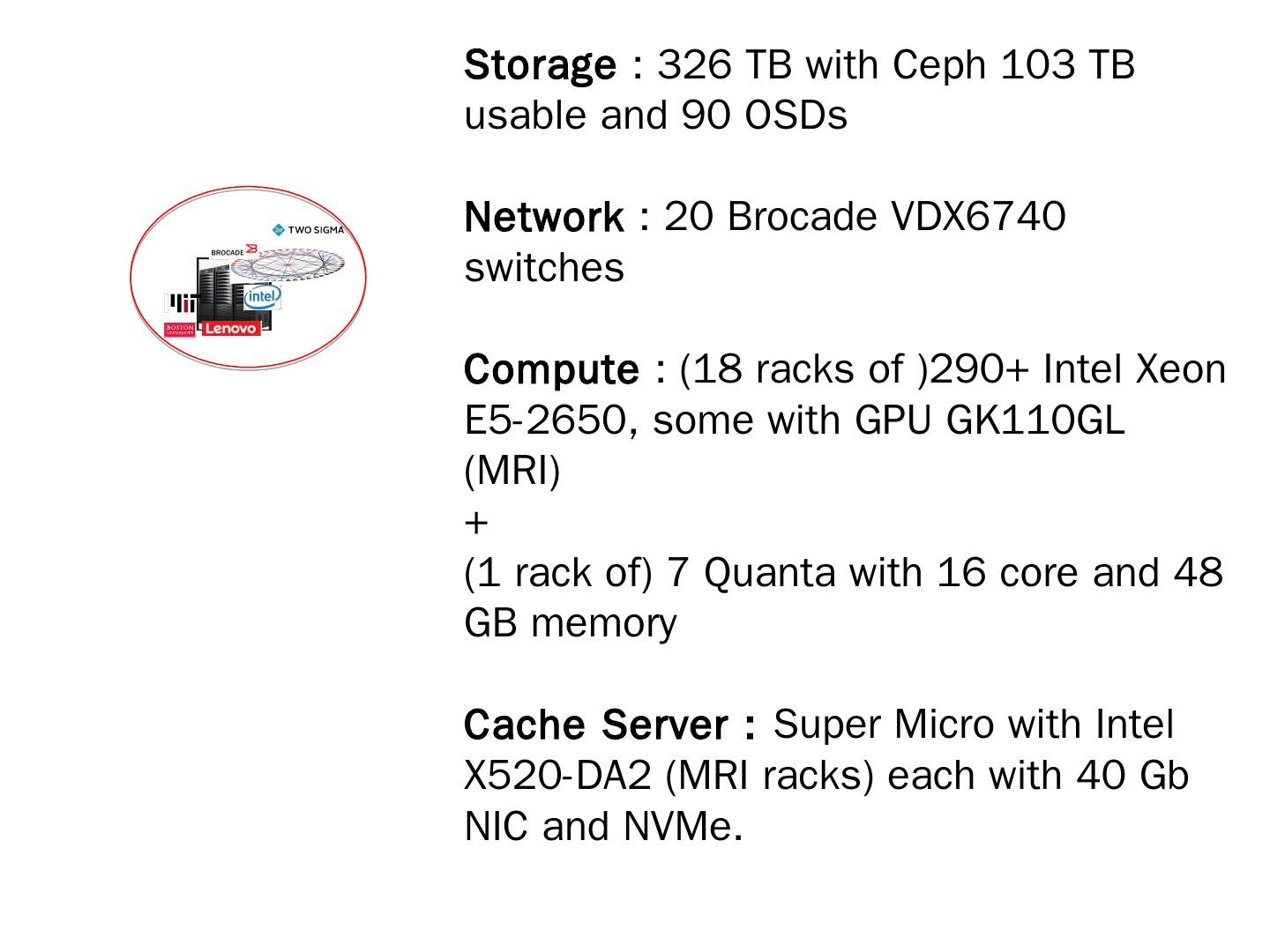 Compute : 48 Cisco UCSC C220 M3S each with 2sockets/24 cores (hyper-threading) and 128 GB memory. Storage : Fujitsu CD10000 Ceph appliance with123 ...