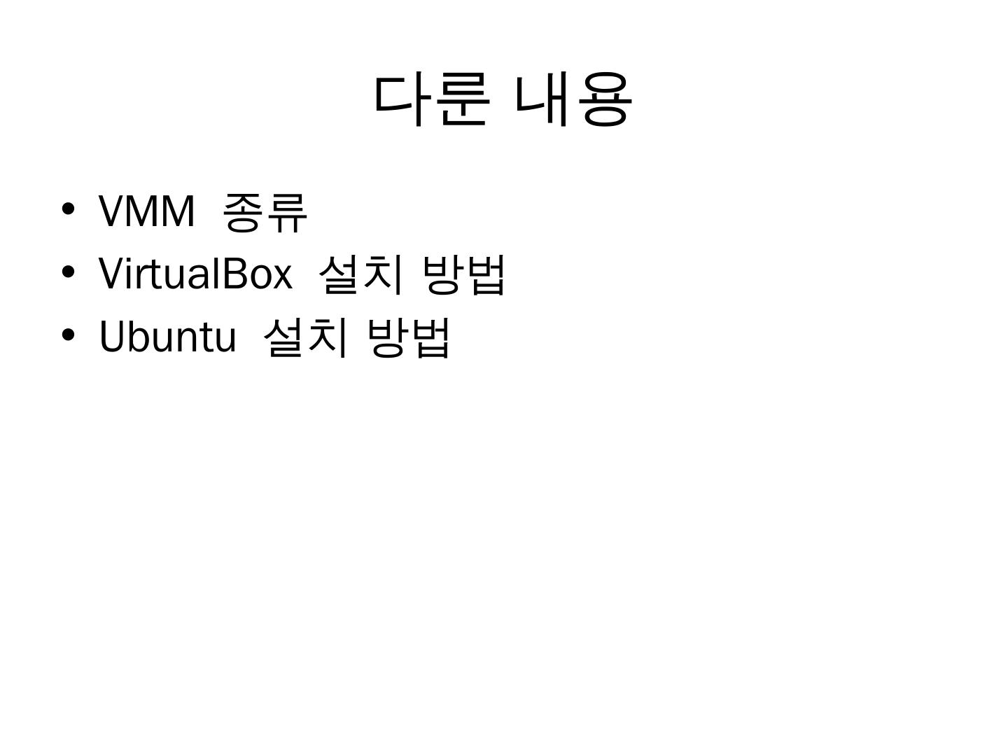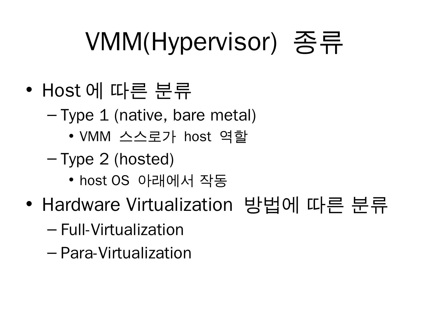 Ubuntu 실습 환경 만들기. 컴퓨터공학부 김찬민. VMM(Hypervisor) 종류. Host에 따른 분류. Type 1 (native, bare metal). VMM 스스로가 host 역할. Type 2 (hosted).