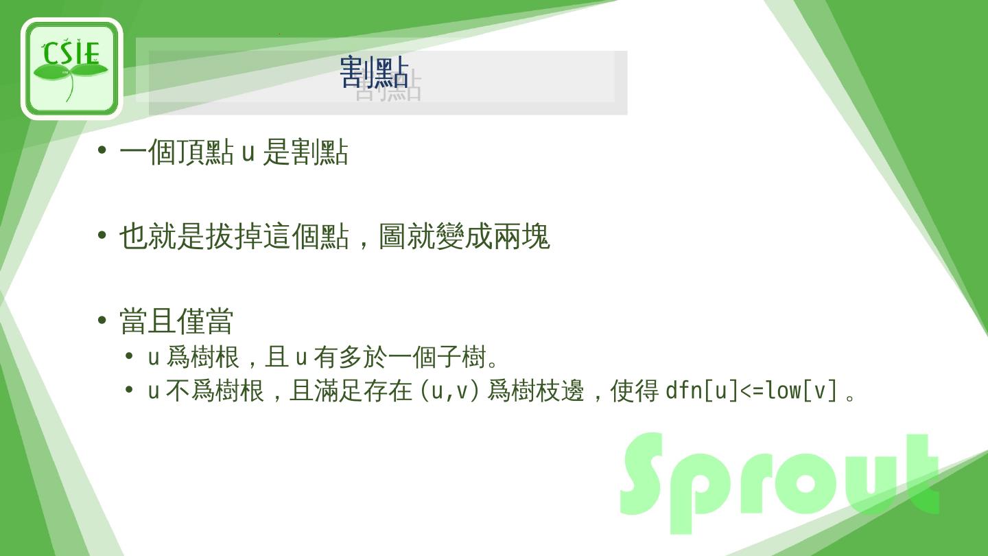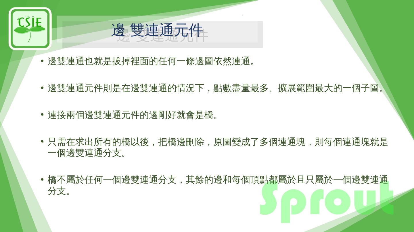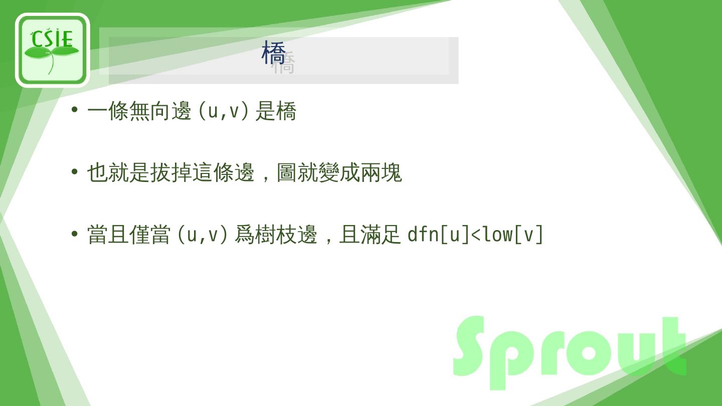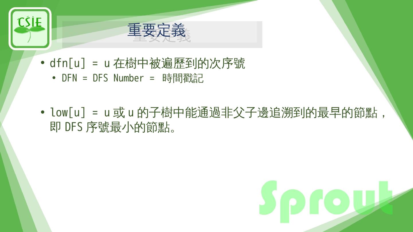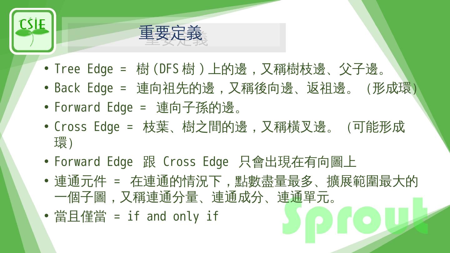 Back Edge = 連向祖先的邊,又稱後向邊、返祖邊。 ... 出現在有向圖上; 連通元件= 在連通的情況下,點數盡量最多、擴展範圍最大的一個子圖, ... 一條無向邊(u,v)是橋.