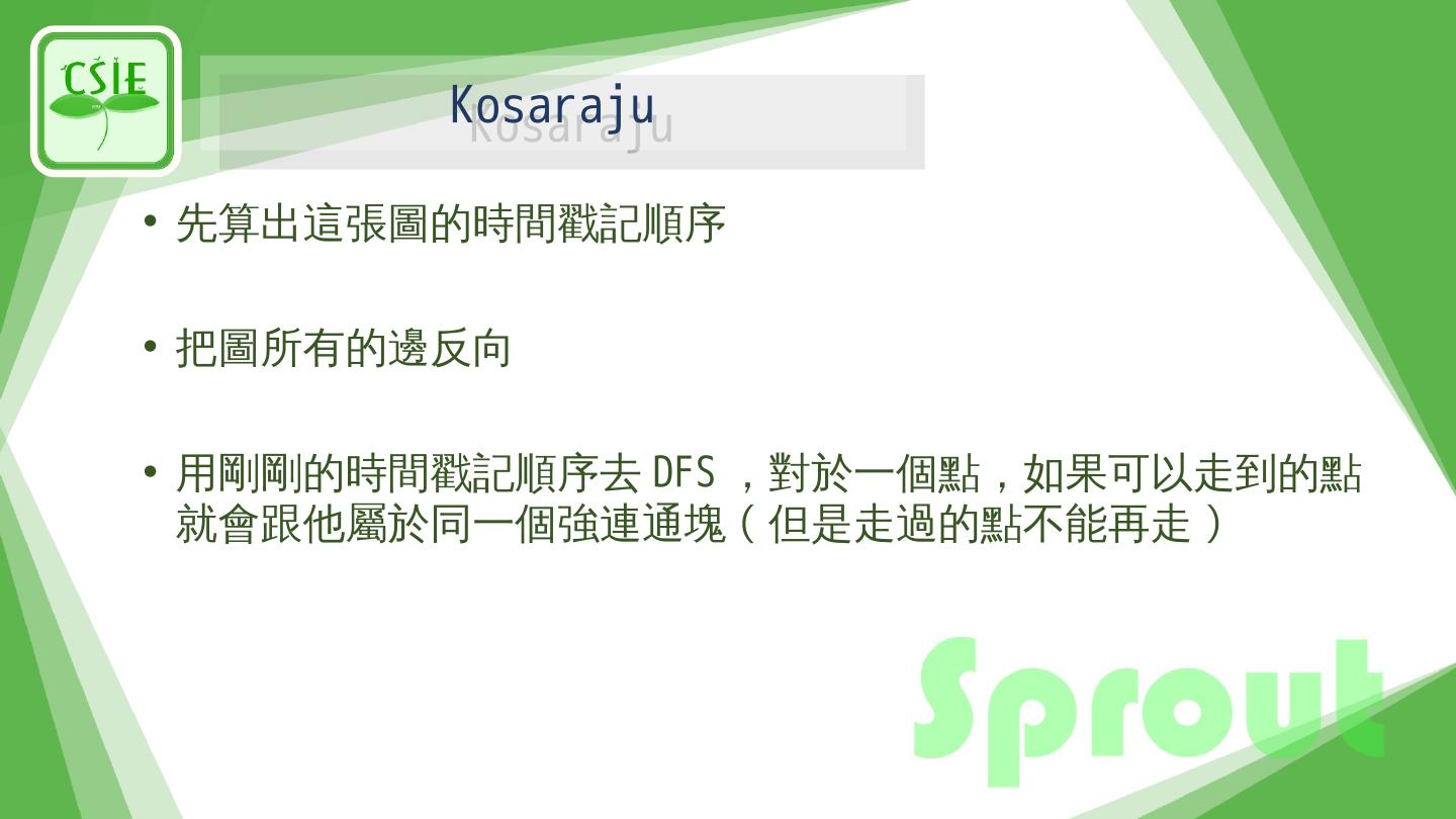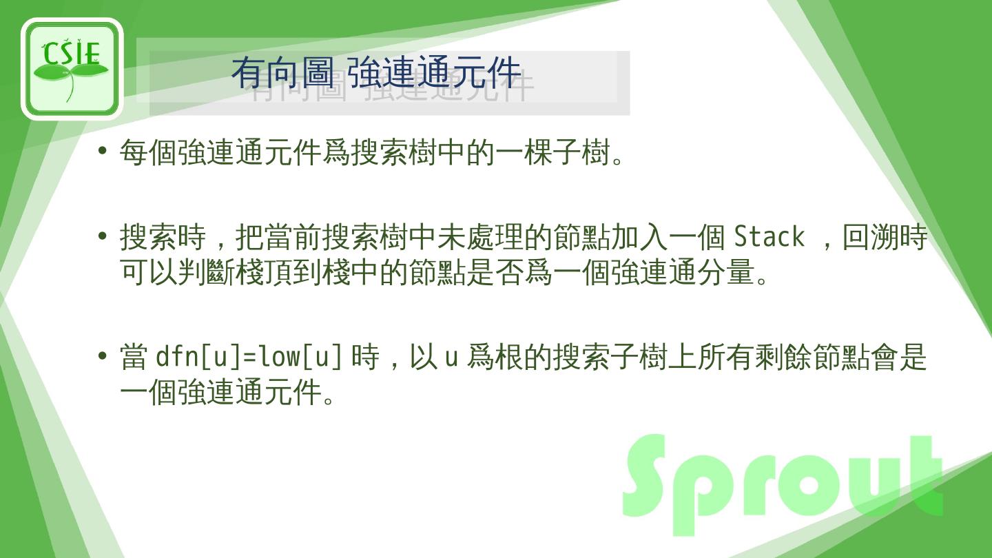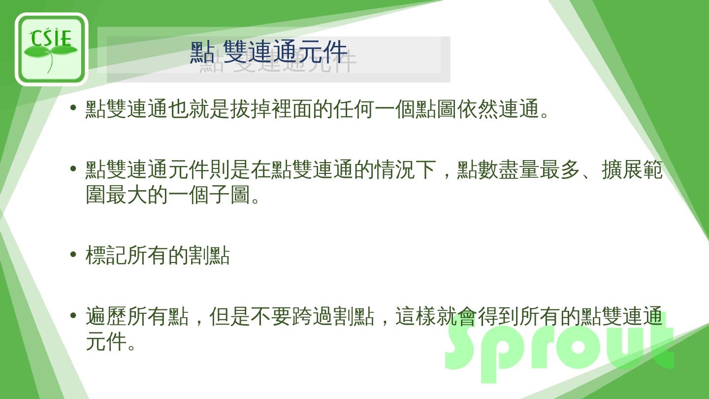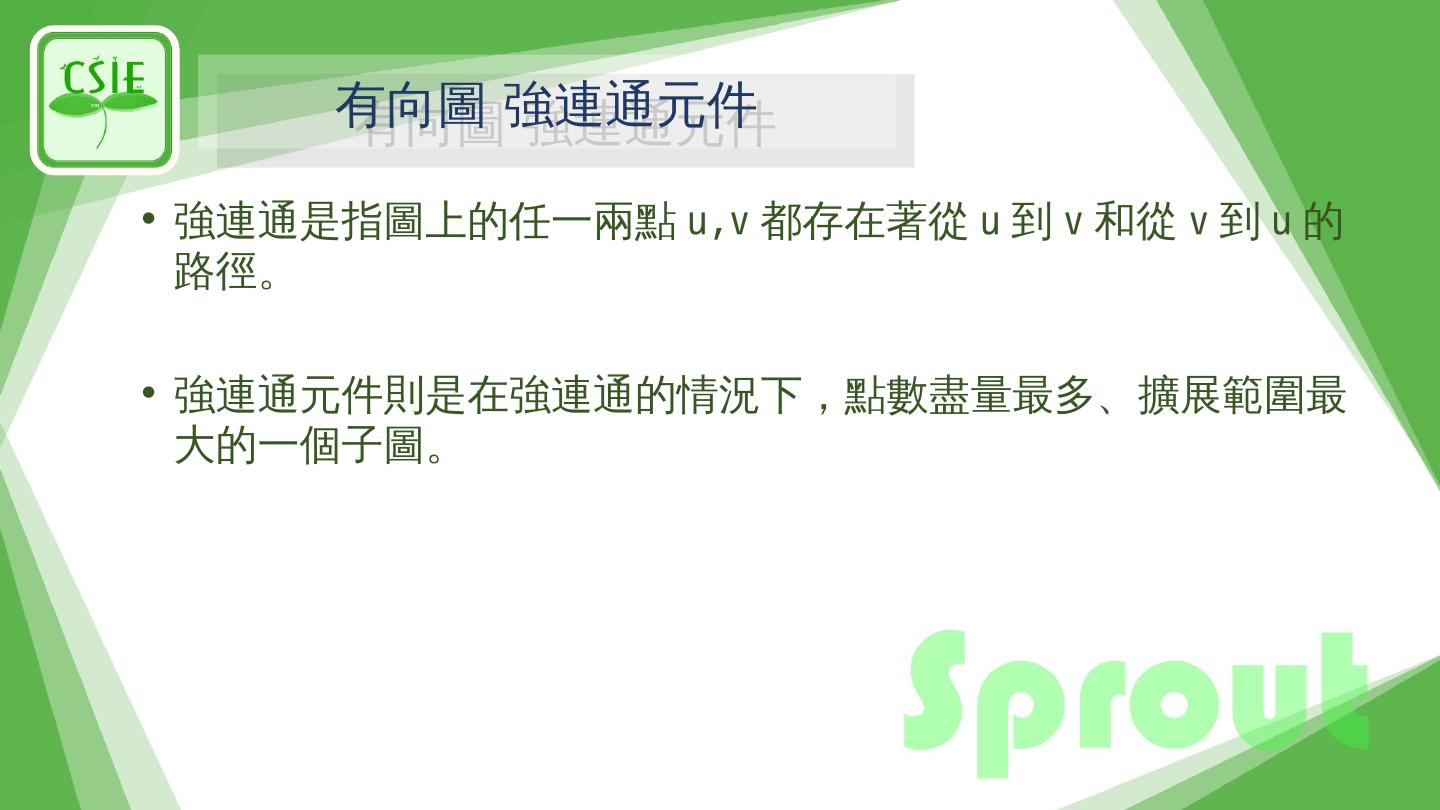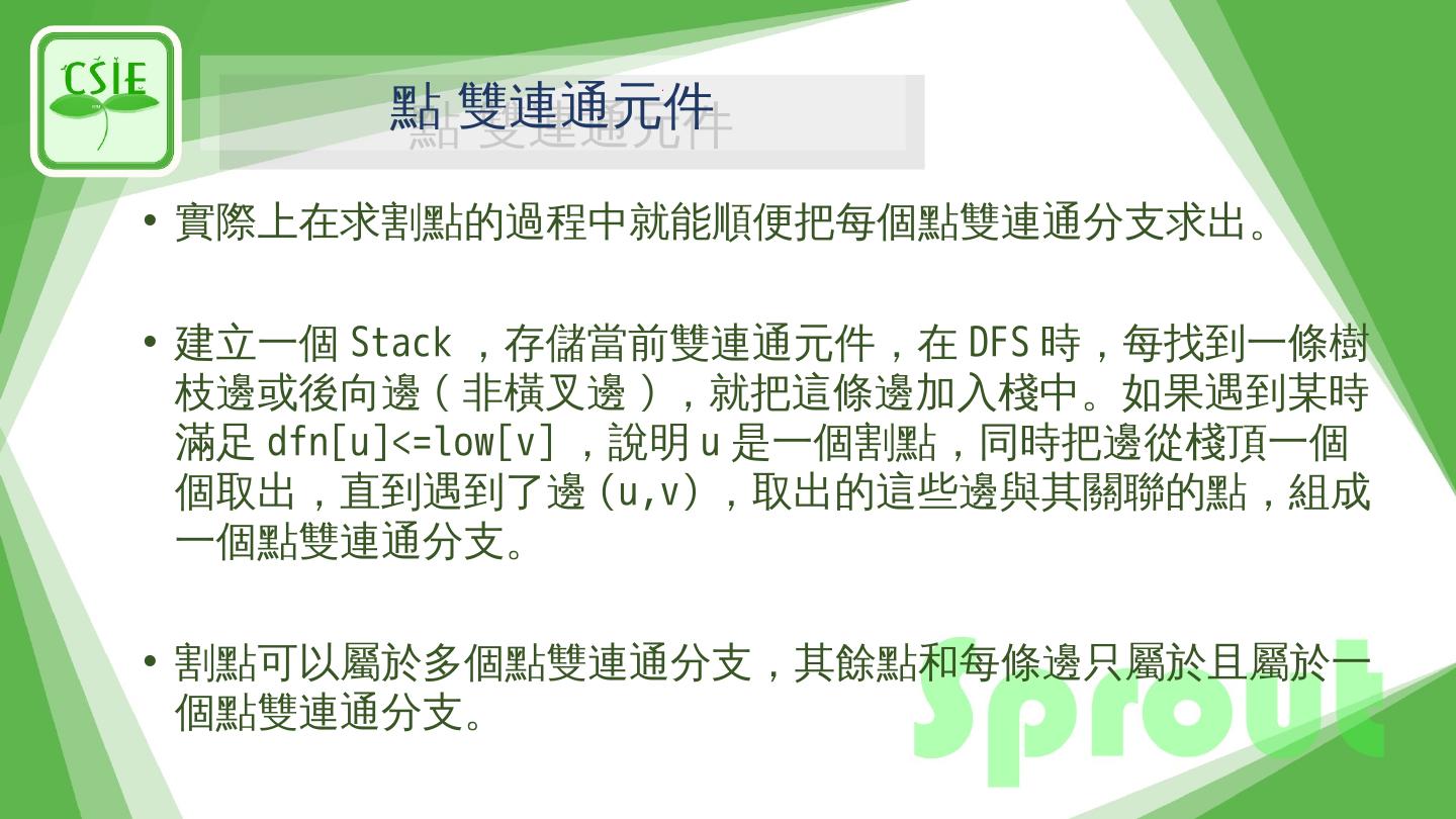 Back Edge = 連向祖先的邊,又稱後向邊、返祖邊。 ... 出現在有向圖上; 連通元件= 在連通的情況下,點數盡量最多、擴展範圍最大的一個子圖, ... 一條無向邊(u,v)是橋.