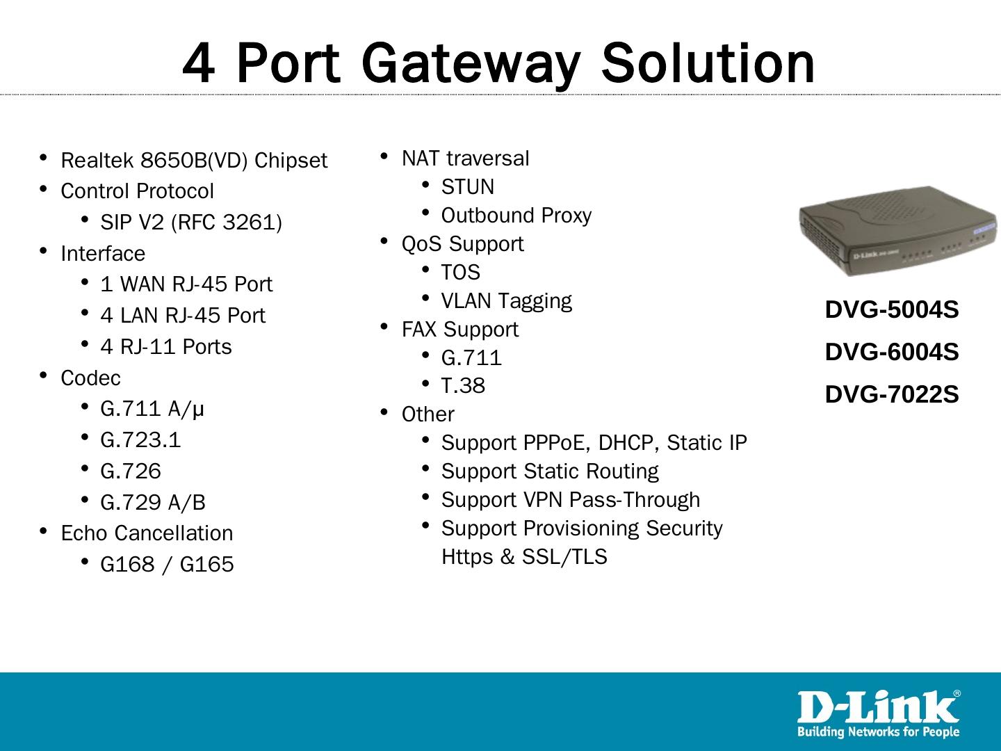 Support PPPoE, DHCP, Static IP; Support Static Routing; Support VPN Pass-Through; Support Provisioning Security. Https & SSL/TLS. DVG-5004S. DVG-6004S.