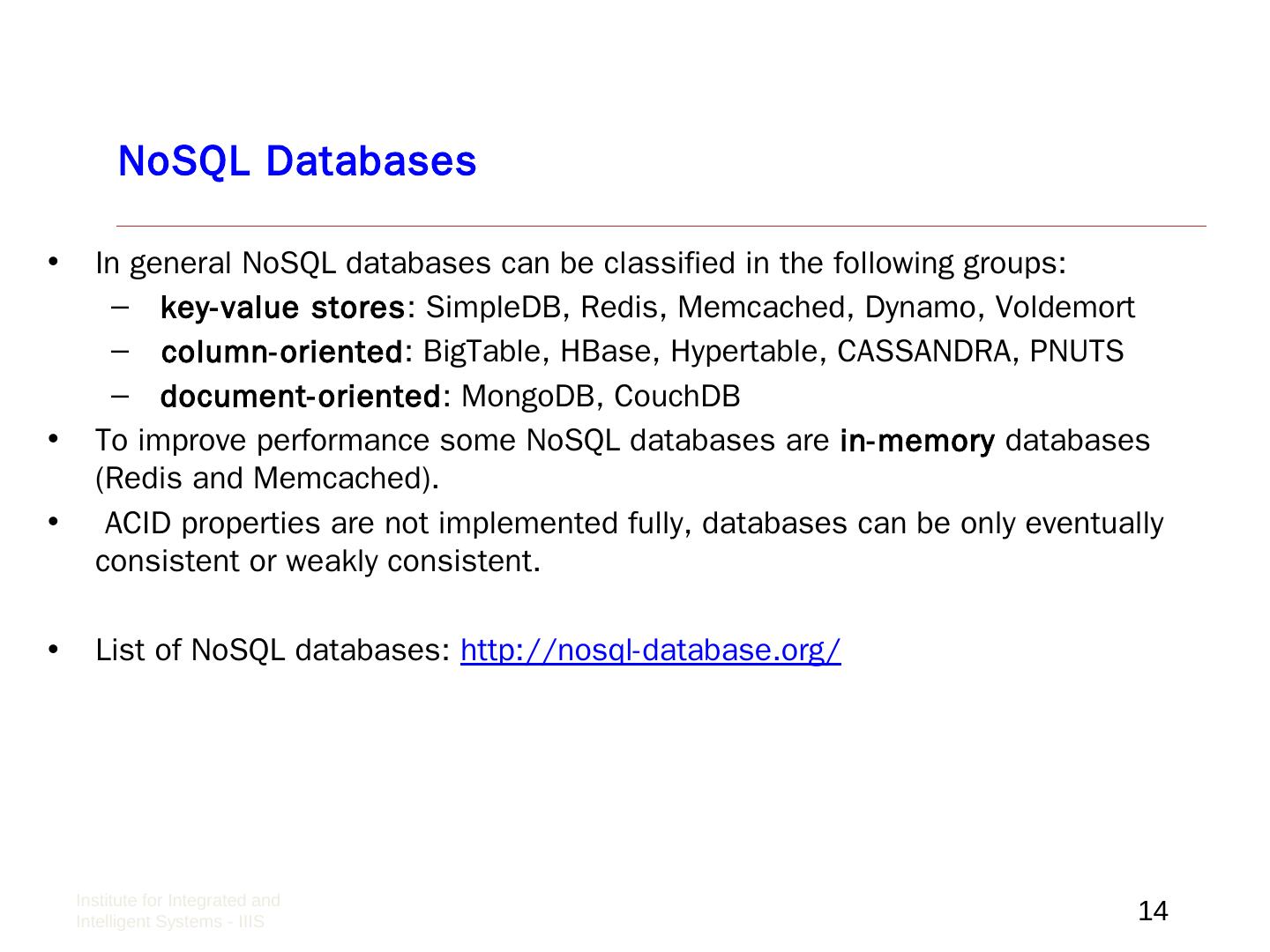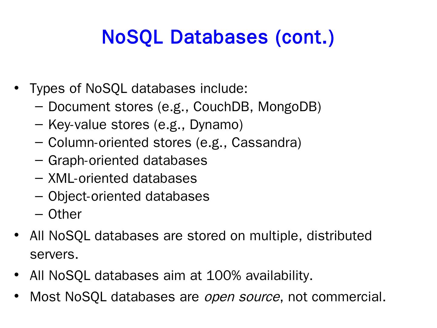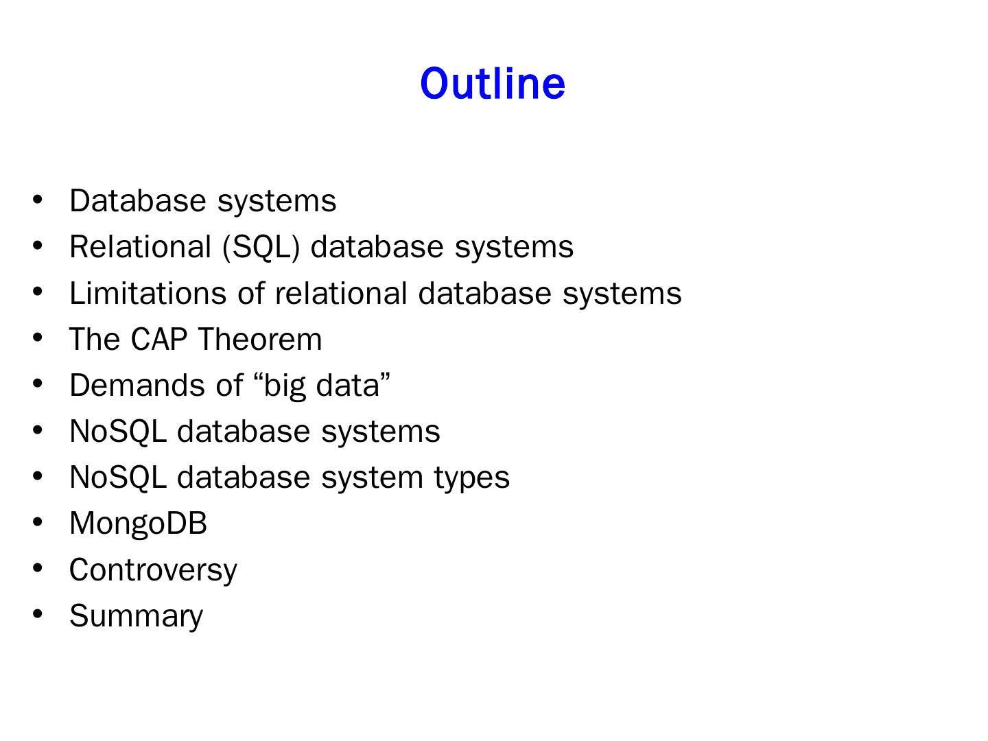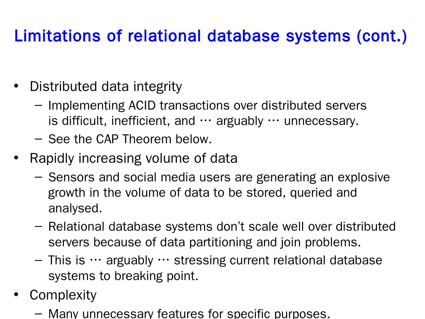 Database systems; Relational (SQL) database systems; Limitations of relational database systems; The CAP Theorem; Demands of “big data”; NoSQL database ...