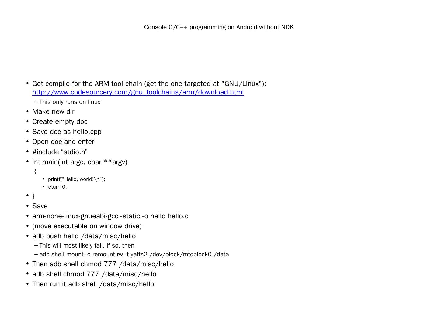 C/C++ programming on Android. Console C/C++ programming on Android without NDK. Get compile for the ARM tool chain (get the one targeted at ...
