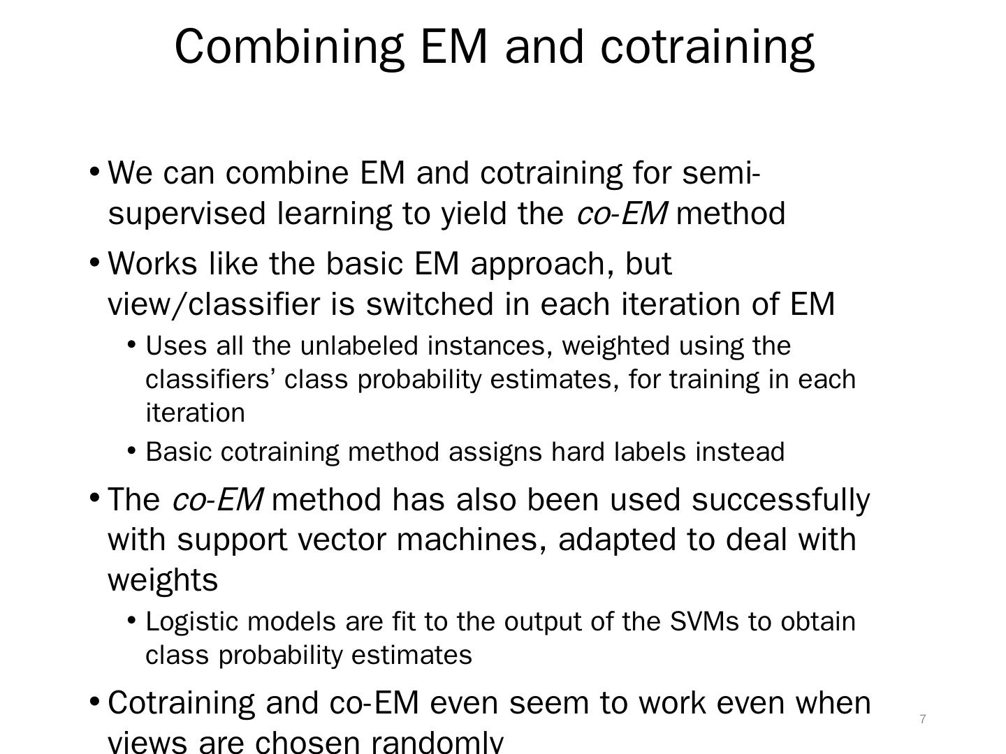 Idea: use naïve Bayes on labeled examples and then apply EM. First, build naïve Bayes model on labeled data; Second, label unlabeled data based on class ...