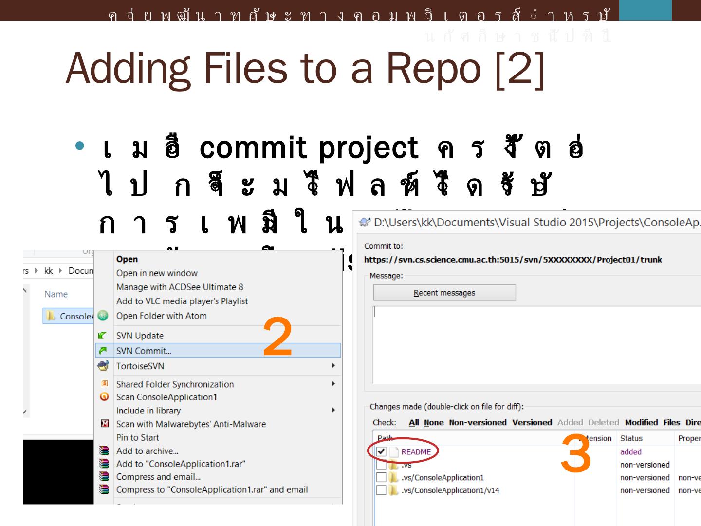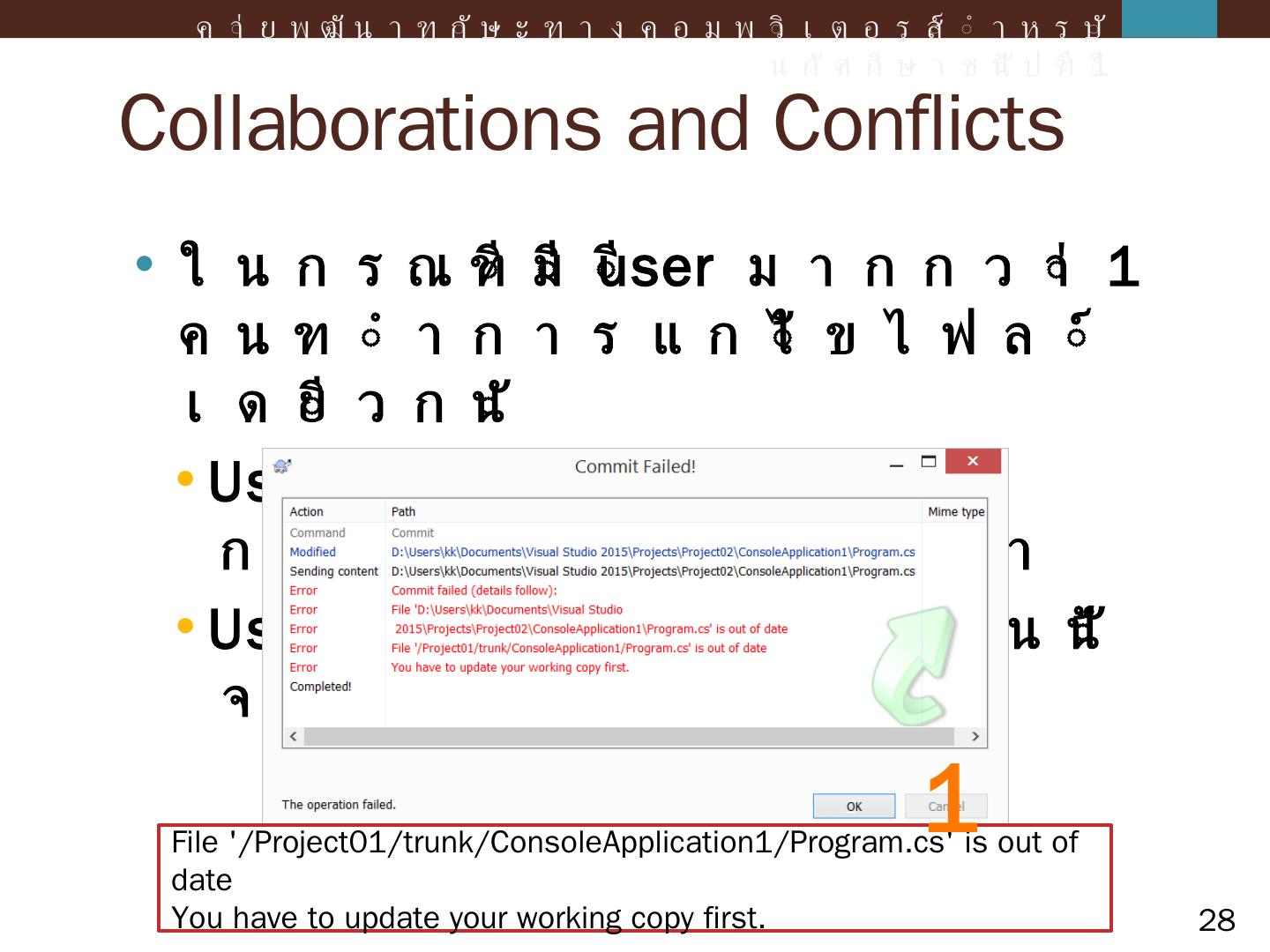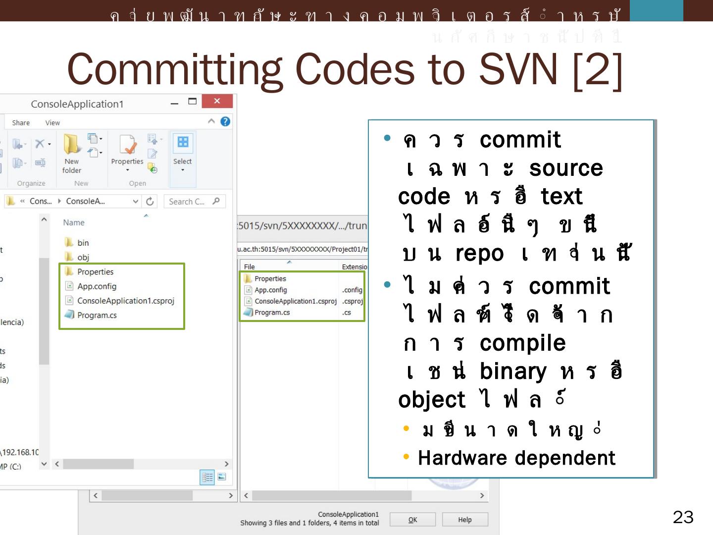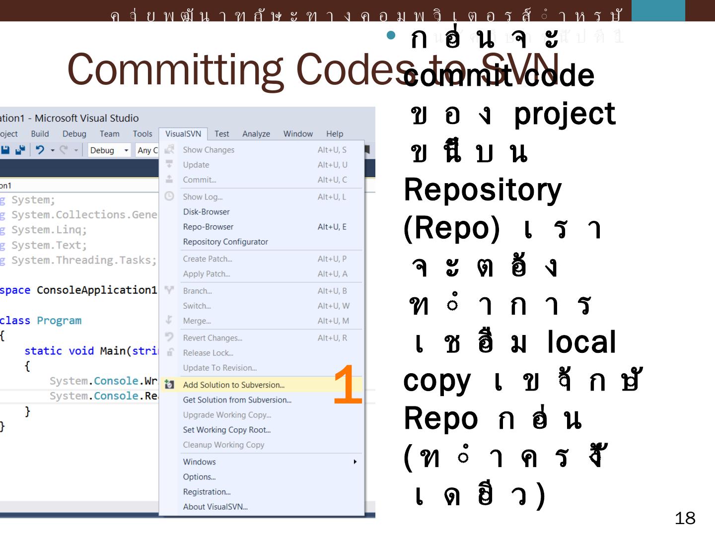 ค่ายพัฒนาทักษะทางคอมพิวเตอร์สำหรับนักศึกษาชั้นปีที่ 1. Agenda. Intro to Revision Control and SVN; Introduction; Console Application; Windows Form Application ...