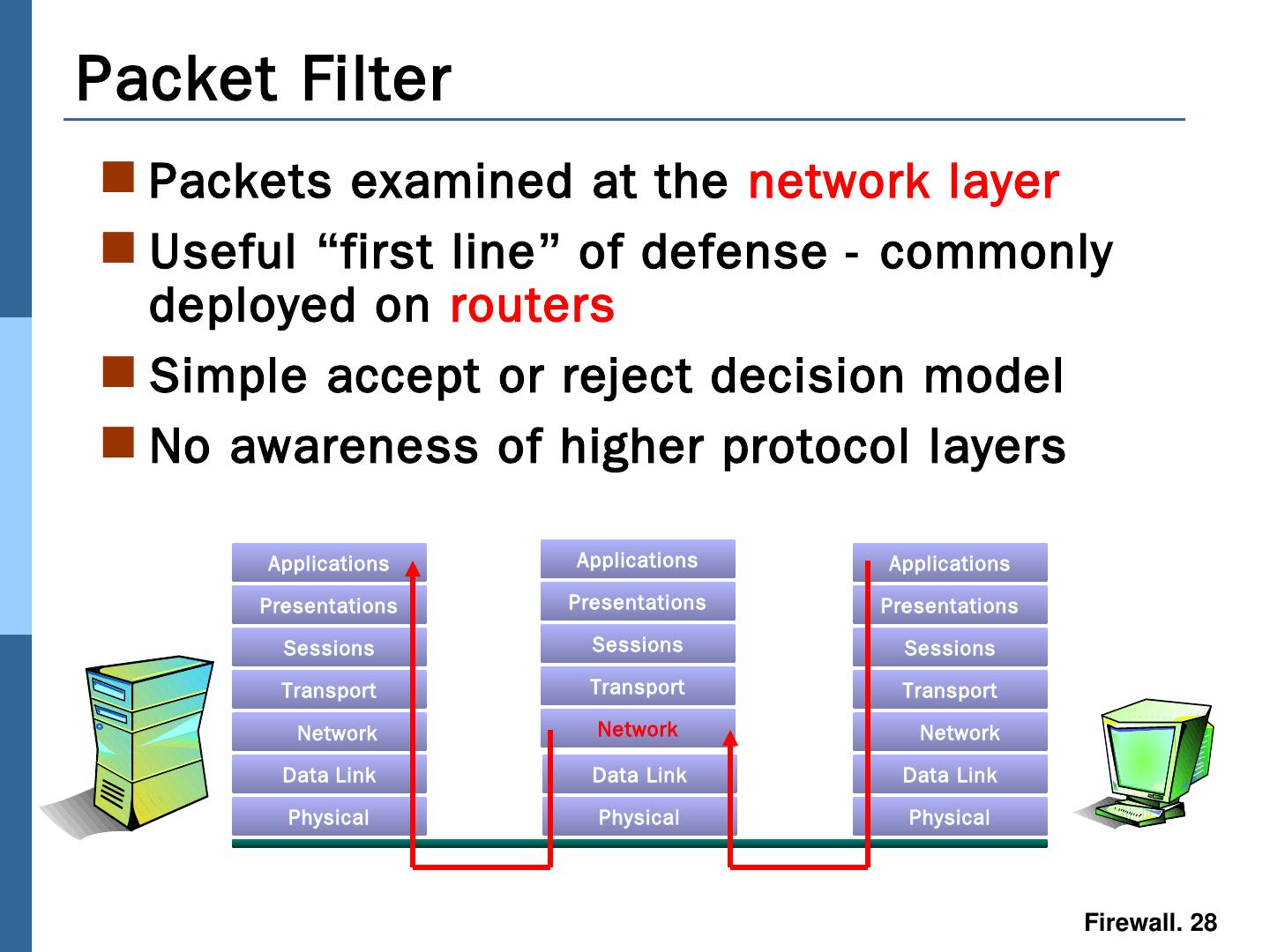 28 .Packets examined at the network layer Useful “ first line ” of defense - commonly deployed on routers Simple accept or reject decision model No awareness of higher protocol layers Packet Filter Applications Presentations Sessions Transport Data Link Physical Data Link Physical Applications Presentations Sessions Transport Data Link Physical Network Presentations Sessions Transport Applications Network Network