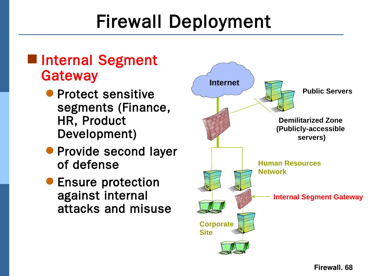 9 .What do Firewalls Protect? Data Proprietary corporate information Financial information Sensitive employee or customer data Resources Computing resources Time resources Bandwidth resources Reputation Loss of confidence in an organization Intruder uses an organization’s network to attack other sites