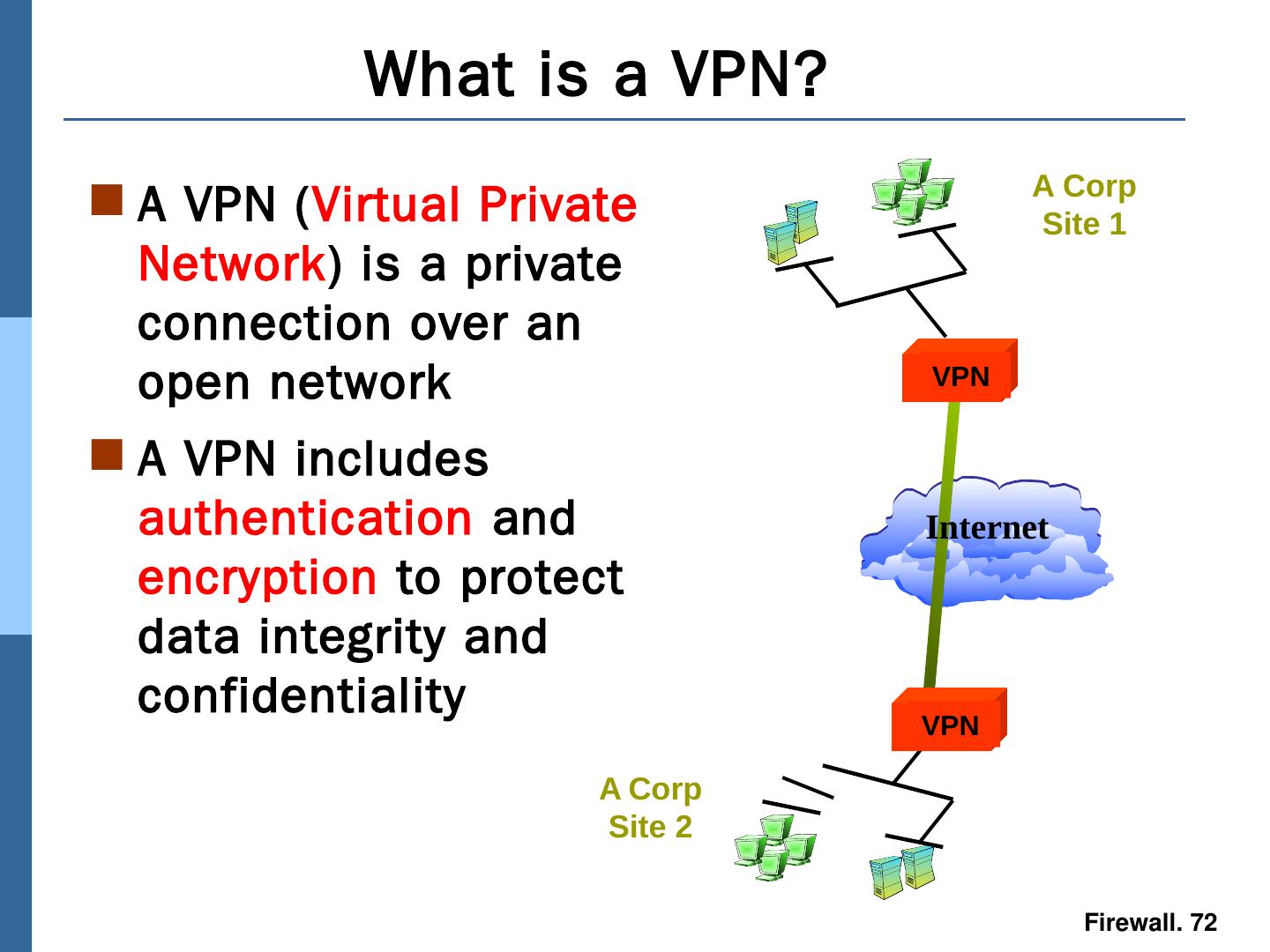 4 .What is a Firewall ? A firewall acts as a security gateway between two networks Usually between trusted and untrusted networks (such as between a corporate network and the Internet) Internet Corporate Site Corporate Network Gateway