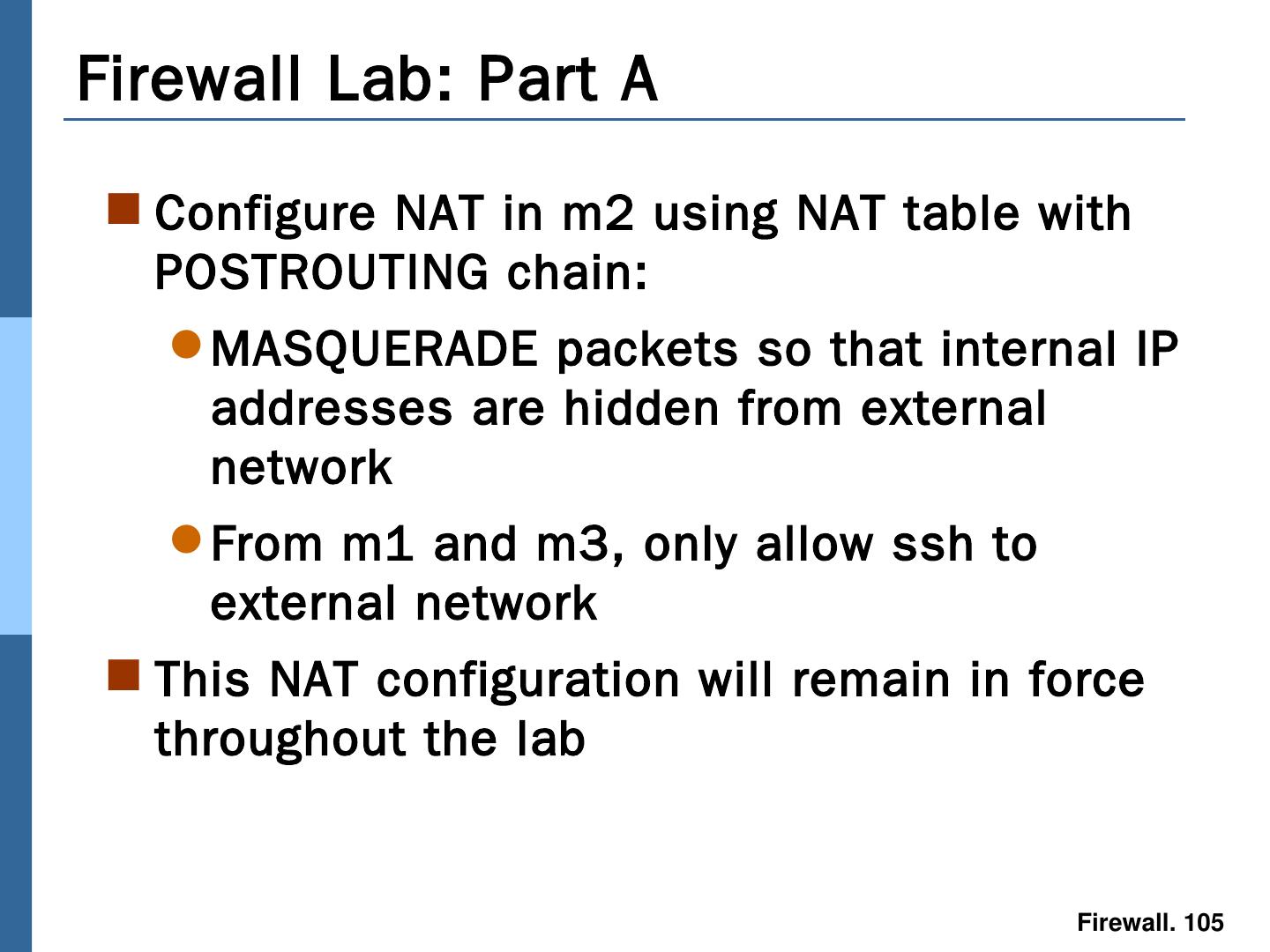 27 .Traditional packet filters source IP address destination IP address source port destination port TCP flag bits SYN bit set: datagram for connection initiation ACK bit set: part of established connection TCP or UDP or ICMP Firewalls often configured to block all UDP direction Is the datagram leaving or entering the internal network? router interface decisions can be different for different interfaces Analyzes each datagram going through it; makes drop decision based on: