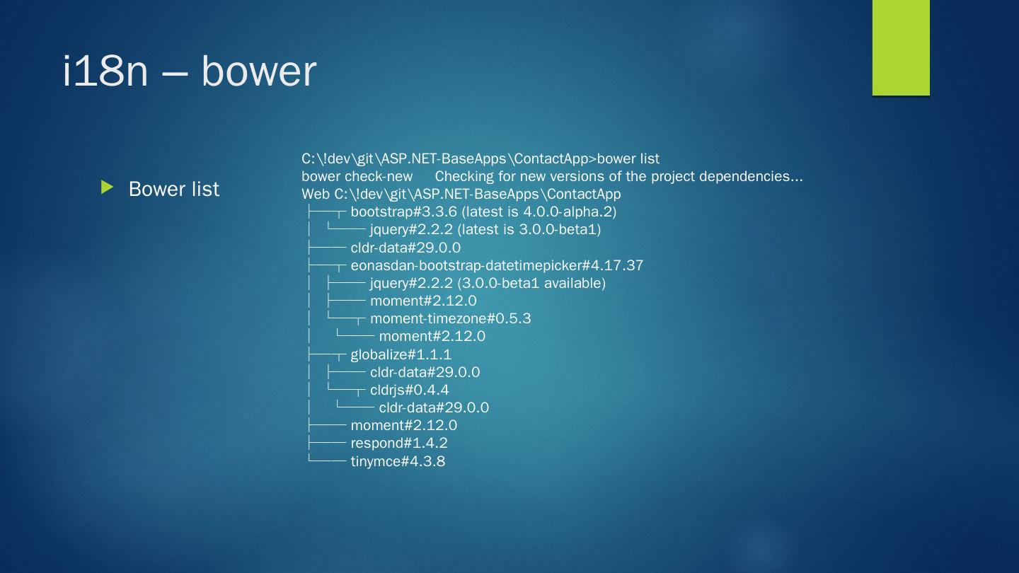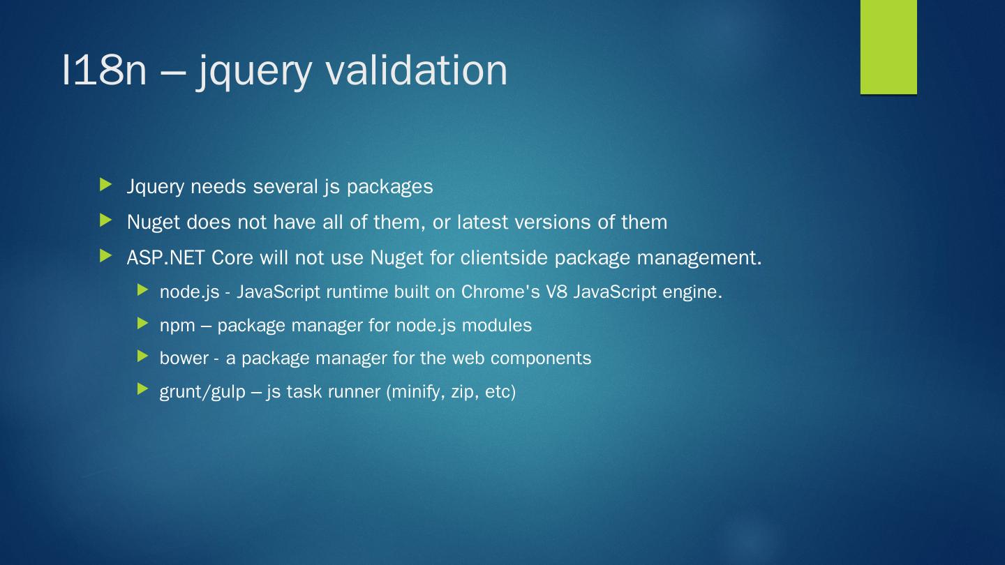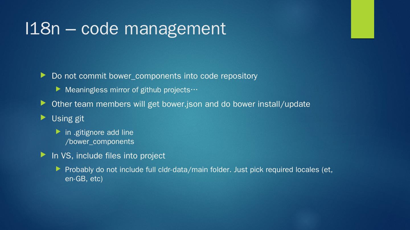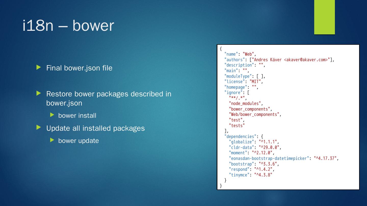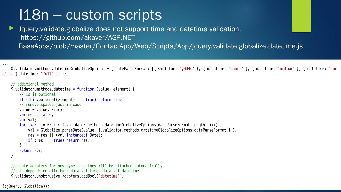Bower install tinymce –save. I18n – custom scripts. Jquery.validate.globalize does not support time and datetime validation. https://github.com/akaver/ASP.