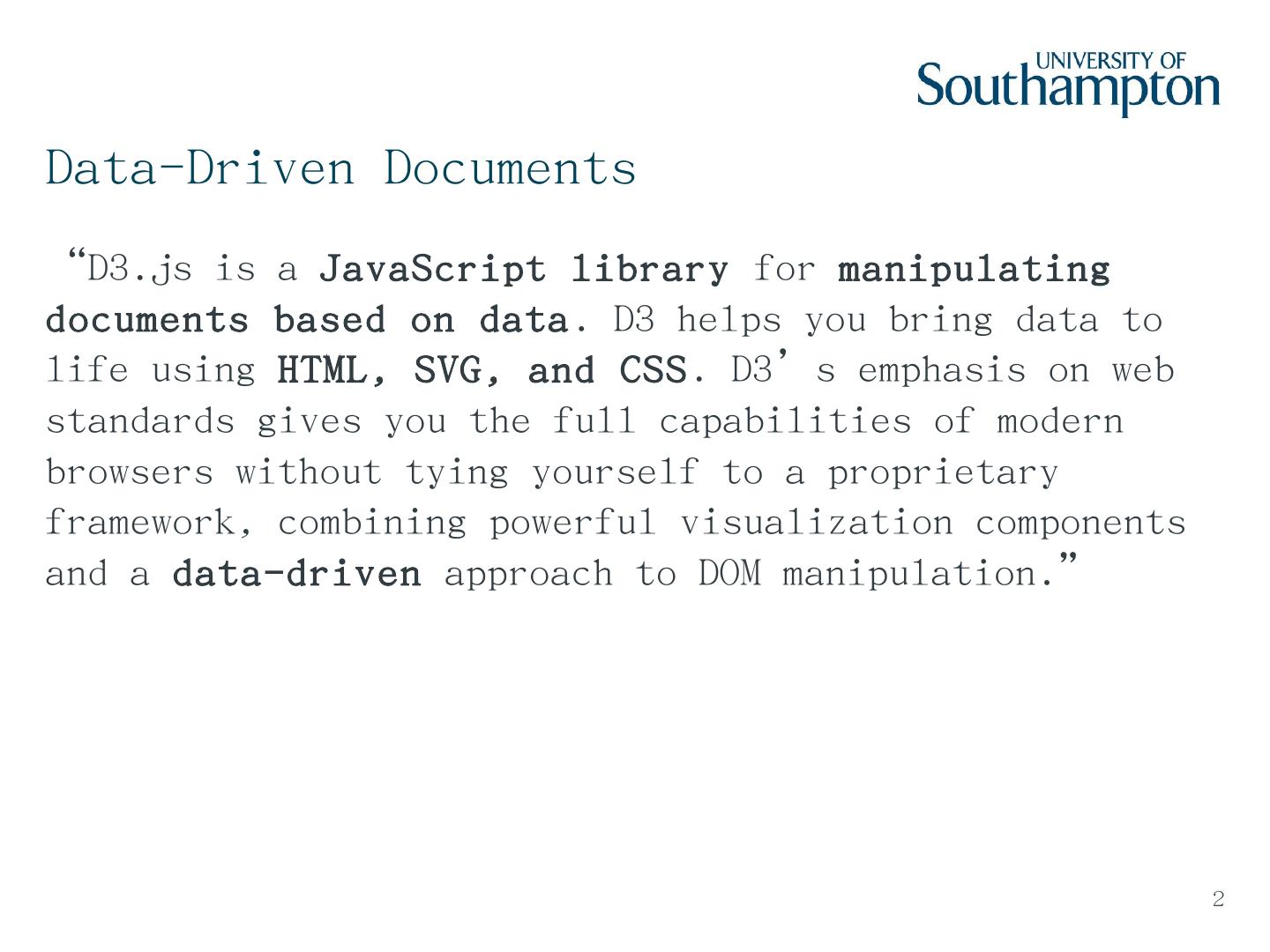 “D3.js is a JavaScript library for manipulating documents based on data. D3 helps you bring data to life using HTML, SVG, and CSS.