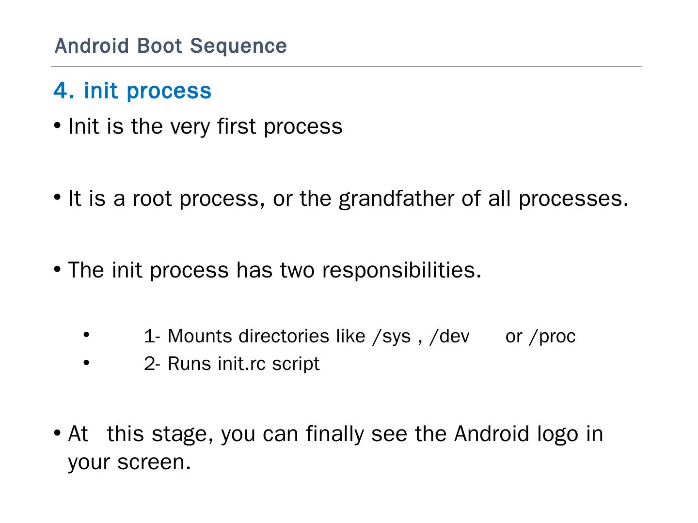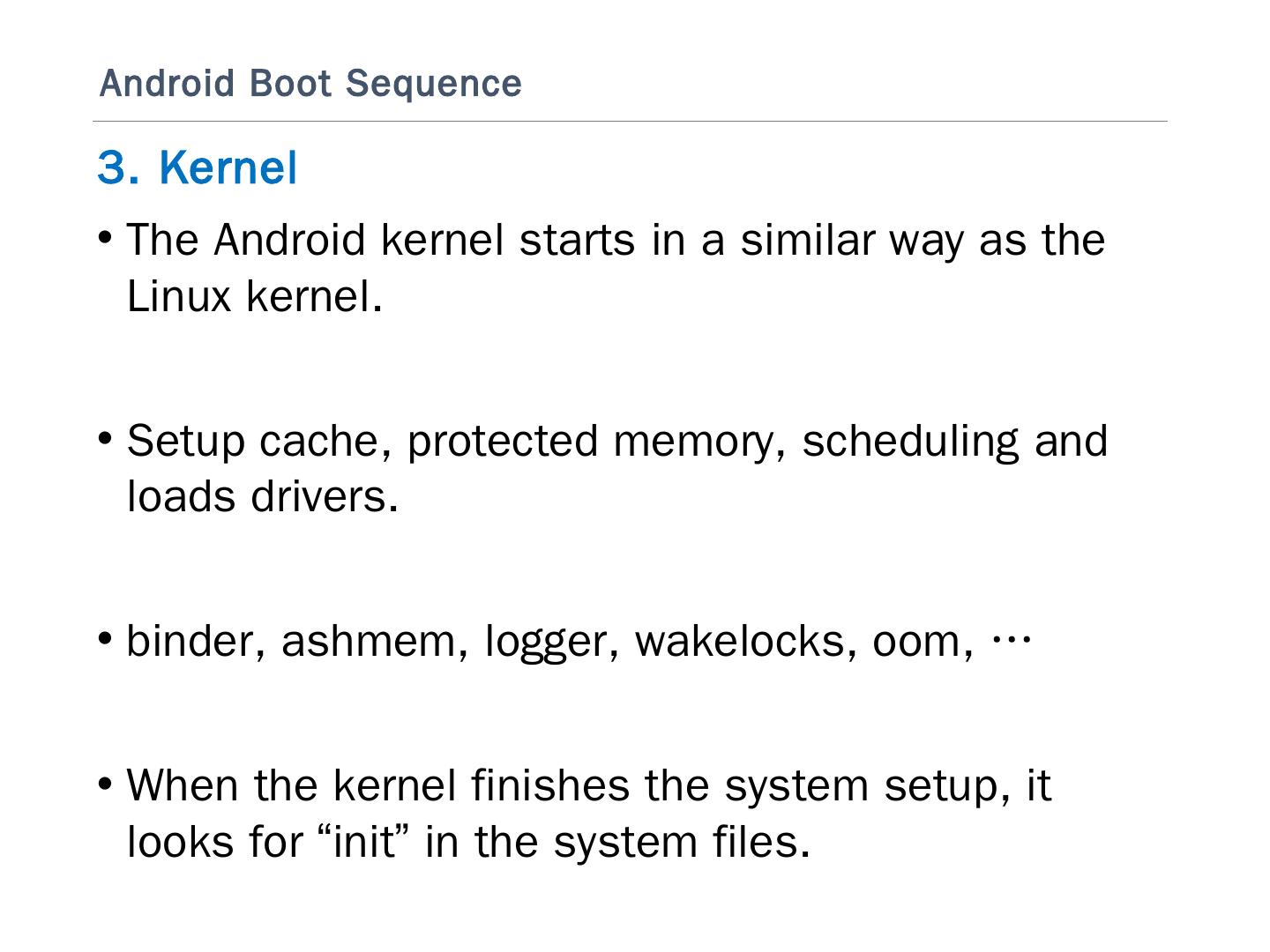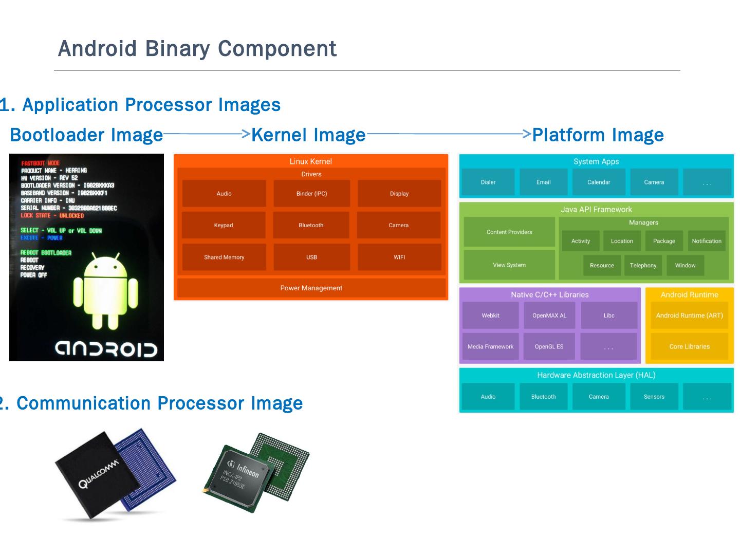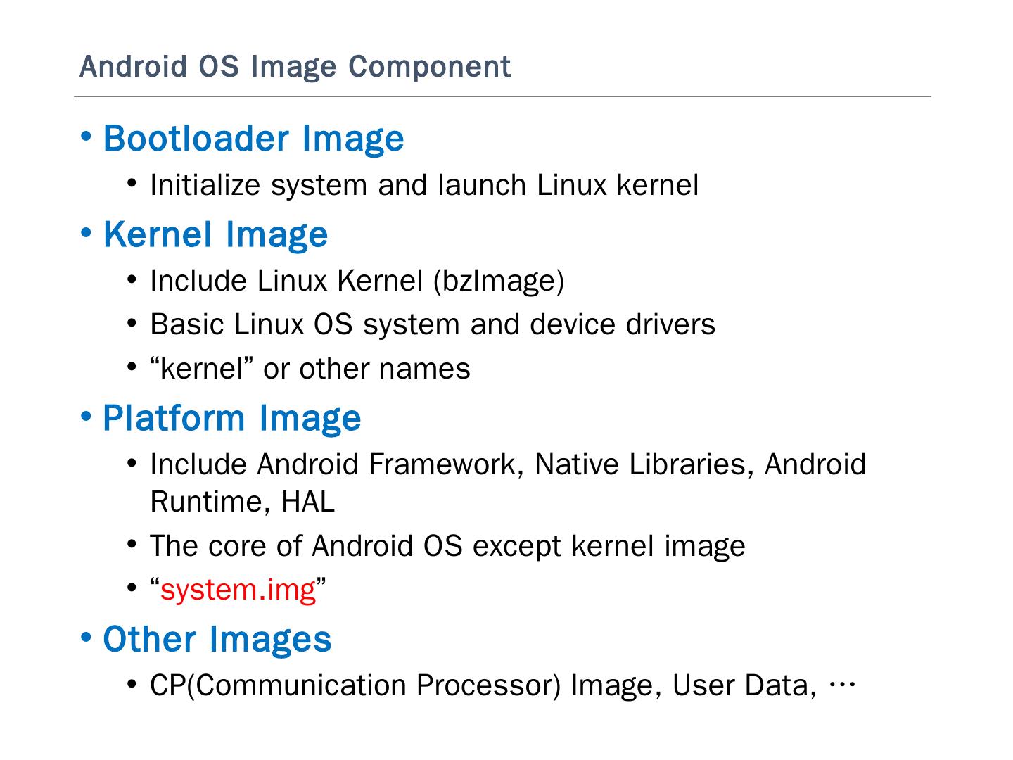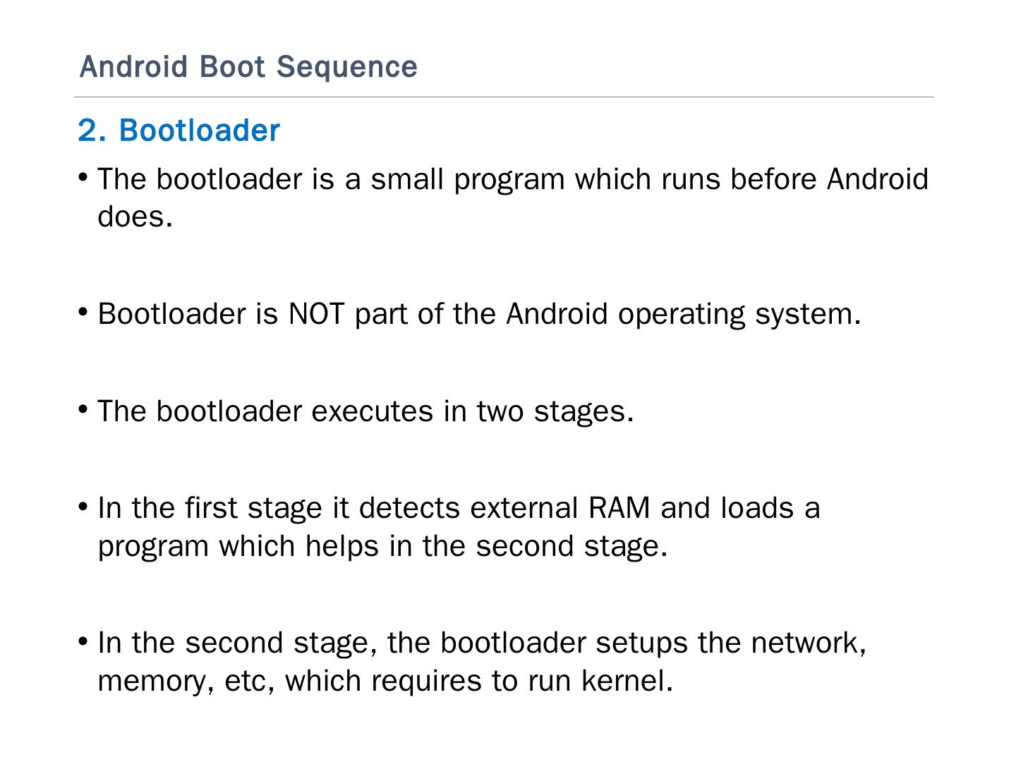 Include Linux Kernel (bzImage); Basic Linux OS system and device ... The bootloader is a small program which runs before Android does.