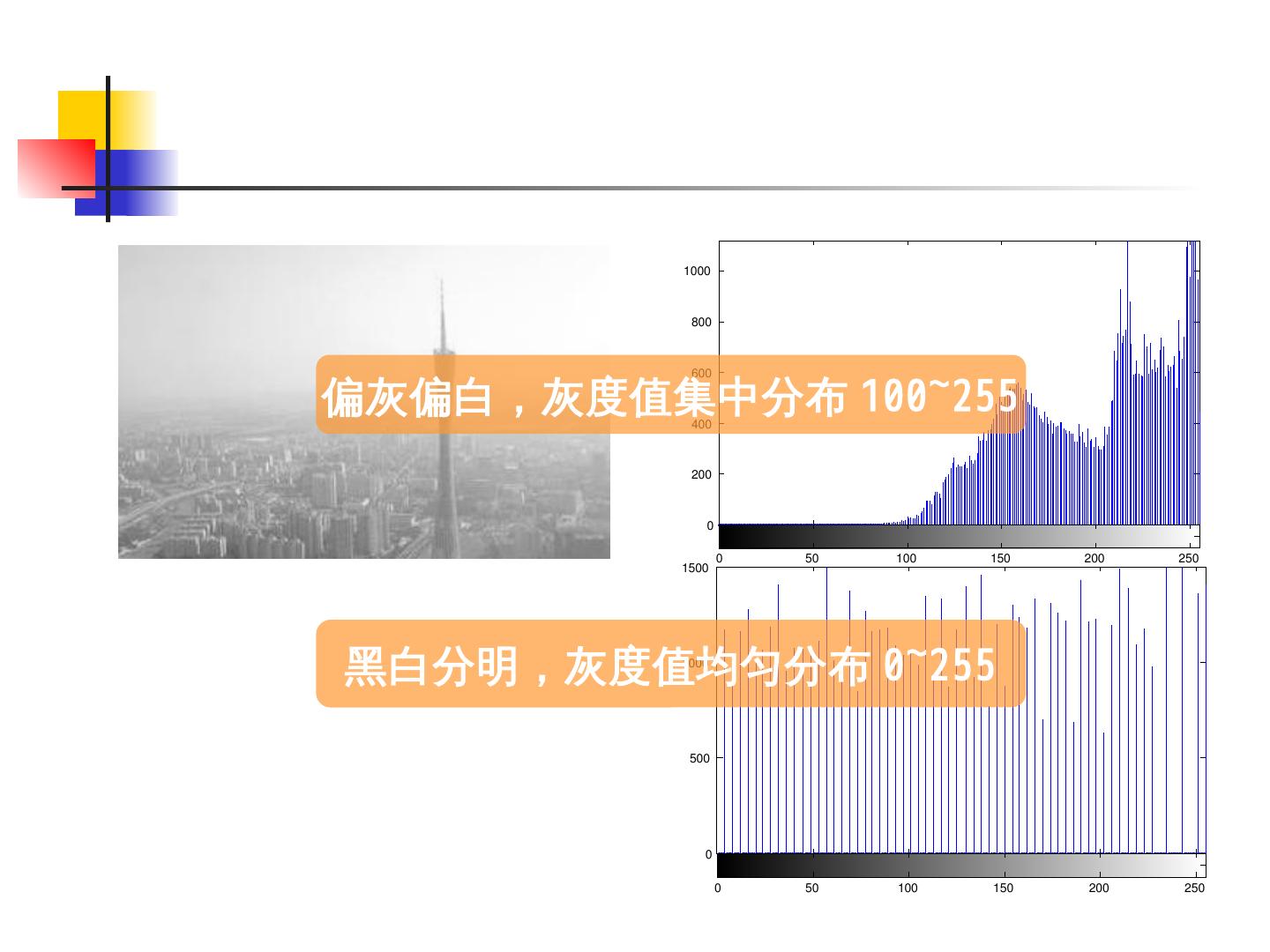 27 .为使变换后的灰度仍保持从黑到白的单一变化顺序,且变换范围与原先一致,以避免整体变亮或变暗。必须规定: ( 1 )在 0≤ r ≤1 中, T ( r ) 是单调递增函数,且 0≤ T ( r )≤1 ; ( 2 )反变换 r = T -1 ( s ) , T -1 ( s ) 也为单调递增函数, 0≤ s ≤1 。 用累计分布函数 (Cumulative Distribution Function, CDF) 作为灰度变换函数 s=T ( r ), 从而将原始图像的关于 灰度 r 的分布直方图 ,转换为关于 灰度 s 的均匀分布 。 累计分布函数