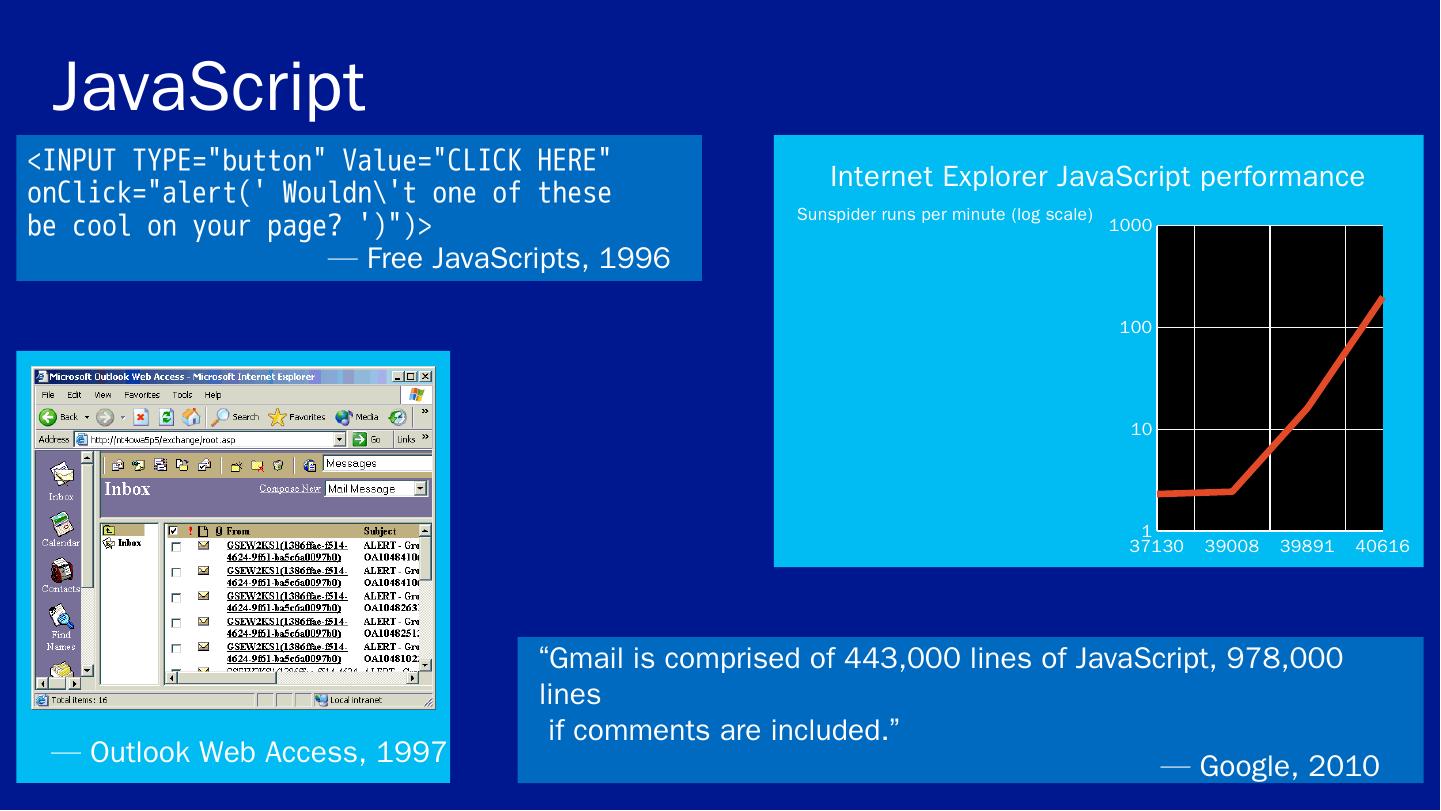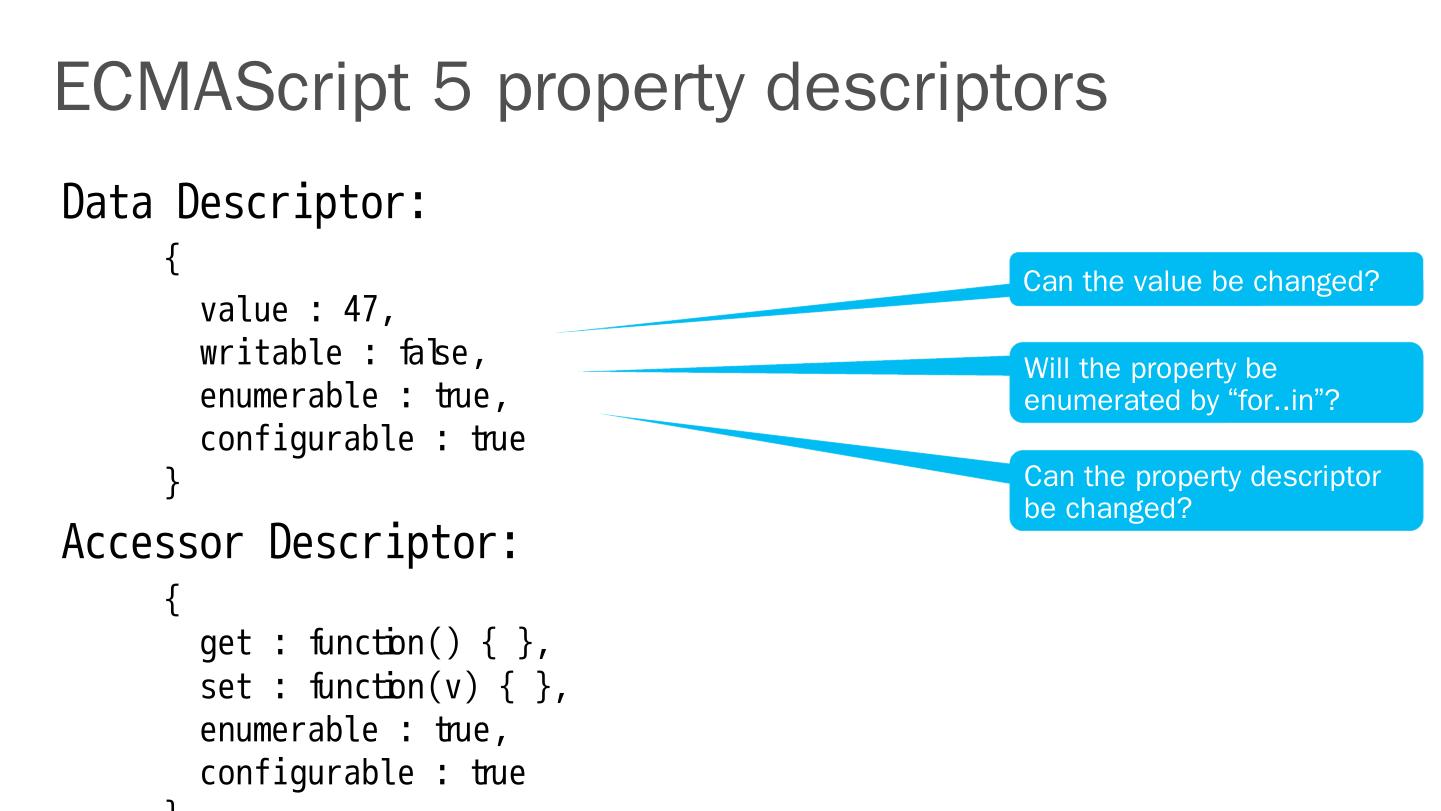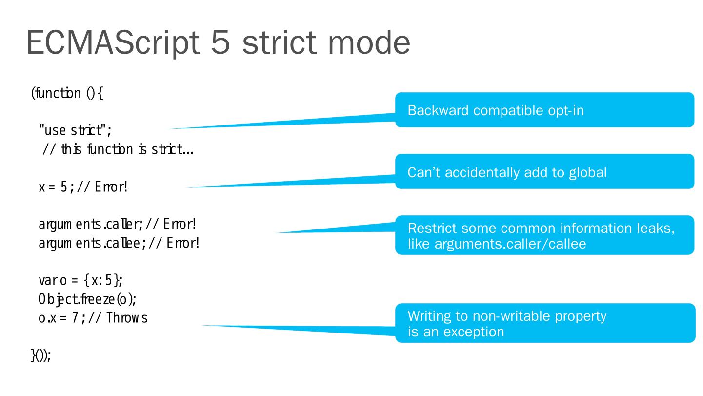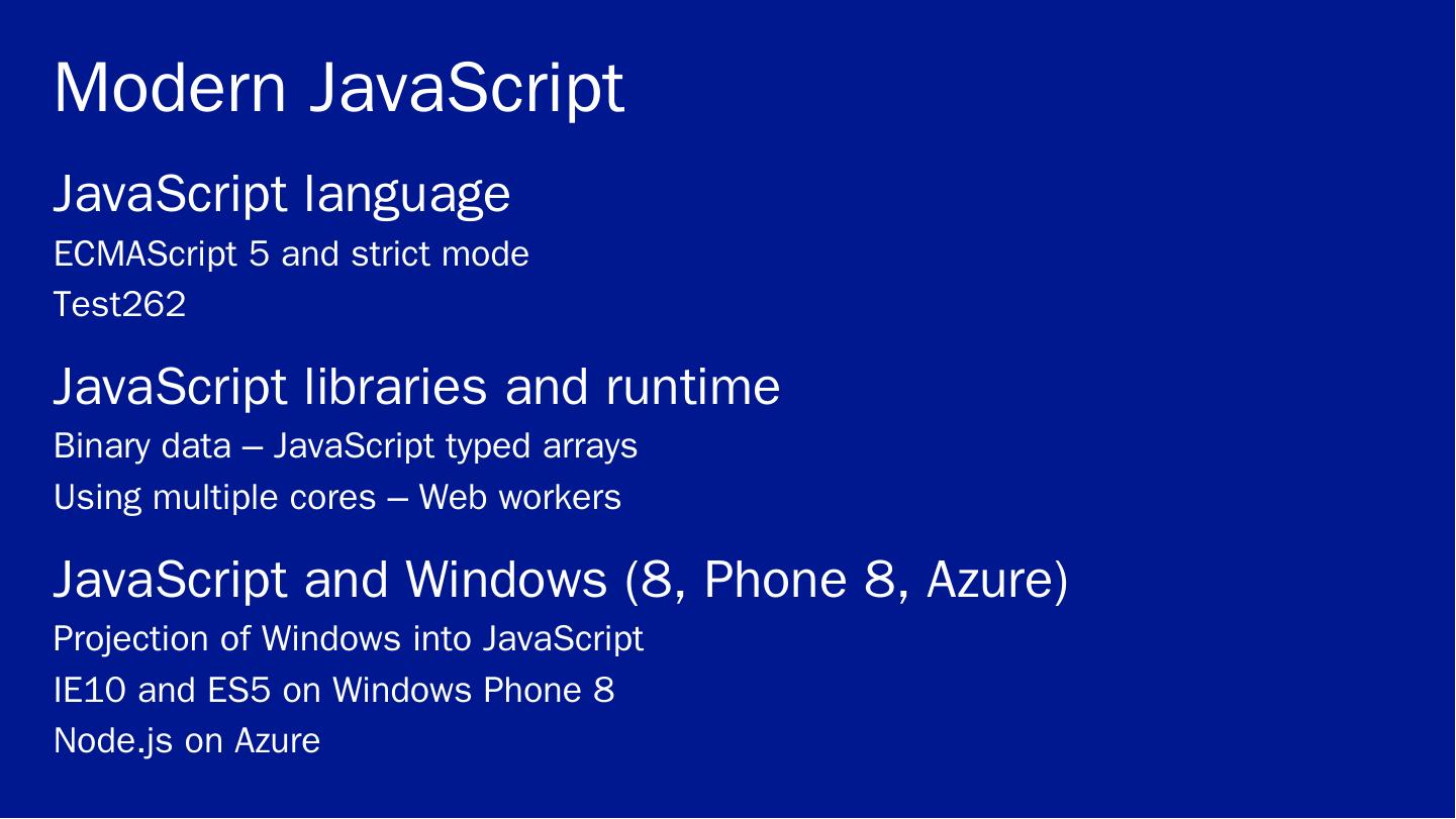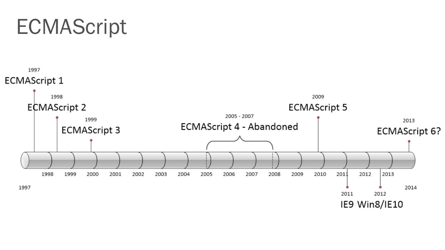 ECMAScript 5 and strict mode. Test262. JavaScript libraries and runtime. Binary data – JavaScript typed arrays. Using multiple cores – Web workers. JavaScript ...