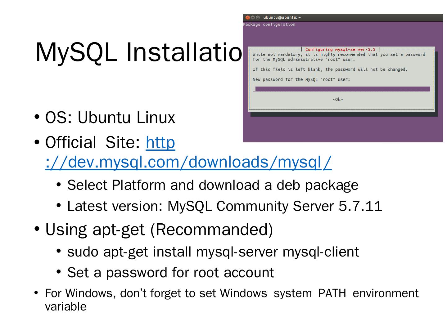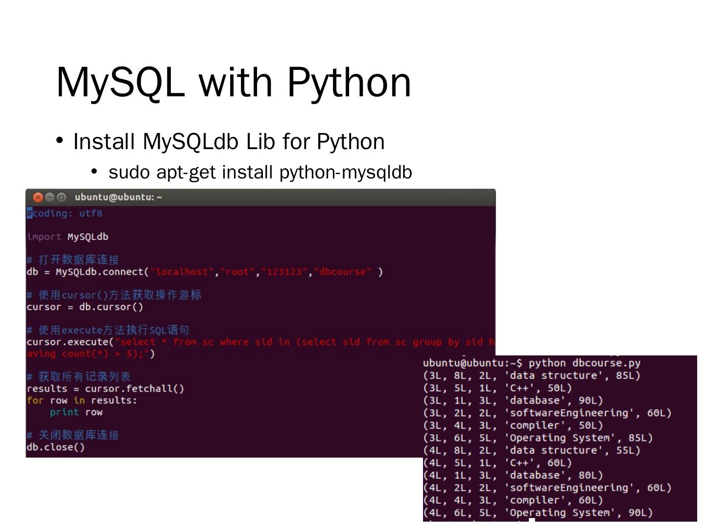 Install MySQLdb Lib for Python. sudo apt-get install python-mysqldb. Web.py. Web.py is a web framework for Python; http://webpy.org/; Installation. sudo apt-get ...