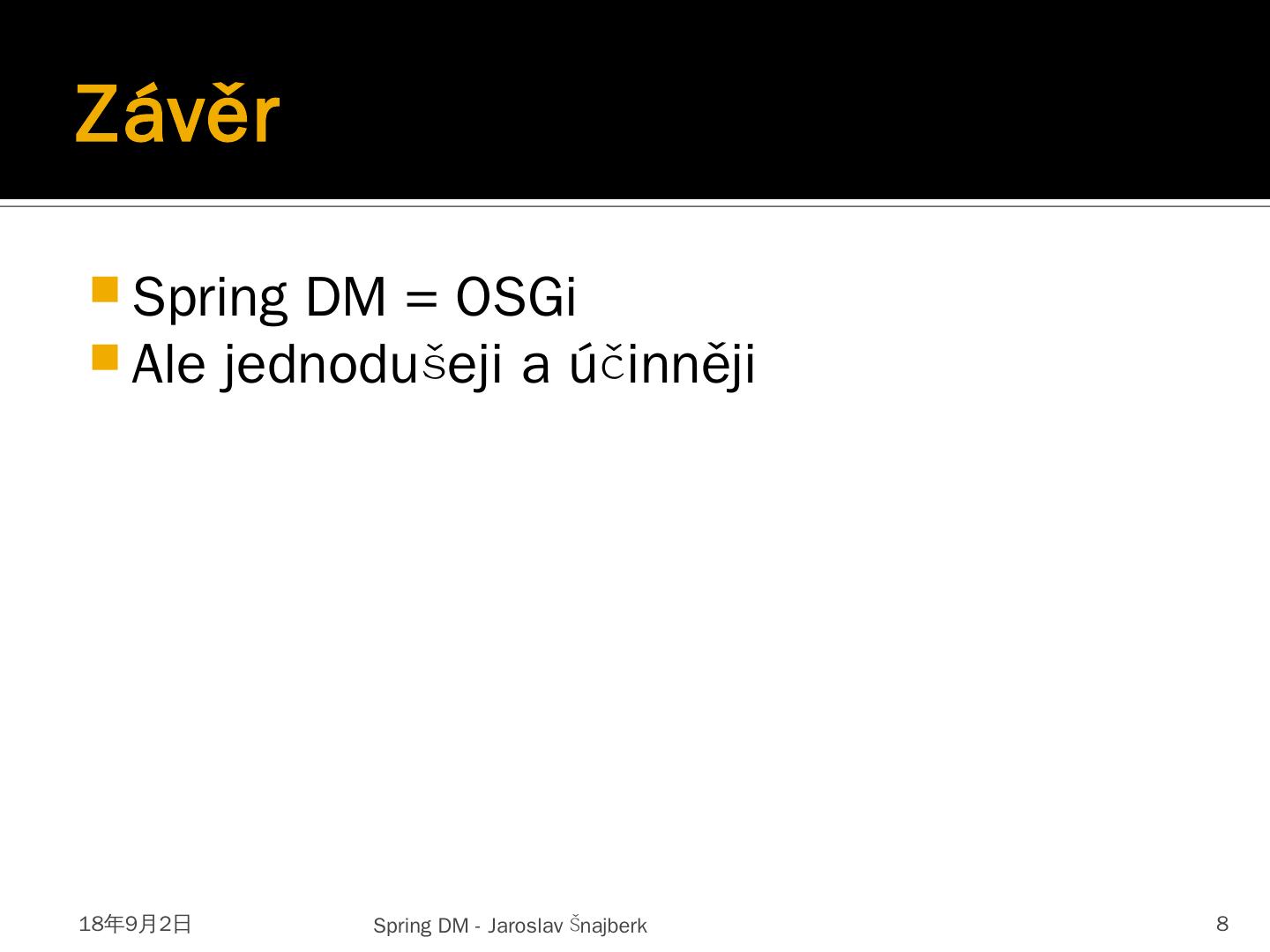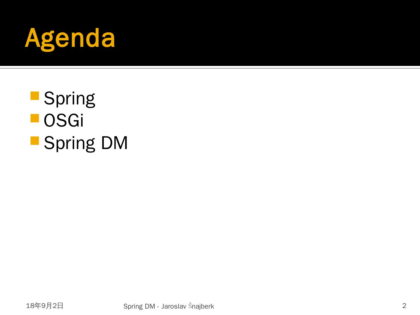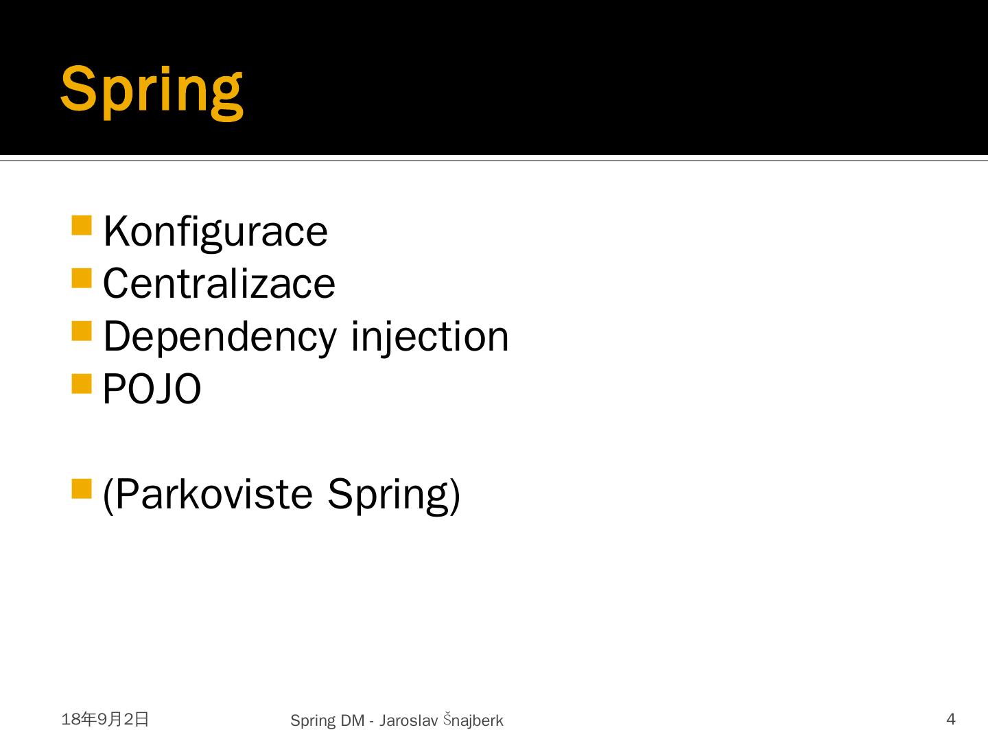 Spring; OSGi; Spring DM. 1/1/97. 2. Spring DM - Jaroslav *najberk. 1/1/97. 3. Spring DM - Jaroslav Šnajberk. Spring. Konfigurace; Centralizace; Dependency ...