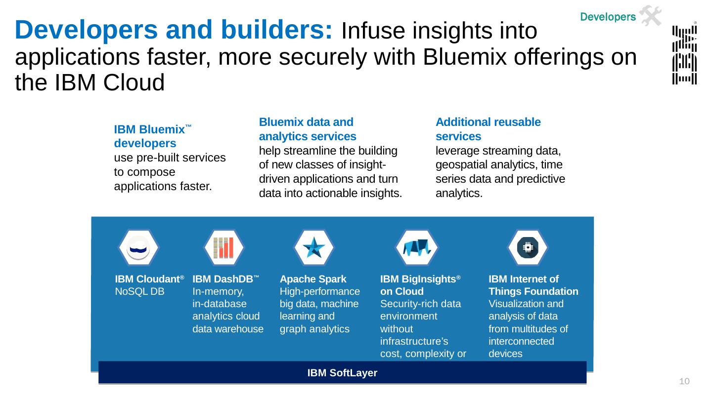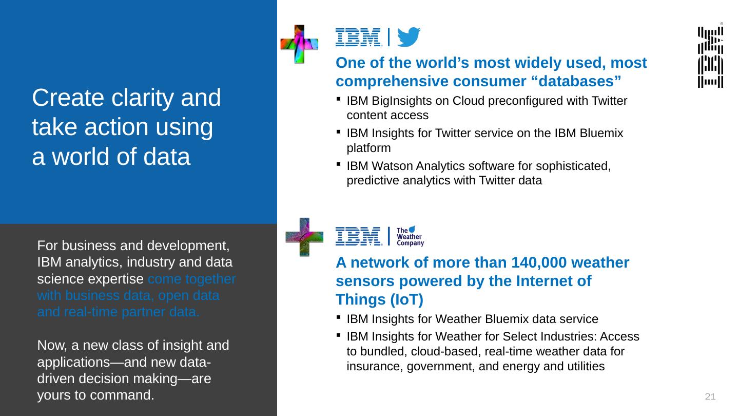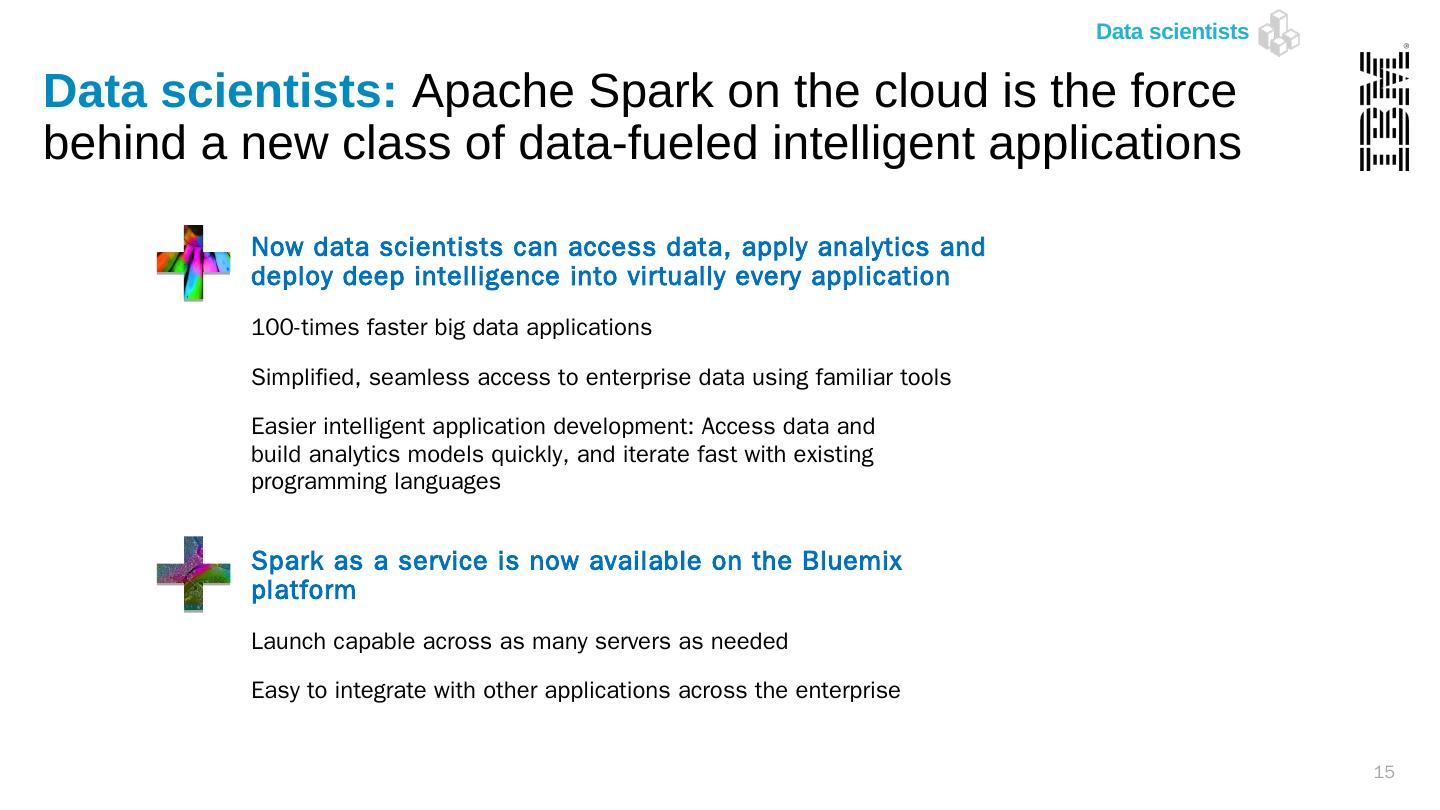In-memory, in-database analytics cloud data warehouse. Apache Spark. High-performance big data, machine learning and graph analytics. IBM BigInsights®
