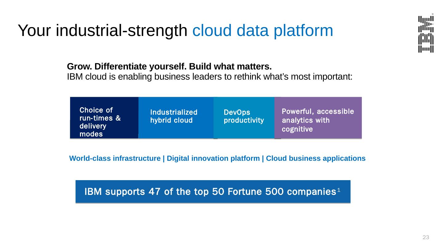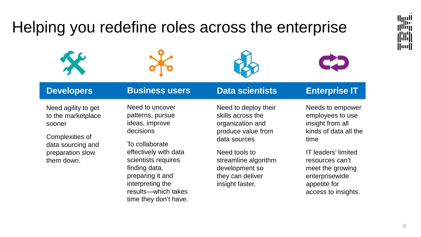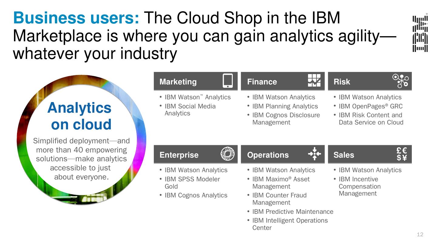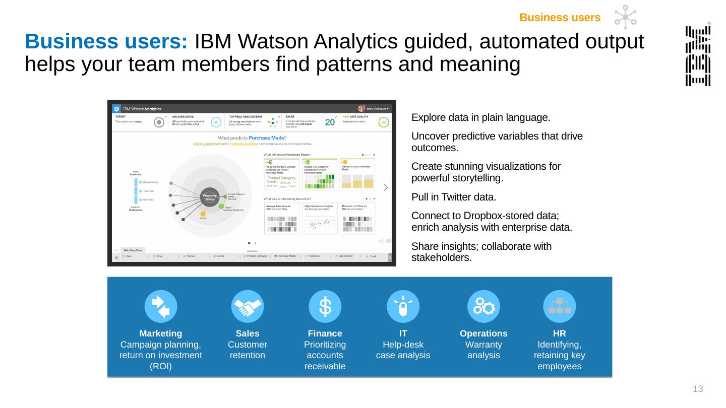 In-memory, in-database analytics cloud data warehouse. Apache Spark. High-performance big data, machine learning and graph analytics. IBM BigInsights®