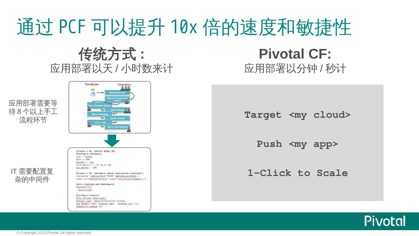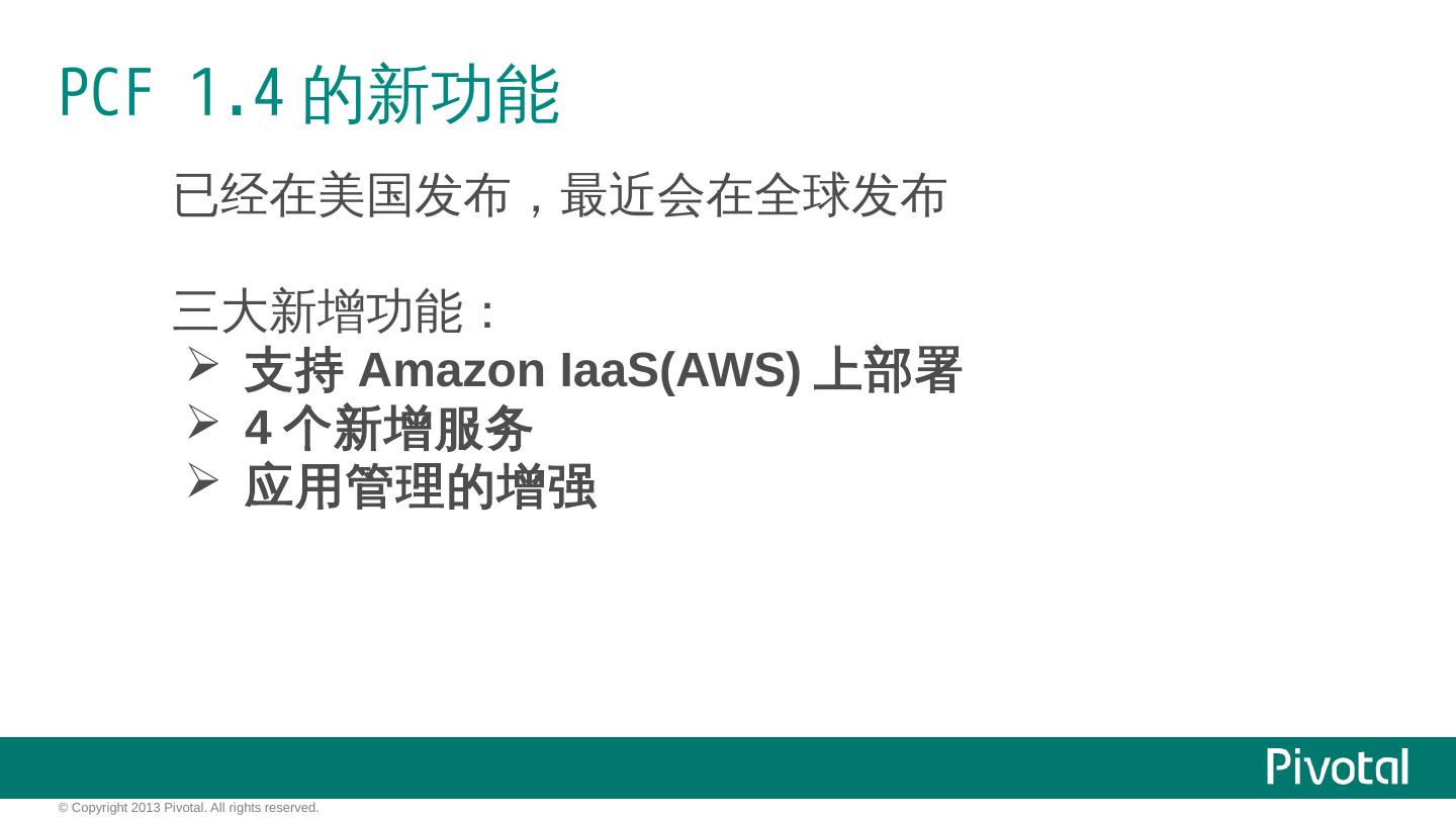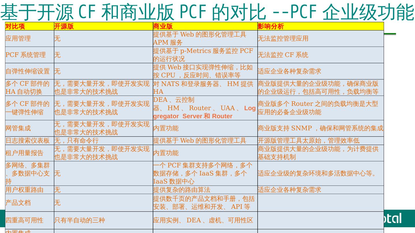 Cloud Foundry解决了什么问题? IaaS: 硬件的自动化管理,人与机器的解耦合 获得效率/提高资源利用率. PaaS: 应用的自动化管理,应用与OS的解耦合 获得弹性/ ...