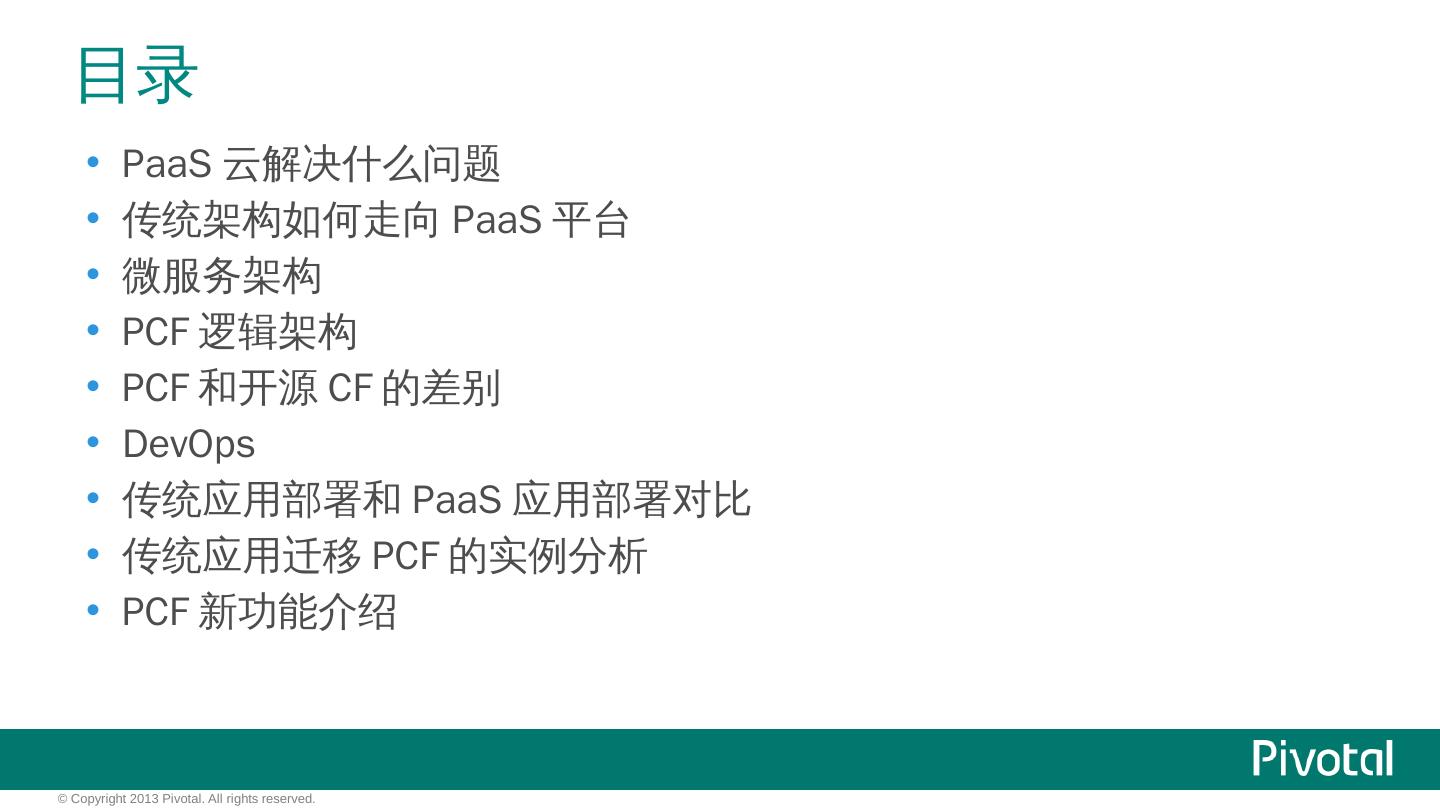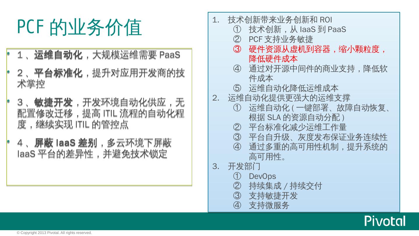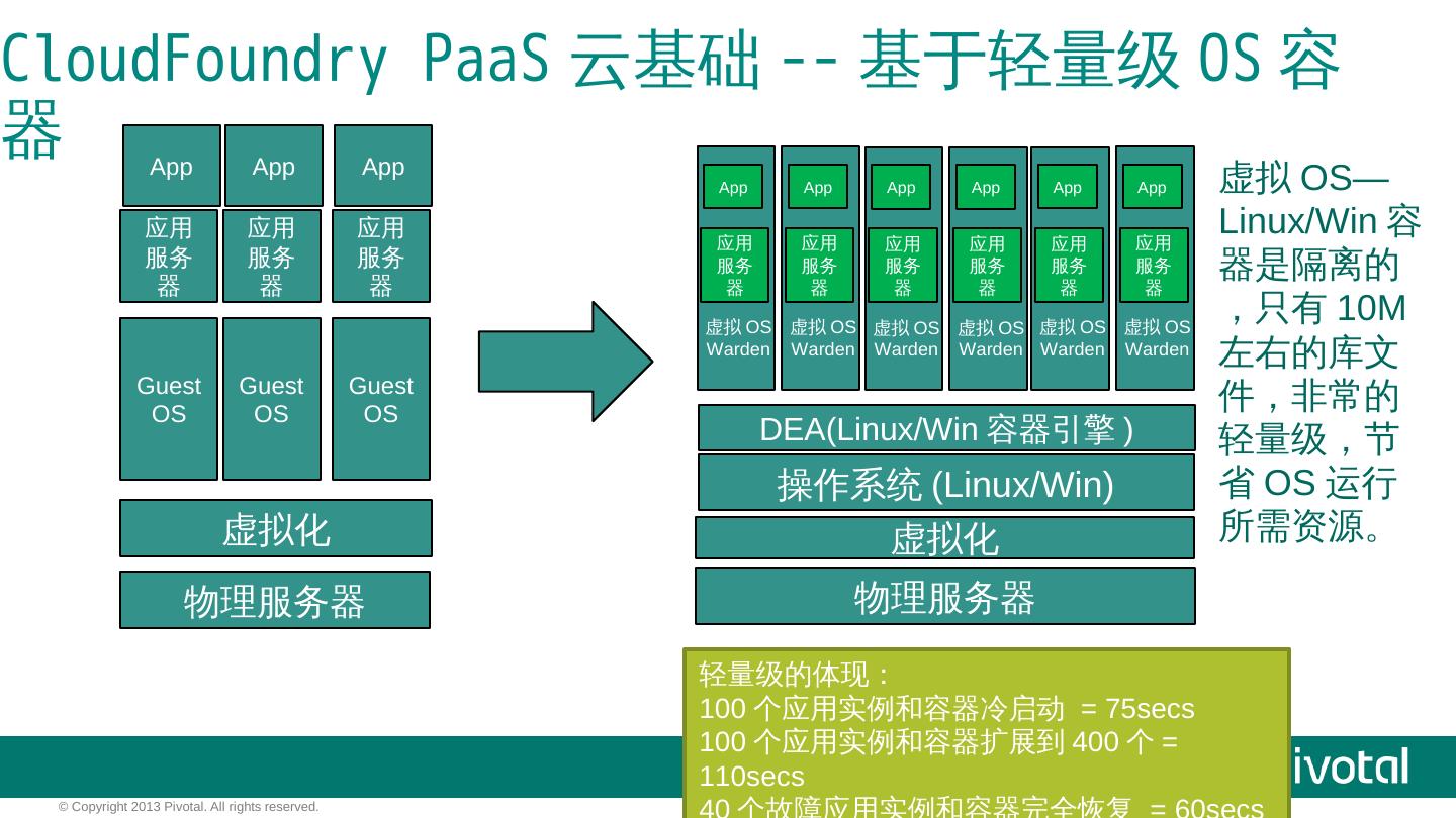 Cloud Foundry解决了什么问题? IaaS: 硬件的自动化管理,人与机器的解耦合 获得效率/提高资源利用率. PaaS: 应用的自动化管理,应用与OS的解耦合 获得弹性/ ...