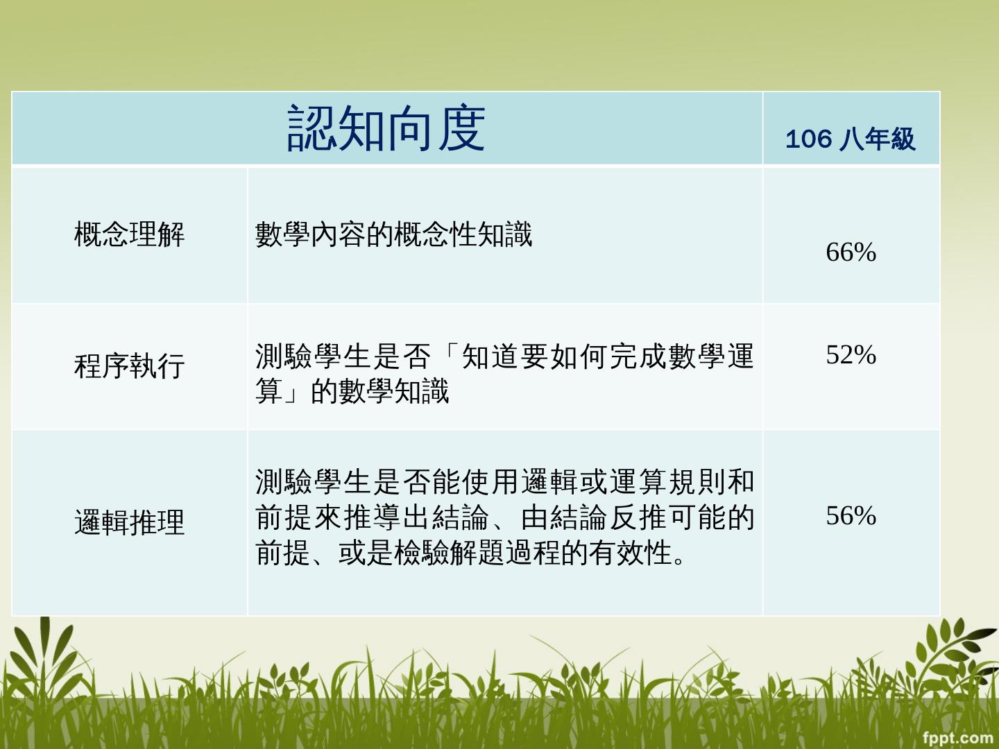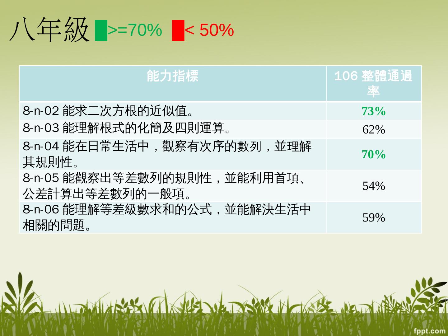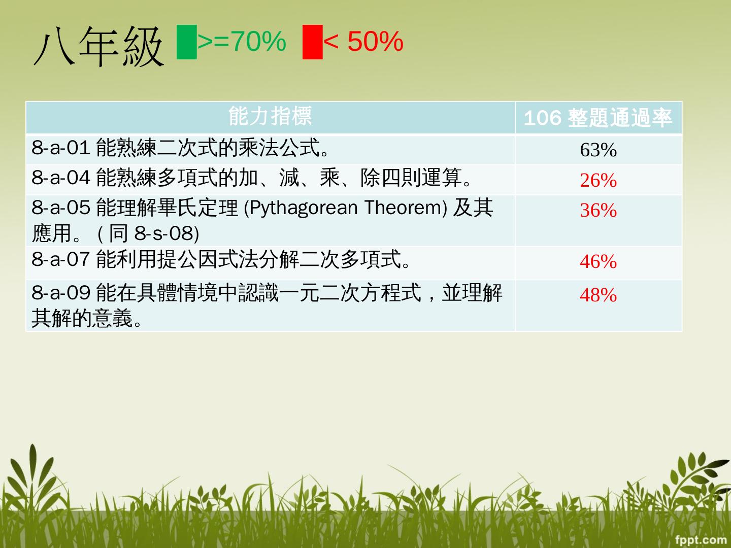 7-n-08能理解數線,數線上兩點的距離公式,及能藉數線上數的位置驗證數的大小關係。 52% ... 7-a-01能熟練符號的意義,及其代數運算。 49%. 7-a-02能用符號算式 ...
