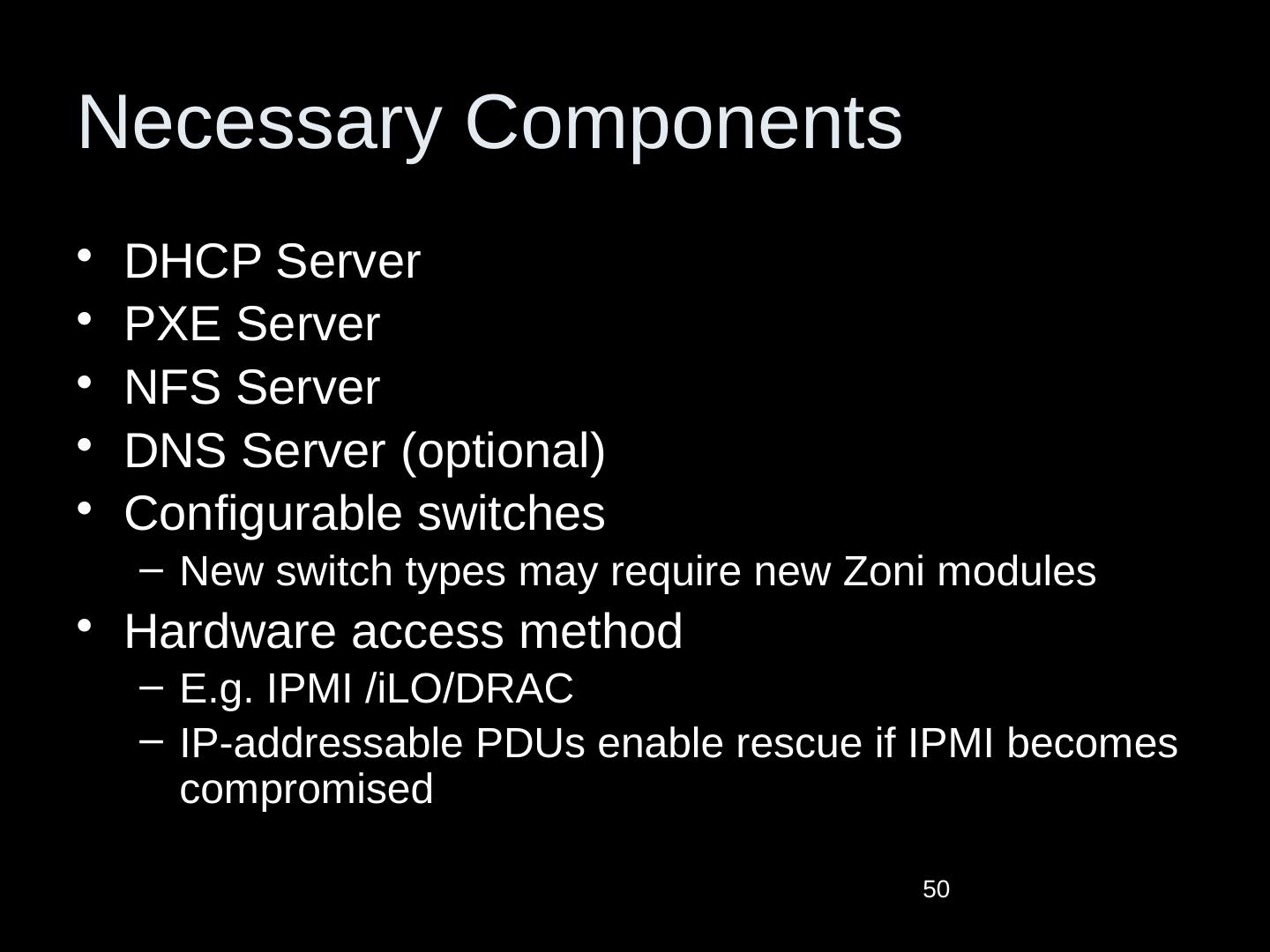 Reachable through python-MySQLdb interface. pExpect used for switch configuration; User information currently obtained through LDAP. 56. Summary. 57. Zoni.
