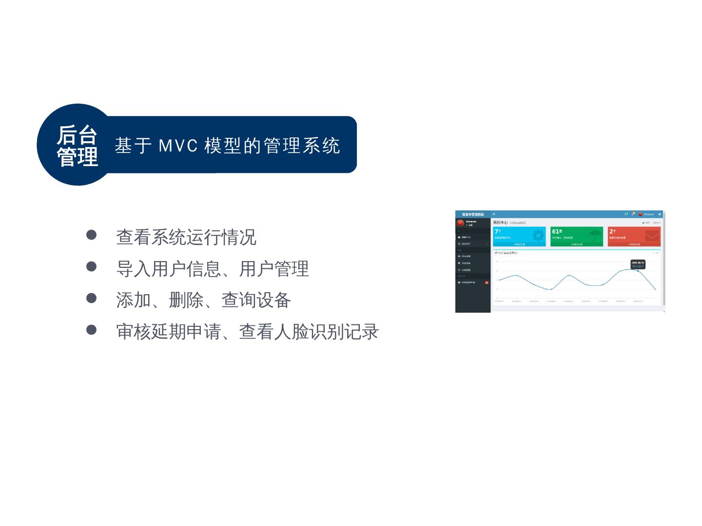 基于MVC模型的管理系统. 查看系统运行情况; 导入用户信息、用户管理; 添加、删除、查询设备; 审核延期申请、查看人脸识别记录. 借还. 寄存. 系统功能拓展. Windows.