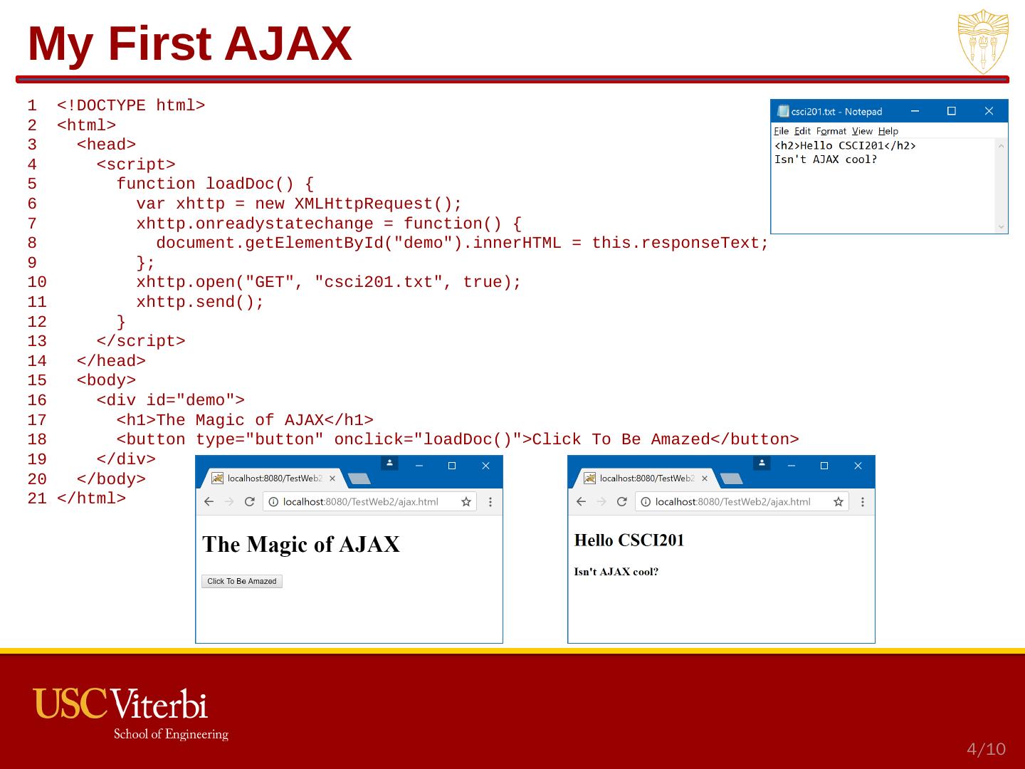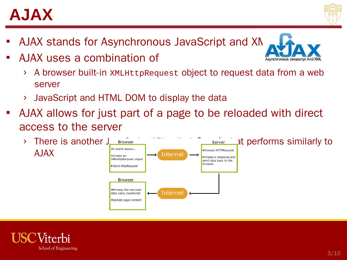 AJAX stands for Asynchronous JavaScript and XML; AJAX uses a combination of. A browser built-in XMLHttpRequest object to request data from a web server ...