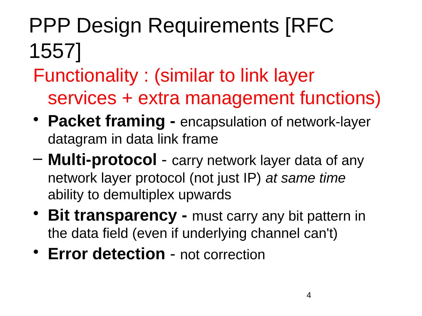 E.g., PPPoE, HDLC encapsulation by Ethernet. 4. PPP Design Requirements [RFC 1557]. Functionality : (similar to link layer services + extra management ...