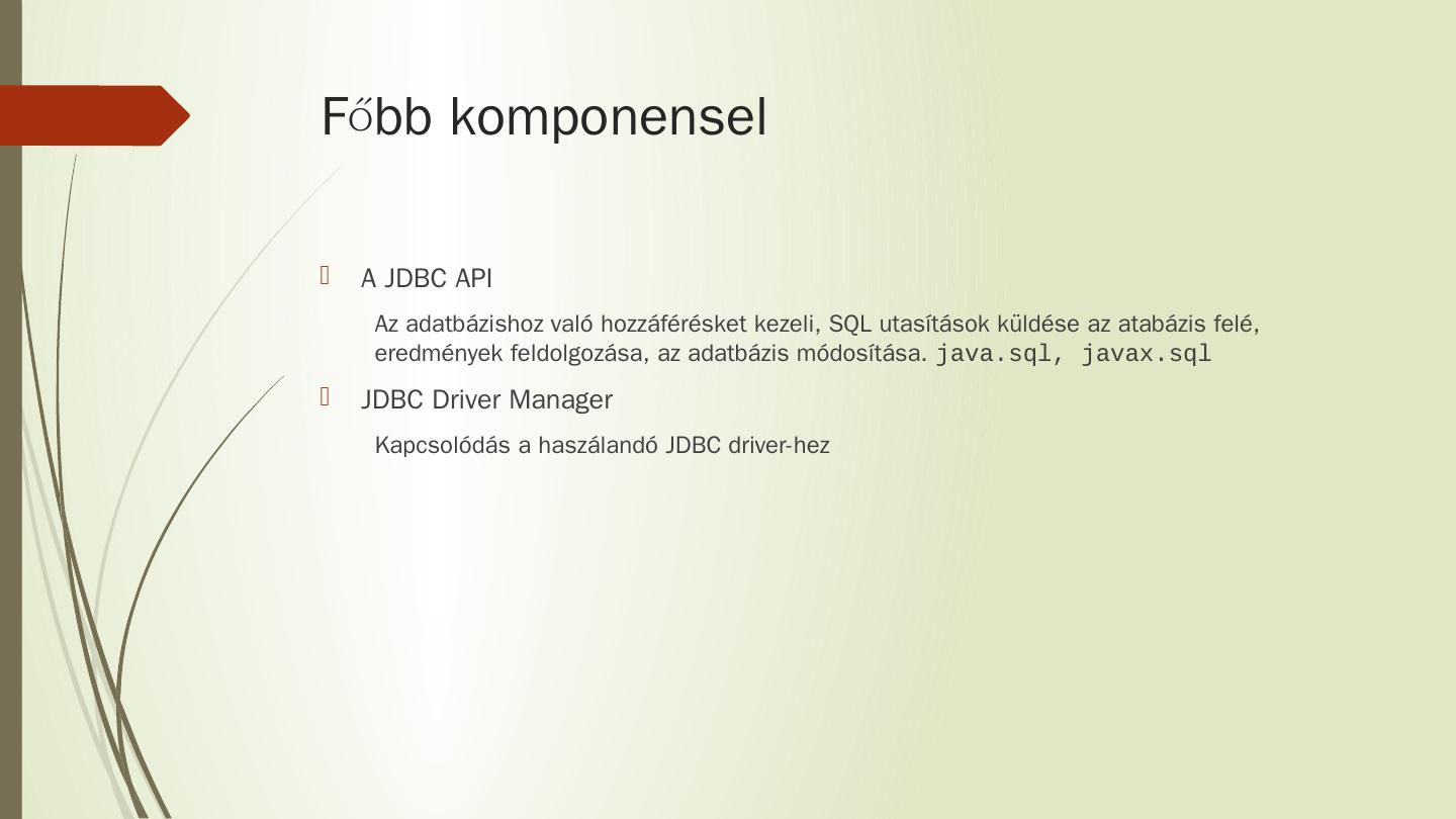 A JDBC API. Az adatbázishoz való hozzáférésket kezeli, SQL utasítások küldése az atabázis felé, eredmények feldolgozása, az adatbázis módosítása. java.sql, ...