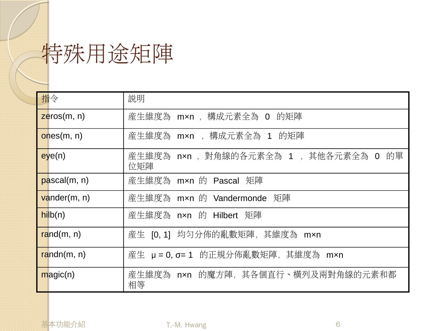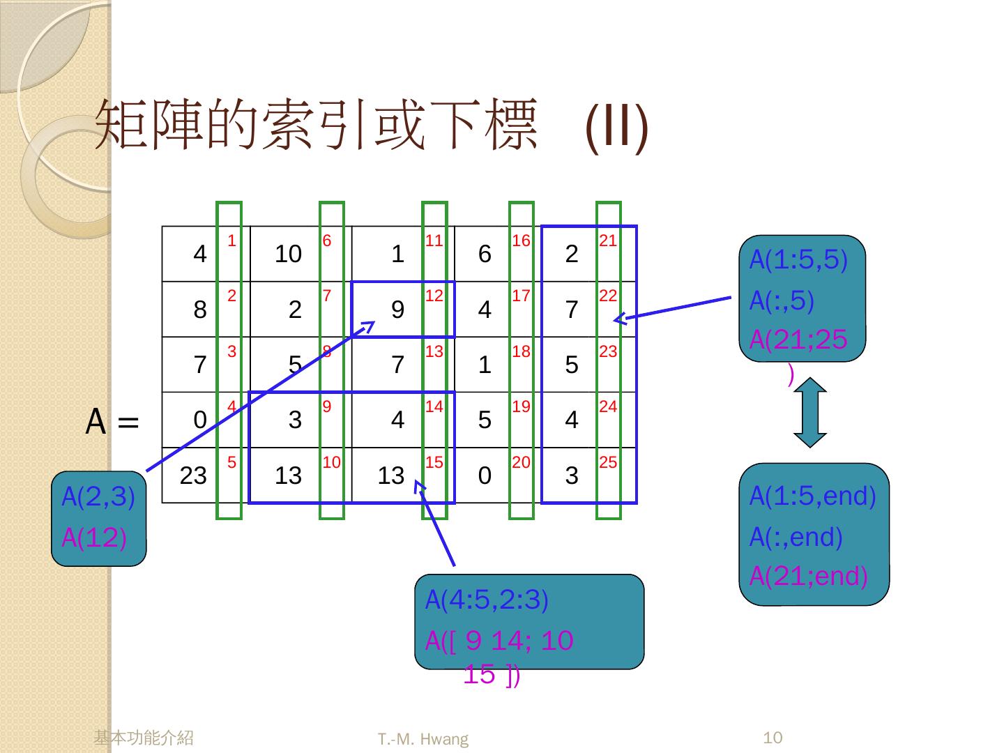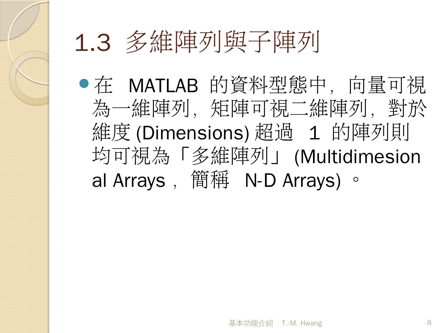 在 MATLAB 的資料型態中,向量可視為一維陣列,矩陣可視二維陣列,對於維度(Dimensions)超過1 的陣列則均可視為「多維陣列」(Multidimesional Arrays,簡稱N-D ...