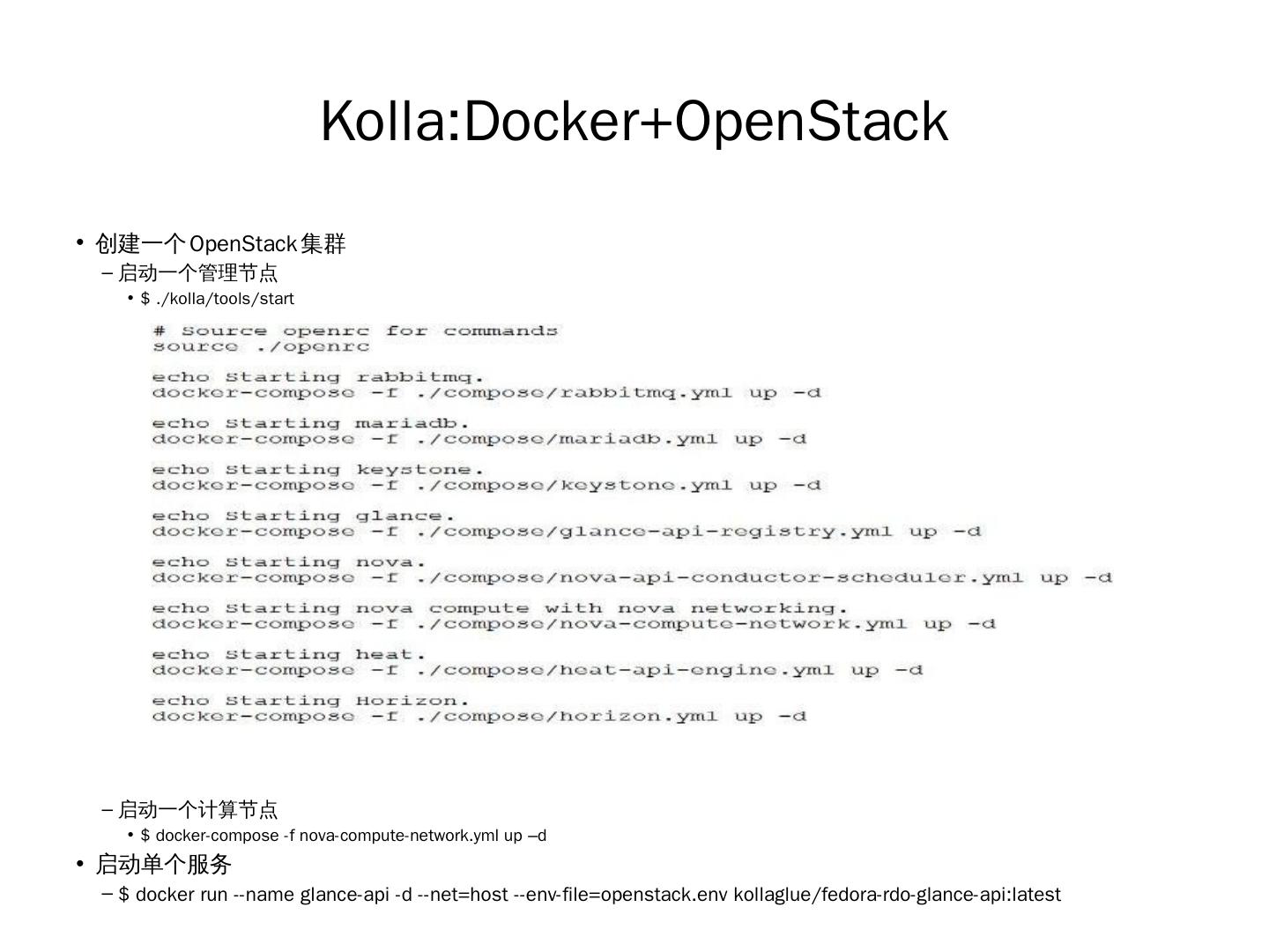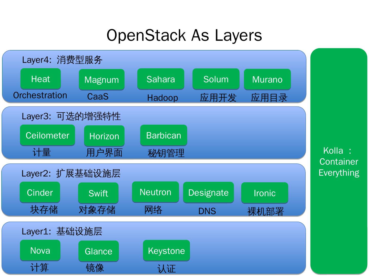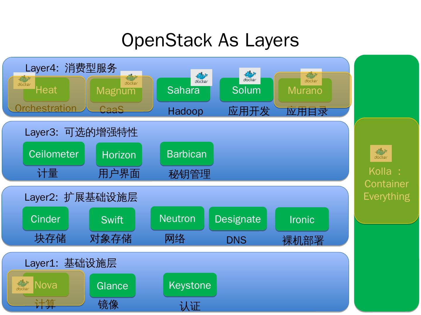 Kolla: Container Everything. OpenStack As Layers. Nova. Glance. Keystone. 计算. 镜像. 认证. Layer1: 基础设施层. Cinder. Swift. Neutron. 块存储. 对象存储. 网络.