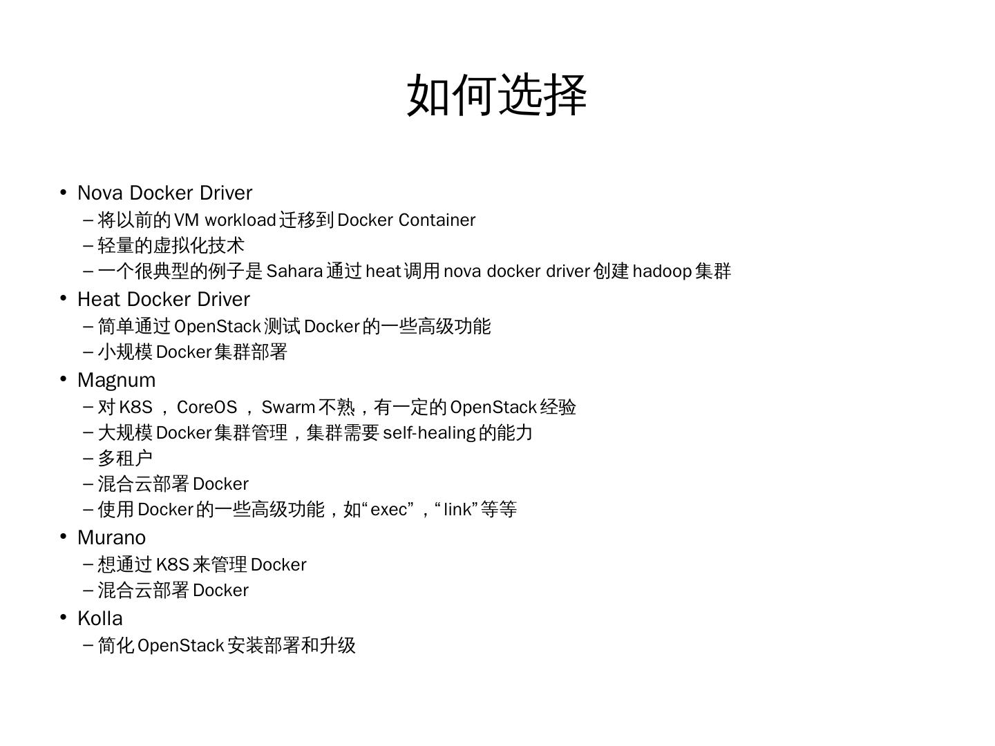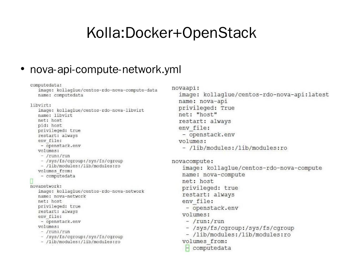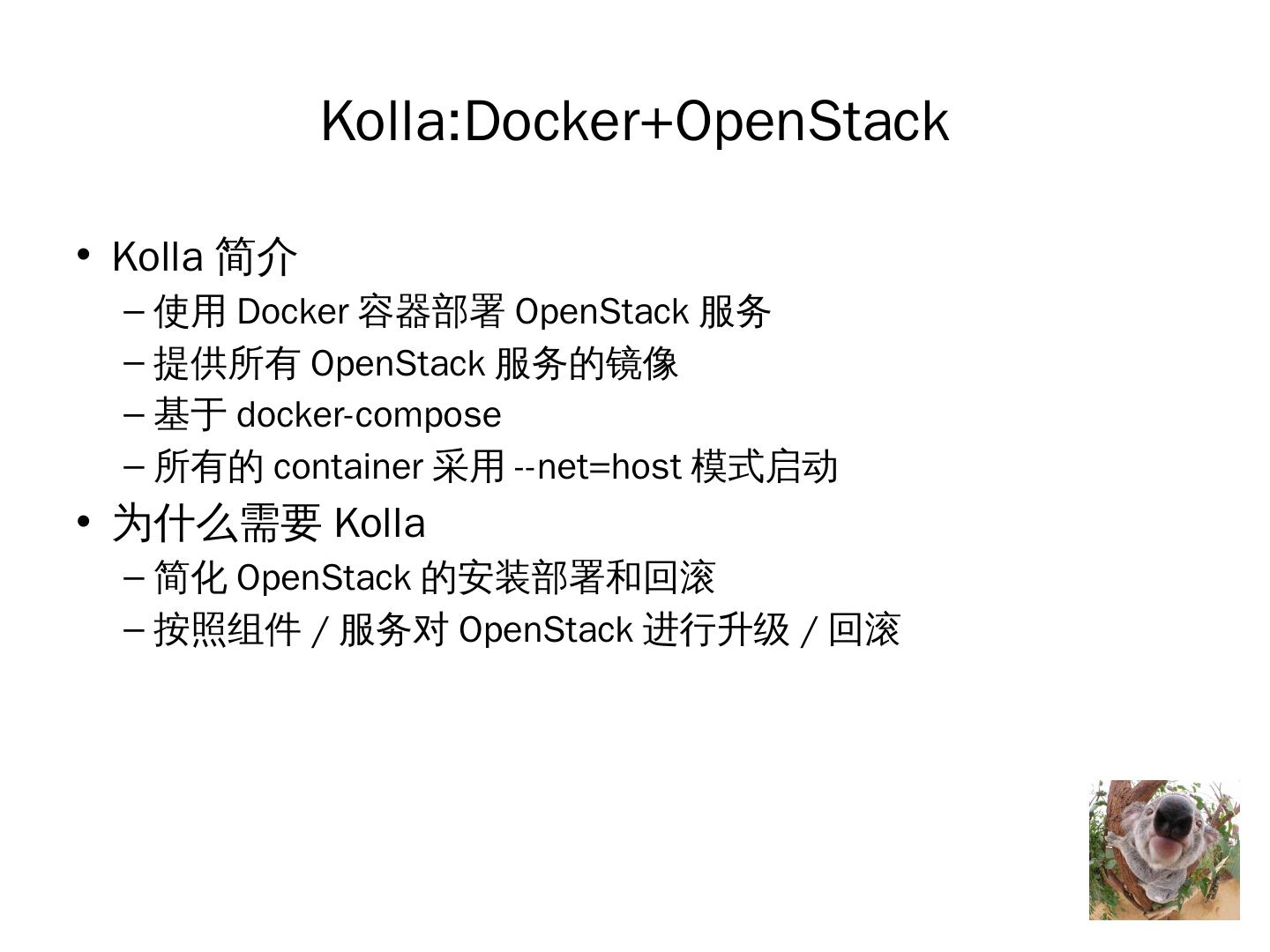 Kolla: Container Everything. OpenStack As Layers. Nova. Glance. Keystone. 计算. 镜像. 认证. Layer1: 基础设施层. Cinder. Swift. Neutron. 块存储. 对象存储. 网络.
